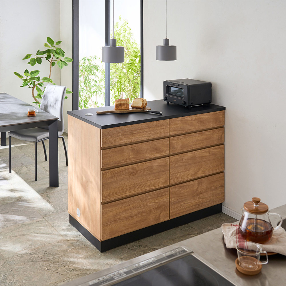 • (ウ)オーク/ブラック 置くだけで会話が弾むアイランドキッチンに。 ※写真は据え置きタイプ幅120cm高さ95cmです。