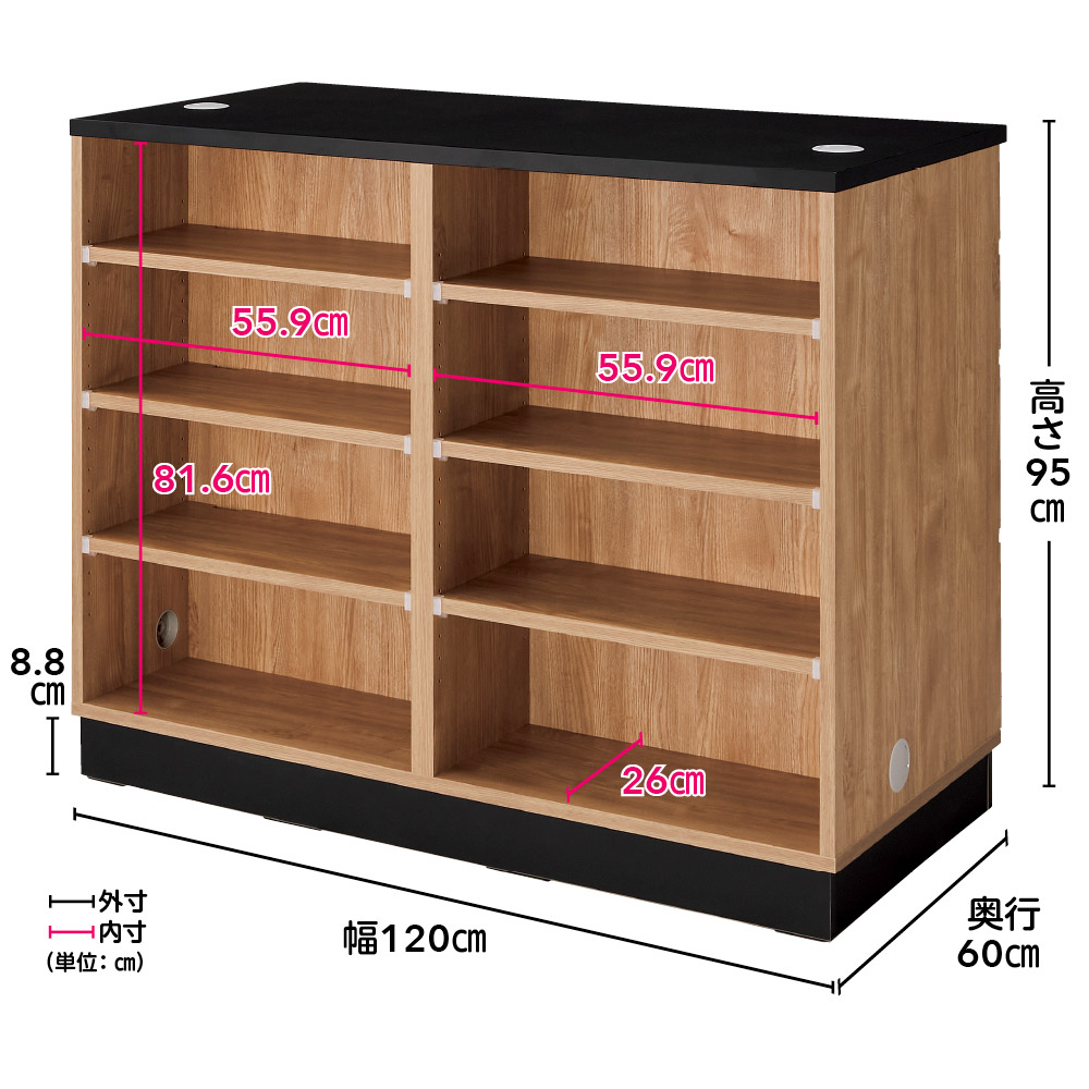 【オープン側】(ウ)オーク/ブラック 天板と側面下部のそれぞれ左右にコード穴があり、調理家電の配線にも便利です。 (単位:cm) ※写真は据え置きタイプ幅120cm高さ95cmです。