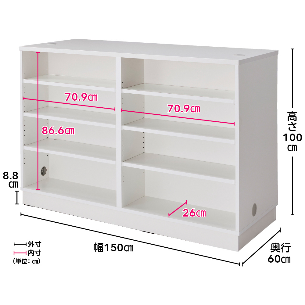 • 【オープン側】(ア)ホワイト 天板と側面下部のそれぞれ左右にコード穴があり、調理家電の配線にも便利です。 (単位:cm) ※写真は据え置きタイプ幅150cm高さ100cmです。