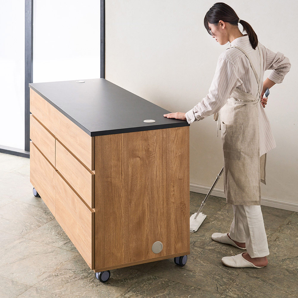顔が見えると会話が弾む。憧れのアイランドキッチンが置くだけで完成します。食事の支度や片付け中も家族と向かい合っていられるから、みんなが楽しいキッチンに。使い勝手のよい幅120cmで、両面に棚や引き出しがたっぷり。身長に合わせて選べるよう、高さも5サイズをご用意しました。移動しやすいキャスター付きです。