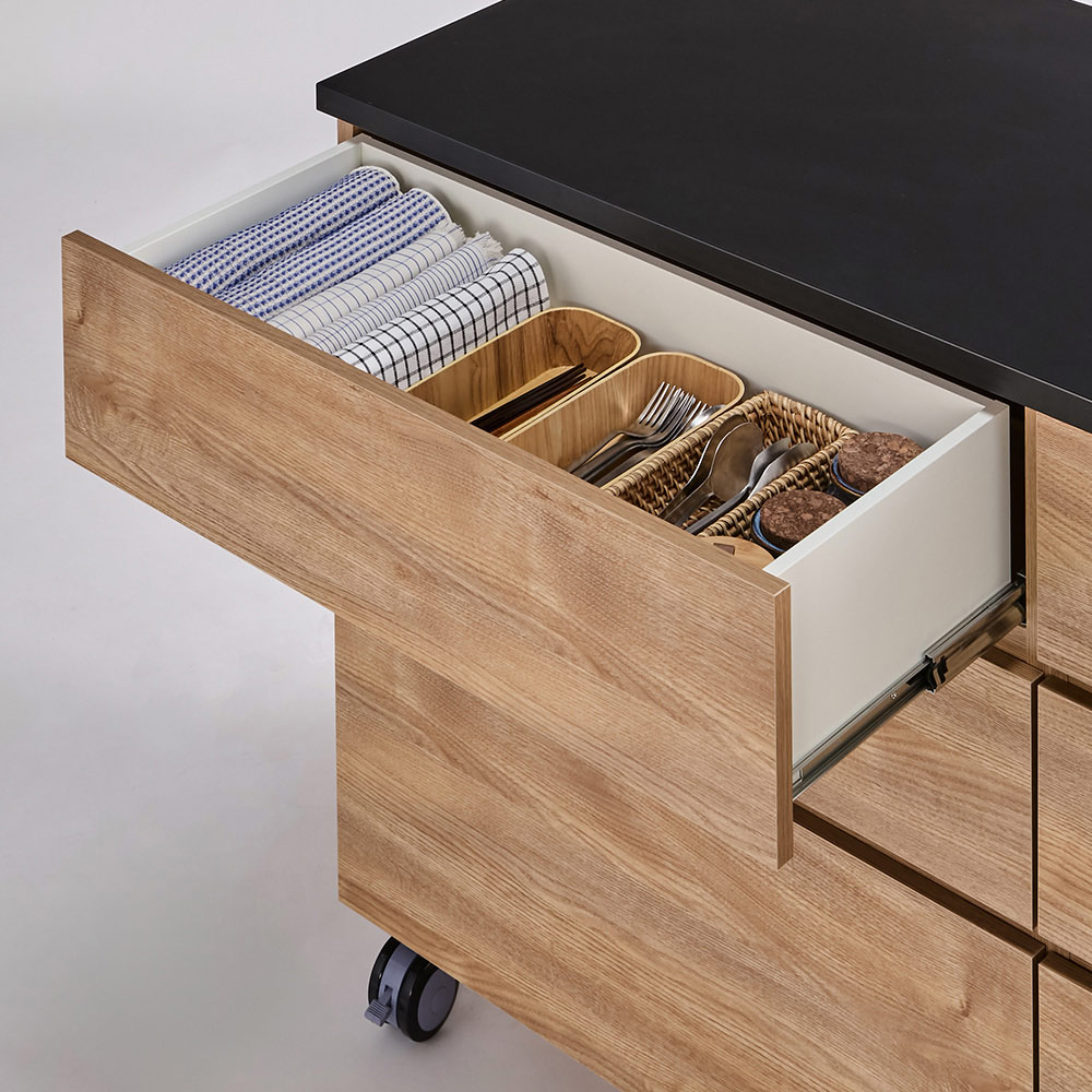 【引き出し側】カトラリーや食器、食材の収納に便利な引き出しは、奥のものまで取り出しやすい全段フルスライドレール付き。