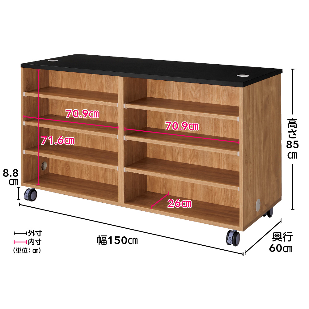 【オープン側】(ウ)オーク/ブラック 天板と側面下部のそれぞれ左右にコード穴があり、調理家電の配線にも便利です。(単位:cm) ※写真は移動式キャスタータイプ幅150cm高さ85cmです。