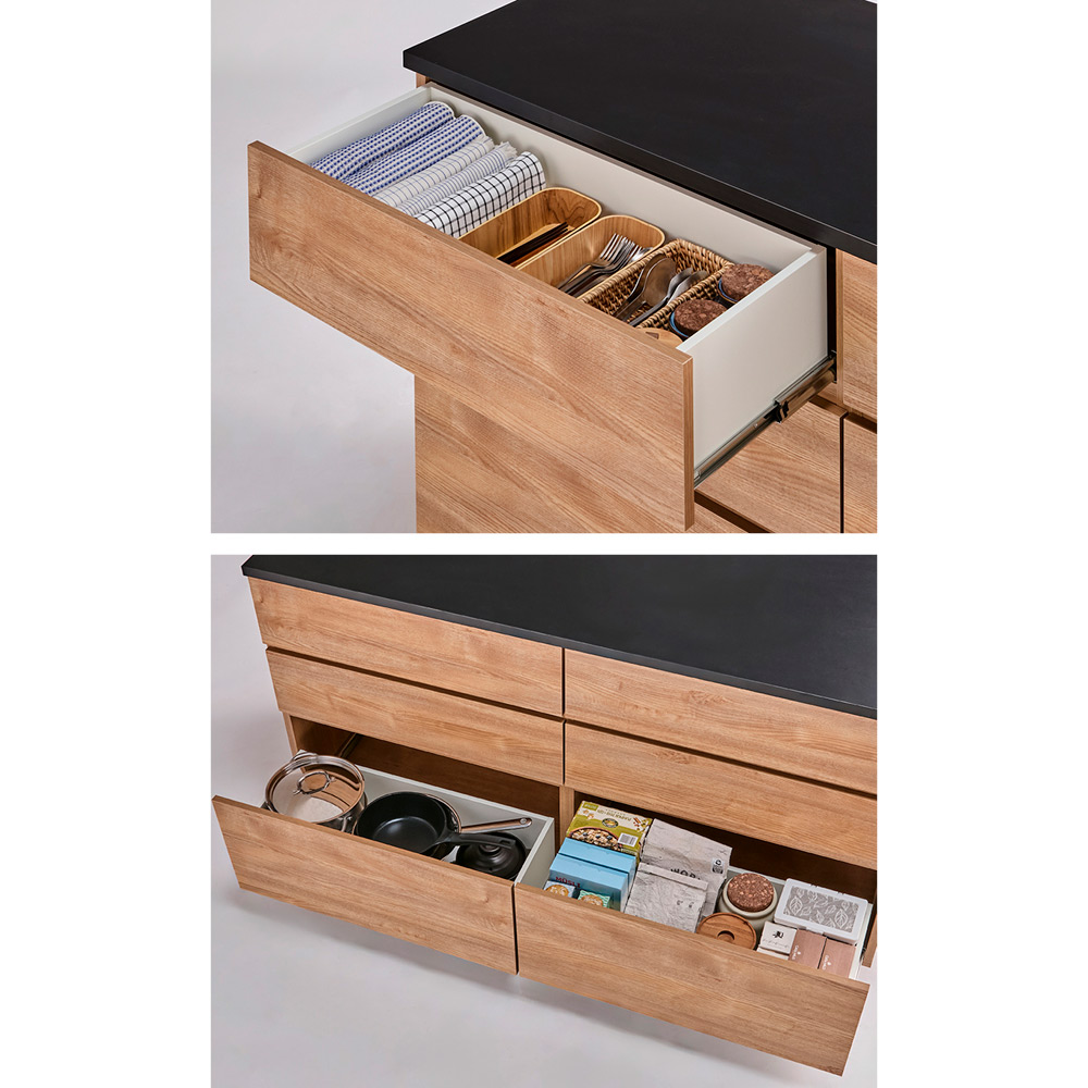 (ウ)オーク/ブラック 片側は引き出し収納。反対側はオープン収納と、用途に合わせて2つの機能を持つアイランドカウンターです。 ※写真は移動式キャスタータイプ幅150cm高さ85cmです。