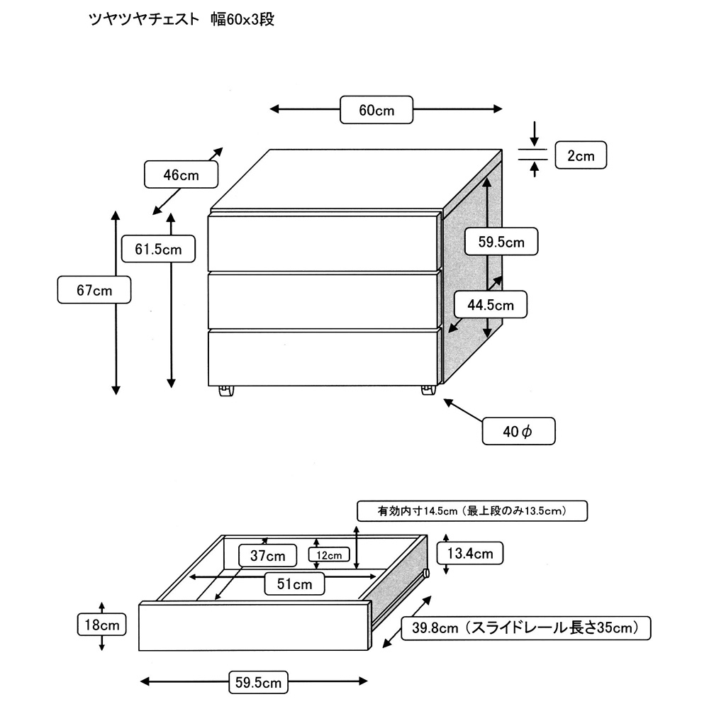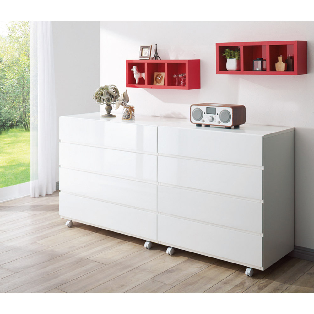 つやつやと美しい高級家具のような光沢感が、インテリアとしても映えるチェスト(タンス)。スライドレールで、たっぷり収納しても開け閉めがスムーズ。光沢ホワイトと光沢ブラックの2色ご用意!美しい光沢が高級感を演出する、クローゼットはもちろんリビングにもおすすめのローチェスト(タンス)です。天板は水や汚れに強いポリエステル化粧合板を使用。お手入れ簡単なのでランドリーチェストやサニタリーチェストとしても。キャスター(2個ストッパー付き・取り外しても使用可能)を少し内側に取り付けることで目立ちにくくし、よりすっきりとしたデザインに仕上げました。引き出しは全段ストッパー付きスライドレール&底板しっかりの頑丈な造りで、衣類をたっぷり収納可能。引き出し内部に金具が出っ張らない、衣類にやさしい構造です。光沢のあるブラックはお部屋をスタイリッシュに演出します。かっこいいチェストを求める方に是非オススメ!ファミリーでも一人暮らしでもご利用いただける衣類収納家具です。
