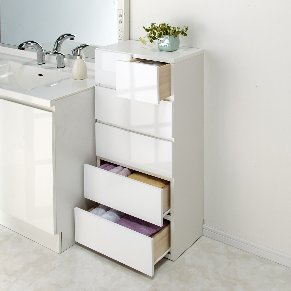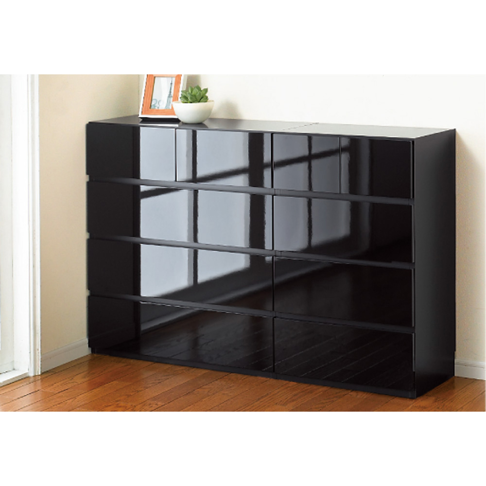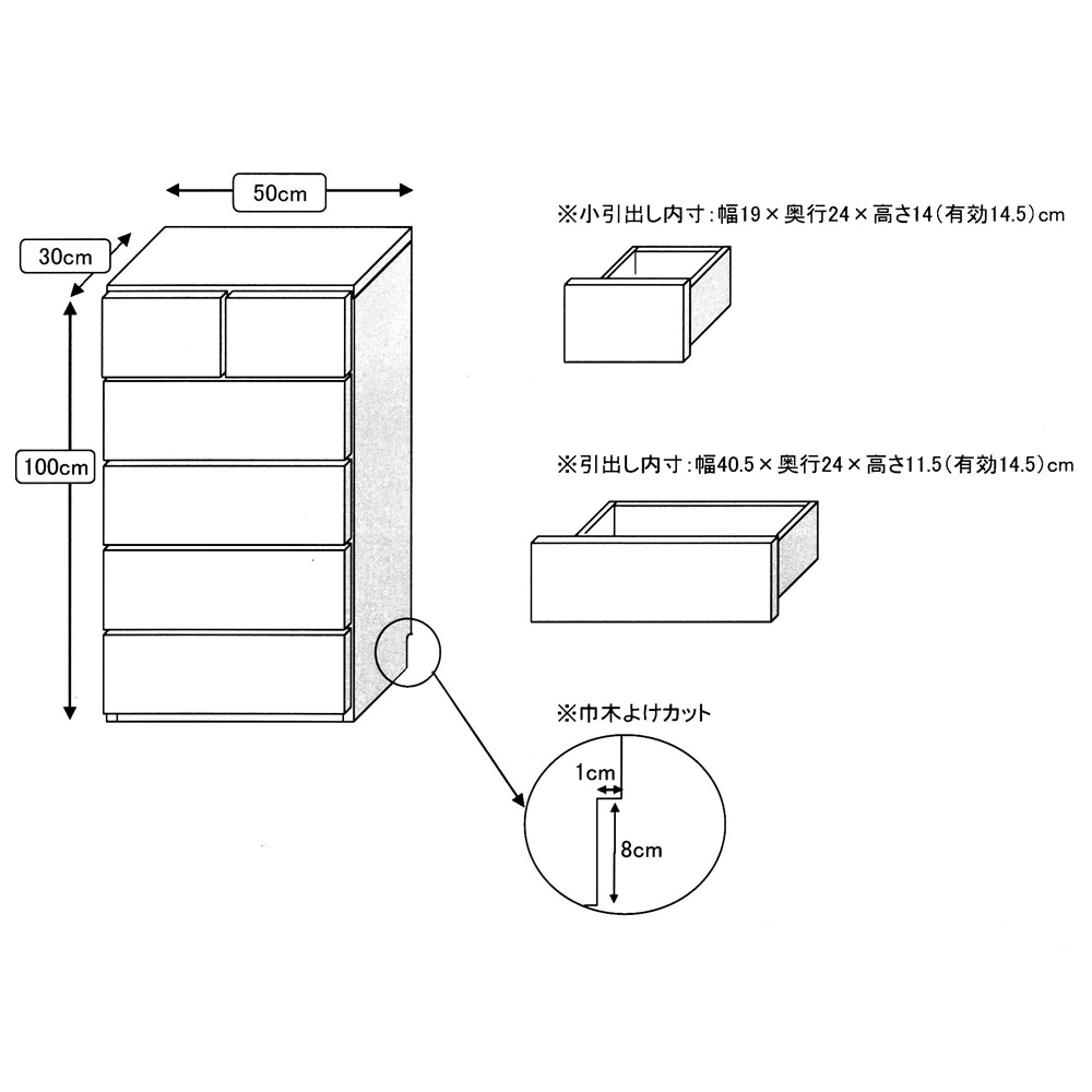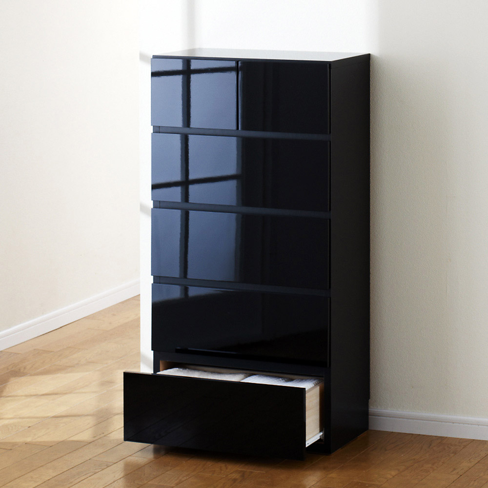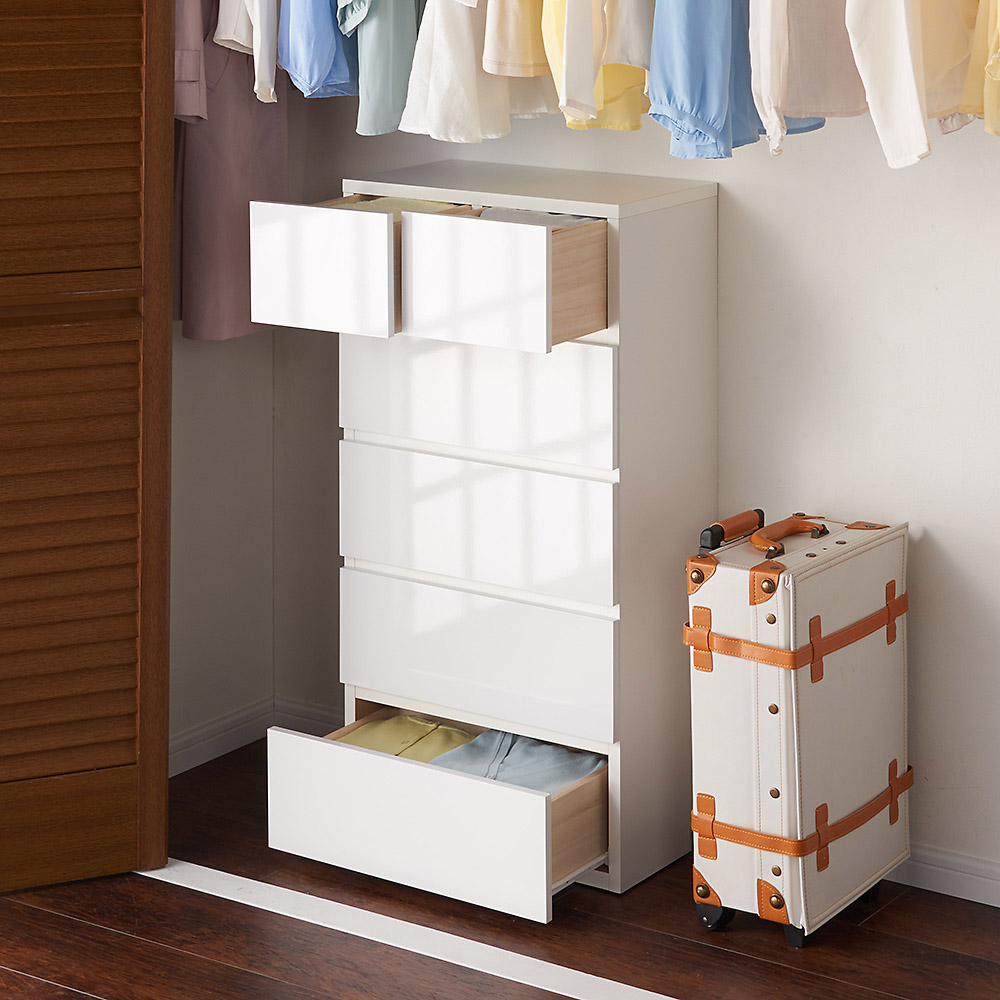 奥行30cmの薄型収納だから狭いスペースでも活躍の衣類収納タンス! つやつやと美しい高級家具のような光沢感が、インテリアとしても映えるチェスト(タンス)。光沢ホワイトと光沢ブラックの2色ご用意!美しい光沢が高級感を演出する、クローゼットはもちろんリビングにもおすすめのハイチェスト(タンス)です。天板は水や汚れにも強いポリエステル化粧合板を使用。お手入れ簡単なのでランドリーチェストやサニタリーチェストとしても。奥行が30cmという薄型の収納家具ですので、狭い廊下などのスペースやお部屋に圧迫感を与えたくない人に是非オススメです。幅木避け対応していますので壁にピタッと設置できるのもうれしいポイントです。引き出しは、分類収納が衣替えのコツ。引き出しは、収納する物に合わせて分類するために、小引き出しと大引き出しの2種類を備え、大引き出しはストッパー付きスライドレールを取り付けることで開閉がラクラクできるようにしました。また、衣類などをたっぷり収納できるように頑丈な箱組仕様を採用し、裏面にも補強を施し、引き出し強度をUPしました。さらに、引き出しの間にはすき間をなくし、ホコリが入りにくくなると同時に、本体強度もUPさせる補強板を入れました。幅サイズは50・75・100の3タイプ、段数も4〜6段の3タイプで合計9種類!色はホワイトとブラックの2色!!光沢のあるブラックはお部屋をスタイリッシュに演出します。かっこいいチェストを求める方に是非オススメ!ファミリーでも一人暮らしでもご利用いただける衣類収納家具です。
