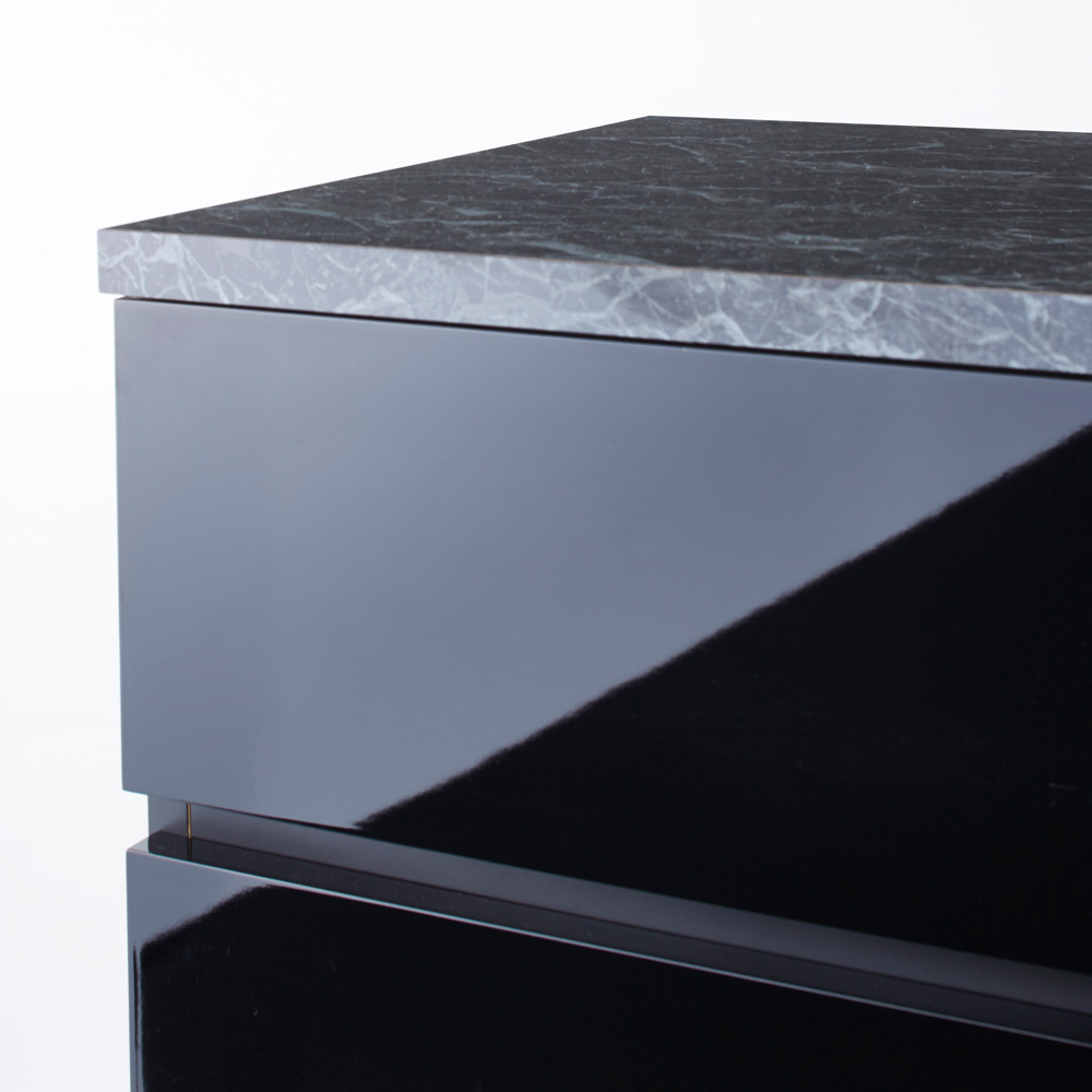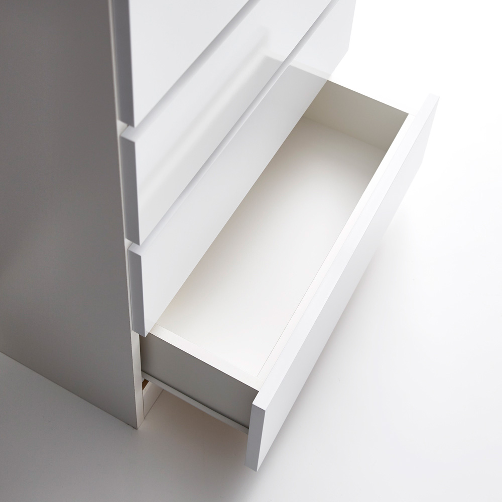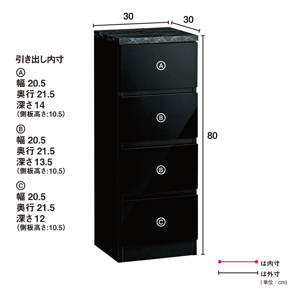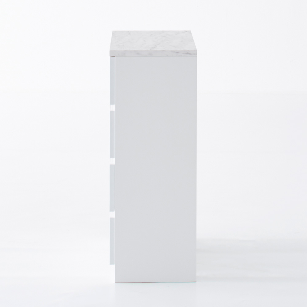 前面はつややかな塗装仕上げで、天板は大理石調メラミンの高級感溢れるサニタリー収納。熱や水に強く耐久性のあるメラミンシートだからチェストの上にメイク用品やドライヤー等を置いても安心。シンプルモダンなデザインも特徴です。洗面所や脱衣所で使いやすい収納力と都会的なデザインを兼ね備えたチェスト●狭い洗面所やバスルームに適した奥行30cmタイプと大容量収納の奥行45cmをご用意。●幅は30/45/60cmから選べるので限られたスペースを有効活用できます。●清潔感のあるホワイトと高級感のあるブラック色の2色からお選びいただけます。●塗装仕上げだからこそ実現する美しいつや感はモダンで高級感溢れる洗面所を演出します。●意外と人目にふれる洗面所だからこそエレガントで高級感ある収納家具がおすすめです。ポイント(1)大理石調天板の機能とデザイン●大理石調メラミン素材は最新のシステムキッチンにも使用されている人気素材です。●その魅力は「水に強い」「汚れに強い」「熱に強い」。●洗面化粧台や洗濯機まわりの洗剤や化粧品などがこぼれても問題ありません。●熱にも強いのでヘアアイロンを直接置いても大丈夫です。ポイント(2)引き出しはスライドレール付きで開閉がスムーズ&化粧仕上げ●引き出しは出し入れがしやすいので毎日のストレスがありません。●収納場所に困るタオル収納にぴったりです。●お風呂上りの脱衣所の衣類収納としてもおすすめです。●引き出しの内部はすべて化粧仕上げなので衣類やタオルを収納しても安心です。ポイント(3)洗面所はもちろんキッチン収納でも使えるチェストタイプです●熱や水に強く耐久性のあるメラミン天板なので水回りの収納やダイニングキッチンでも使用できます。●日本の住環境に、生活スタイルに合わせやすい機能美チェストです。●日本製ならではの気遣いが詰まったディノスで人気の商品です。