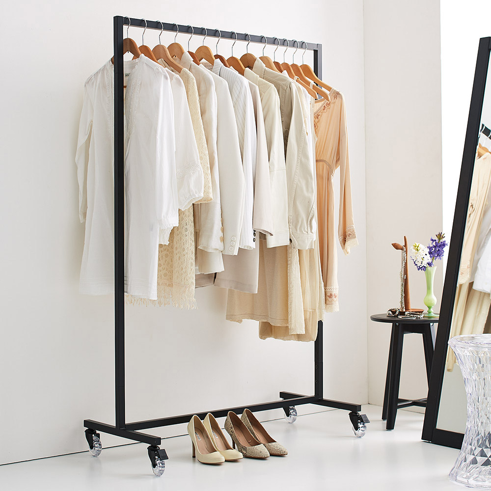 (ア)ブラック 角パイプをスクエアに組んだモダンデザイン。ハンガーのズレ落ちを防止できます。