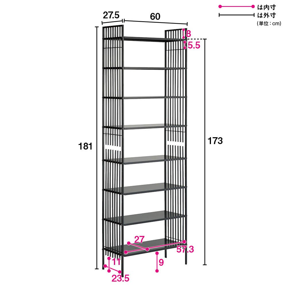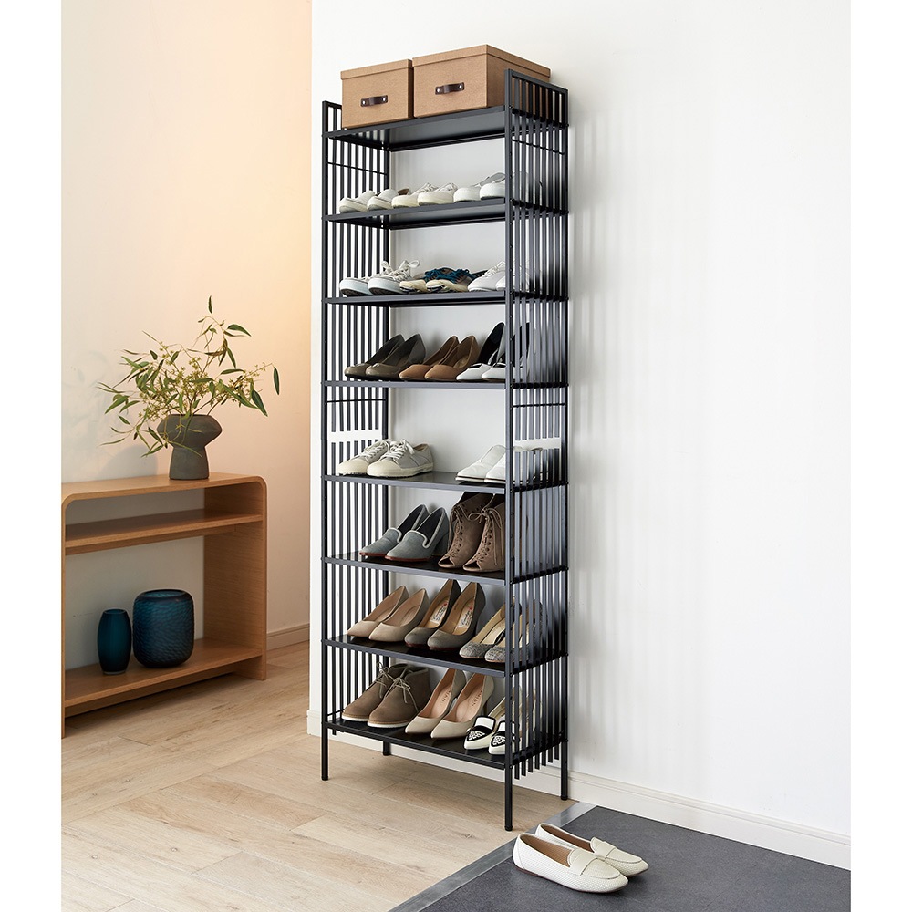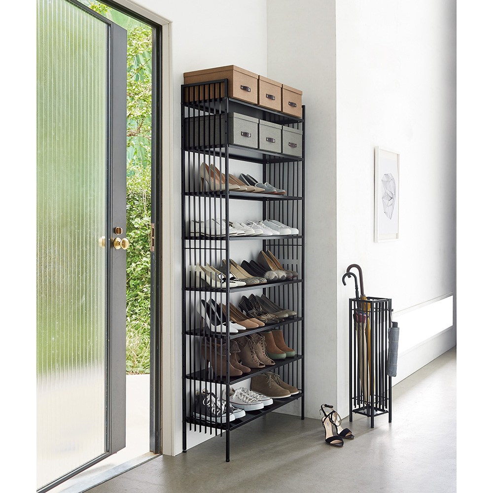 すらりとした鉄格子が凛とスマート。靴や傘をさり気なく目隠ししながら、洗練されたホールウェイを演出します。格子のラインが美しい和モダンなデザインのシューズラック■格子のサイドラインは単なるデザインだけでなく、目隠しにもなるこだわり設計です。■シックな印象のマットブラックのスチールフレームがシンプルモダンな印象。スタイリッシュな玄関まわりを演出します。■スチール製のフレームは汚れてもお手入れが楽です。毎日出し入れするものだからこそ使いやすさを考えたアイデアがたくさん■おしゃれな玄関インテリアを演出するシンプルですっきりとしたデザイン。■薄型でシャープな見た目ながら安定感のある強度を備えたつくり。■棚板は8枚付きで5cm間隔で調節できます。■棚板はフラットなスチール製だから小物類や靴箱の収納にも便利です。奧行の浅い省スペース設計■限られた玄関スペースでも安心して設置できます。■アジャスター付きなのでガタつきも防止できます。◆婦人靴を3足横に並べて収納できる幅60センチタイプ、4足並べることのできる幅80cmタイプの2種類からお選びいただけます。