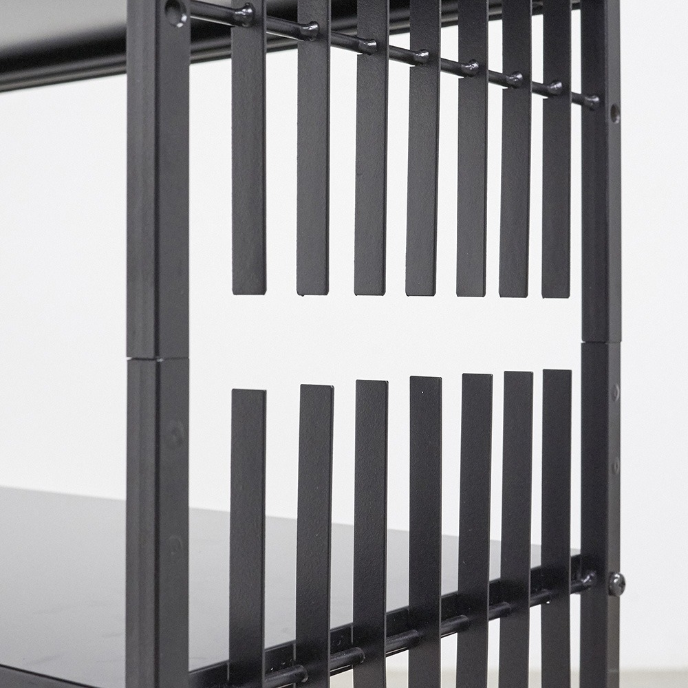 ブラックのシャープな格子柄がすっきりとした印象を与えるシューズラック。細身のストライプの線が縦に長く、天井を高く見せる効果も。