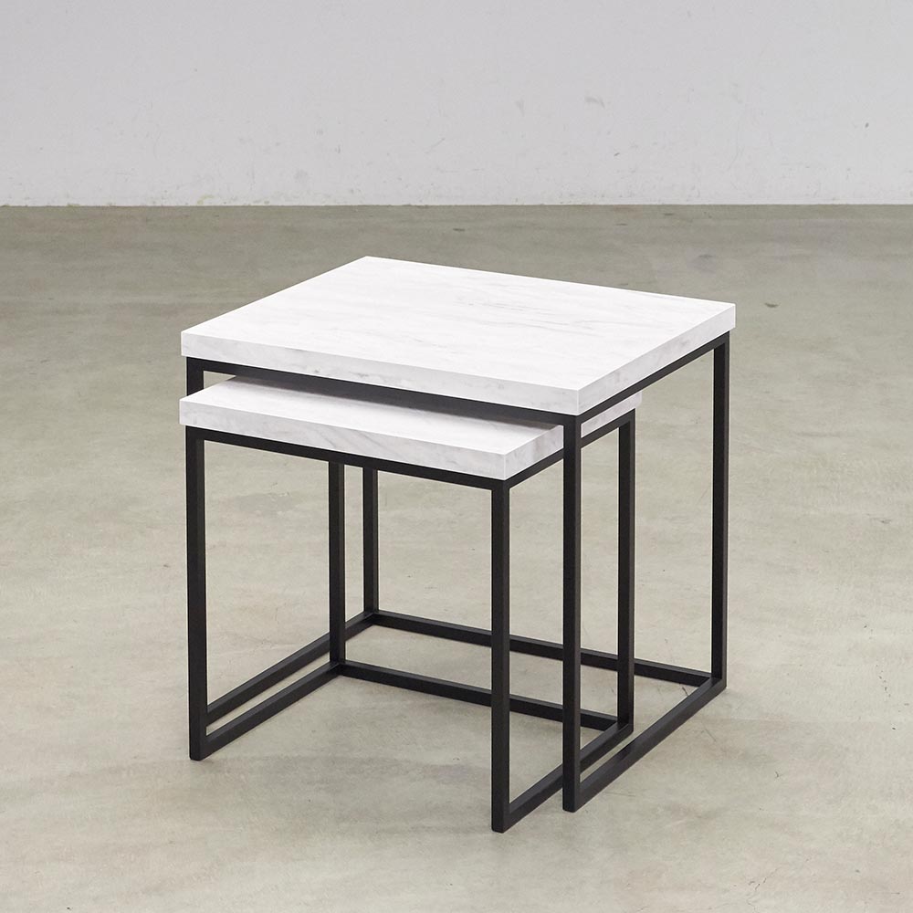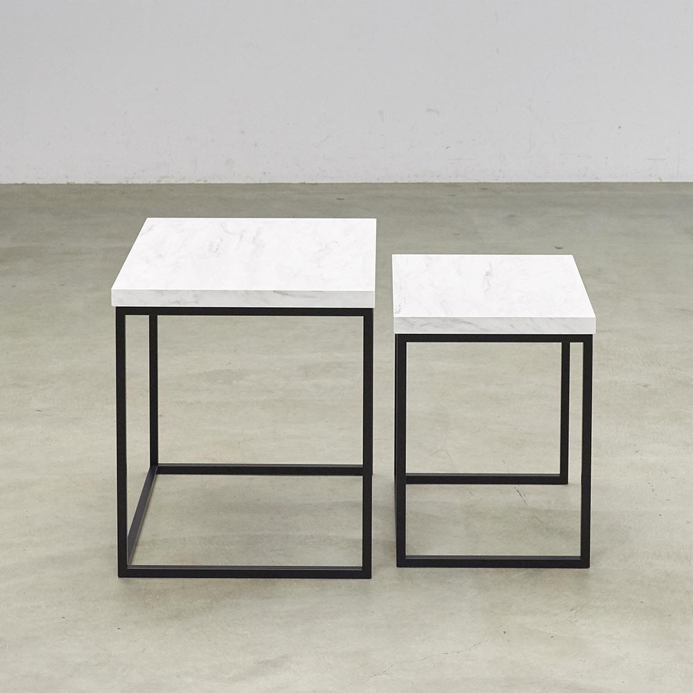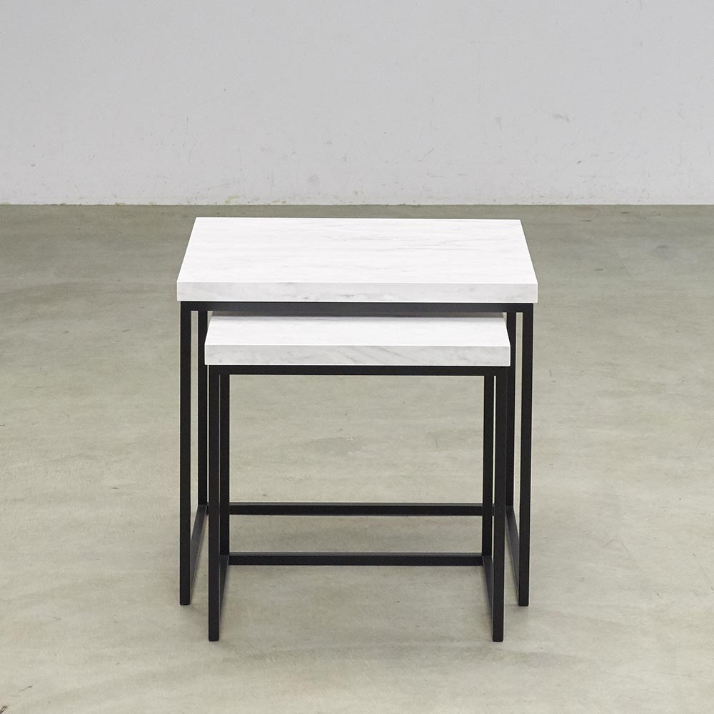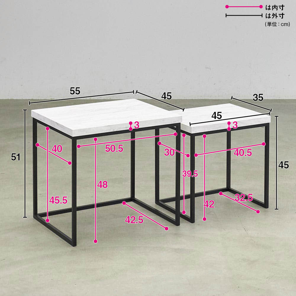 グラマラスな質感が美的空間へクラスアップ。気持ちも華やぐホワイトの大理石調天板を用いて、ネストテーブルに仕上げました。丁寧な作りと高級感あるボリュームが、リビングをより魅力的な空間へ。入れ子式だから、広げて・縮めて自由自在普段は重ねてコンパクト、必要な時は広々使える入れ子式。広げてワイドに、重ねてコンパクトに収納できるネストテーブルに仕上げました。ゲストが増えた際にもフレキシブルに対応。限られたスペースにもおすすめしたい、空間を有効活用するアイテムです。大小2点セットでお届けします。白と黒のコントラストがシックな輝きを添えてシンプルながら、石目調の天板とブラックスチール脚。2つの素材のコントラストがシックな輝きを添えます。お洒落でモダンな大理石調の天板が、印象的な空間を演出します。使い方もフレキシブル高さ大:51cm、小:45cm。ソファサイドやベッドサイドにちょうど良いサイズ。コーヒーテーブルとして、または寝室でリーディングライト置きとして。〜熟練の職人が丹精こめて生産しています〜熟練の家具職人がひとつずつ丁寧に仕上げたワンランク上の国産家具です。デザイン・仕様など細部に至るまでこだわりました。ハウススタイリングが自信を持ってお勧めする日本製のディノス家具です。届いたらすぐ使えるのが嬉しい完成品本体は組立不要。脚を取り付けたら届いたらすぐ使えるのが嬉しい完成品でお届けします。