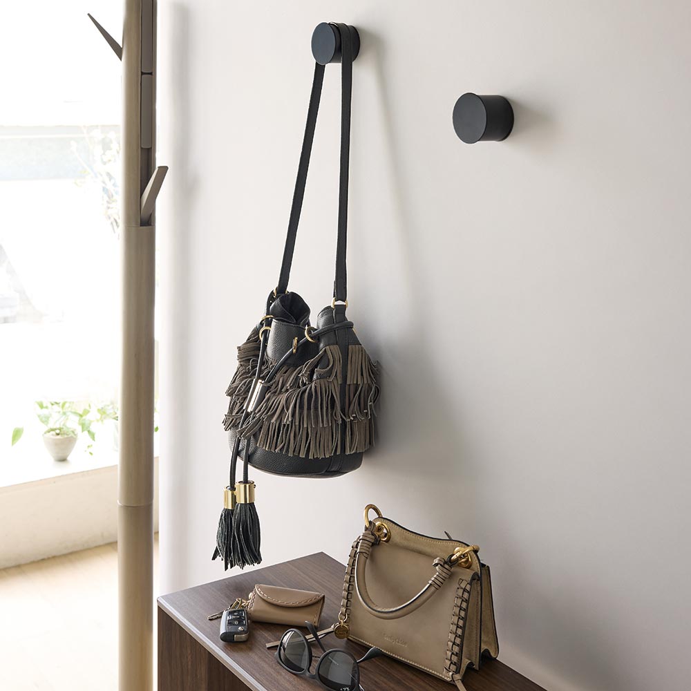 大切なバッグの取っ手に跡をつけない丸型フック。何も掛けていない時すらアートのように壁面を演出します。