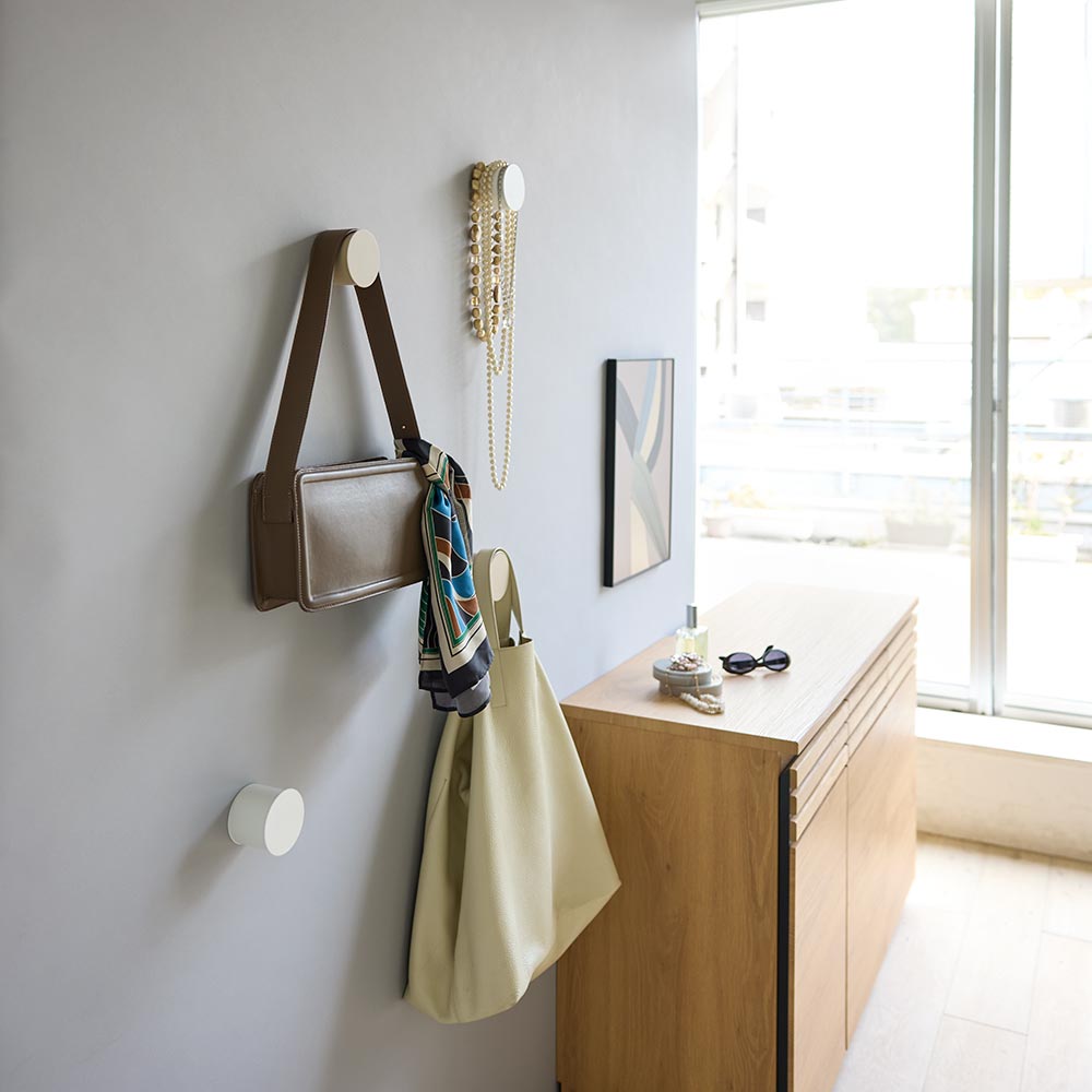 ピンで留めるだけなので複数を壁につけて壁掛け収納を生み出せます。バッグだけでなく傘やスカーフ、大振りのネックレスまで。よく使うものは手に取りやすく朝の身支度も楽に。