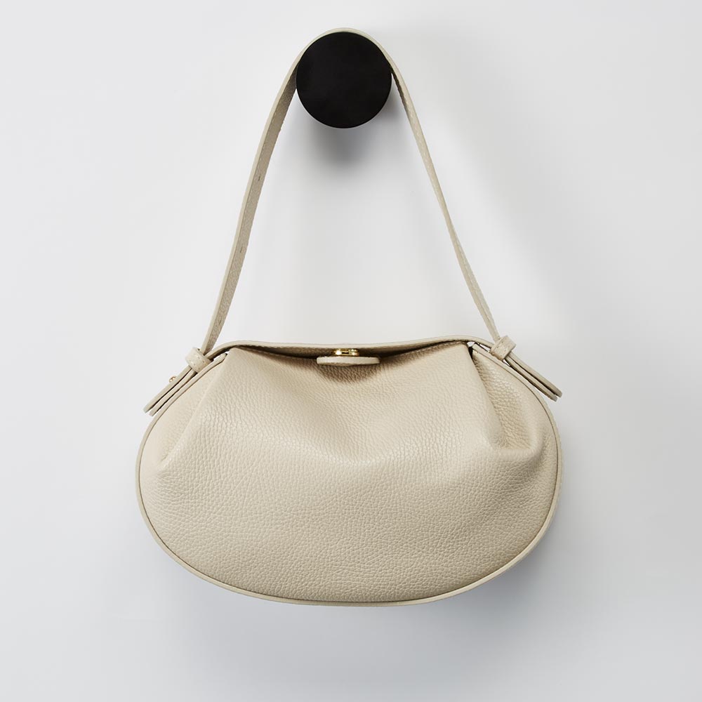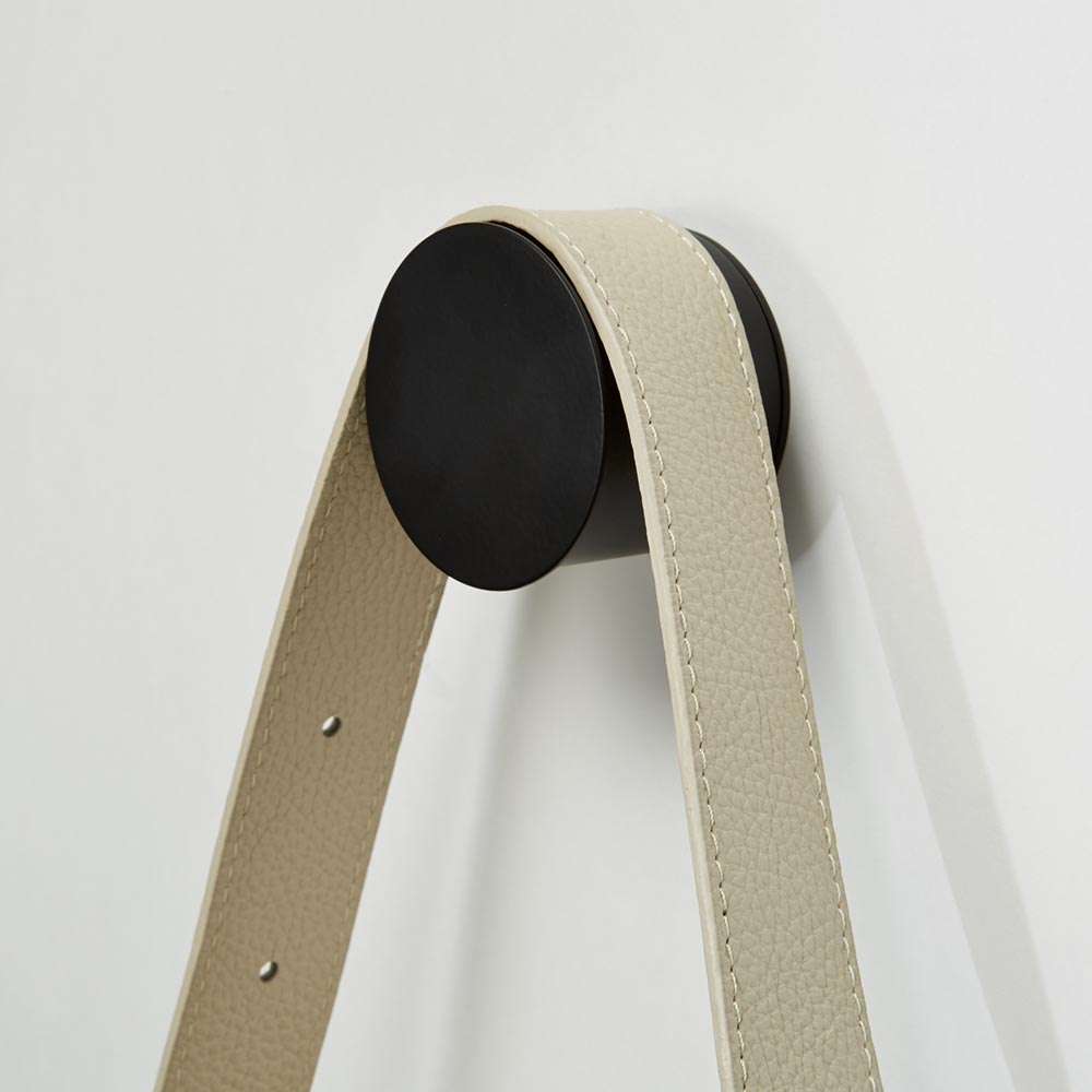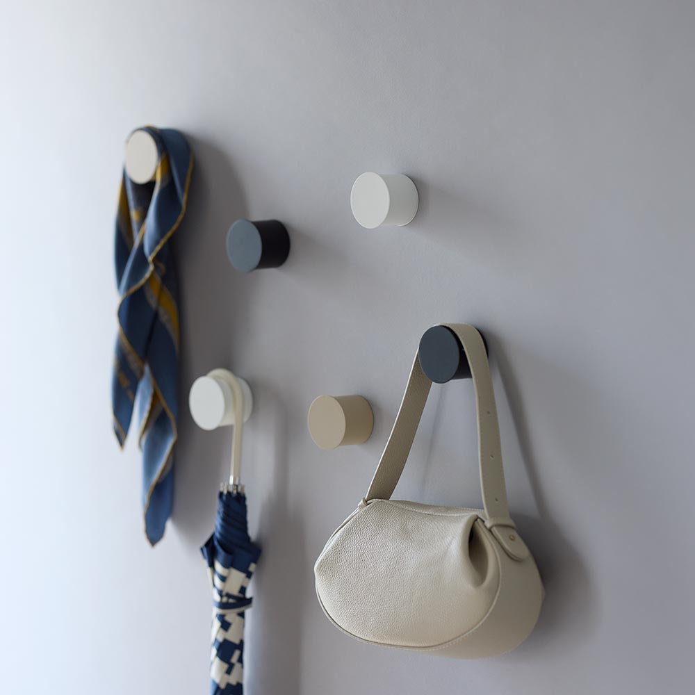 大切なバッグの取っ手に跡をつけない丸型フック。何も掛けていない時すらアートのように壁面を演出します。大切なバッグの取っ手に跡をつけない丸型のバッグ用フックS字フックなどにかけるといざ使う時にハンドル部分に跡が付いていることも。丸型のフックでバッグのハンドルに跡がつきにくく収納が可能に。好きな場所にピンで簡単に取り付ければ収納が完成です。よく使う玄関にはもちろん、ドレスルームや寝室の身支度空間にぴったりです帰宅前後の玄関には、床やチェストに置かずにバッグをかけることが可能です。新たな収納場所を簡単に生み出せます。ドレスルームやウォークインクローゼット、寝室の身支度場所などにもぴったり。空いている壁にランダムに取り付けて、お出かけのバッグを選ぶのも楽しく。画像のような底にフリンジの付いたバッグを美しく保つのにもおすすめです。女性の肩に沿うサイズをイメージして企画された丸型普段女性の肩にバッグが掛けられているサイズ感をイメージして企画されました。ハンドル部分がなだらかにかけられるので、S字フックに長時間かけてしまったときに付いてしまうような跡が付きません。奥行約5cmで幅のあるバッグの取っ手も満足してかけられますトレンドの幅広のバッグの取っ手も満足にかけられます。フックの正面部が若干大きく作られており、かけた時に落ちないようになっています。ピンで固定するだけでとても簡単な設置取り付けはピンで土台部分を壁に固定するだけ。土台にフック本体をくるくる回して設置が完了します。とても簡単に収納を増やせます。取り外しも簡単。跡がつきにくいピンなので嬉しい簡単に取り外しができて、配置を変えるのも楽にできます。ピンは3点で留めるもので小さい穴なので、賃貸でも設置いただけます。バッグフック1個の付属品2個でお得なセットも販売しています。土台の穴にピンを2つ取り付ける形で設置いただけます。詳しい取り付け方は動画もチェック。壁を飾るようにコーディネートを楽しむ3色のカラー展開。ランダムに配置すれば飾るように配置が可能です。傘やスカーフなどバッグ以外をかけるのにもぴったり。革のフックがアイテムなども同様に跡がつきにくいです。空間に新たな動き・彩りができるバッグ収納バッグを置いている場所やコートハンガー、姿見の近くなど、取り付けると意外と便利。ぜひ取り入れてみてください!