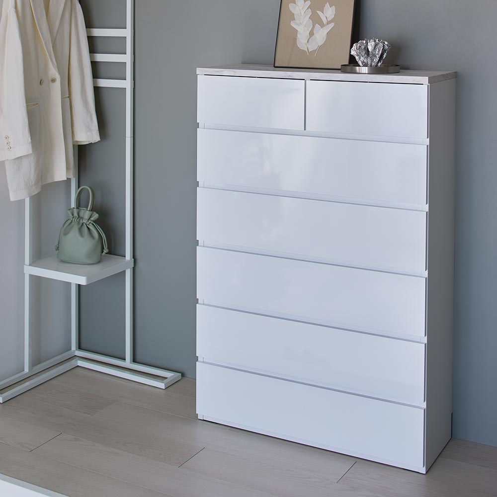 前面はつややかな塗装仕上げで、天板は大理石調メラミンの高級感溢れる収納チェスト。奥行30cmの省スペース設計なので寝室だけでなく、玄関や廊下にもオススメの商品です。廊下や狭いスペースでも使いやすい薄型チェスト●玄関や廊下、スペースの取れない寝室等、限られたスペースでもOK。●奥行30cmながら、収納力も兼ね備えています。●高級感のある配色で、リュクスな空間を演出。●ホワイトを基調にしているので、圧迫感が出にくい仕様です。●人目にふれる場所にはエレガントで高級感ある収納家具がおすすめです。ポイント(1)大理石調天板の機能とデザイン●大理石調メラミン素材は最新のシステムキッチンにも使用されているグレードの高い素材です。●デザイン性もさることながら、丈夫な素材なので汚れにくいのも魅力。●水しぶきが気になる洗面所にもオススメの収納です。●熱にも強いのでヘアアイロンを直接置いても大丈夫です。ポイント(2)引き出しはスライドレール付きで開閉がスムーズ&化粧仕上げ●引き出しは出し入れがしやすいので、毎日のストレスがありません。●衣類収納としてはもちろん、リネン類の収納としてもお使いいただけます。●サニタリー空間のタオル収納としてもおすすめです。●引き出しの内部はすべて化粧仕上げなので衣類やタオルを収納しても安心です。ポイント(3)収納量に応じて選べるサイズ●幅は60cm・80cm・100cmの3タイプ。●高さは5段・6段なので、計6サイズからお選びいただけます。●日本製ならではの気遣いが詰まったハウススタイリング企画の商品です。