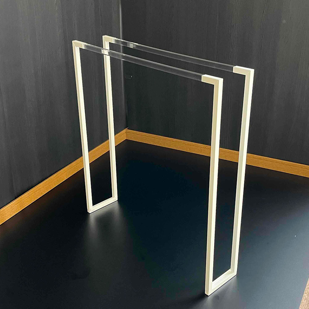 美しく輝く透明のアクリルと、真っ白なスチールを組み合わせた、おしゃれで清潔感のあるバスタオルハンガー。生活感を感じさせないデザインで、こだわりのインテリアに美しく調和します。奥行15cmとスリムなので狭い脱衣所やリビングにも、圧迫感なく置けます。モダンなインテリアにもマッチする高級感のあるデザインです。モダンでスタイリッシュな印象なので、こだわりのインテリアにも生活感を出さずに置くことができます。タオルをかけているだけで画になるビジュアル!脚元があいてるスッキリデザイン。余分な装飾がなく、機能的な美しさが特徴の北欧調のインテリアとも相性のよいデザイン。透明アクリルとホワイトの色調も、明るい室内にピッタリです。脚元が広くあいているので、バスマットをまたぐように置いたり、下に体重計やスリッパなどを置くこともできます。バスタオルは横からスライドさせてラクに掛けられます。サイドから差し込むように掛けられるので、必要以上にタオルを持ち上げなくてもOK。使い勝手に配慮したら、美しいデザインになりました。同シリーズの折りたたみ物干しと素敵にコーディネートできます。生活感を感じやすい実用品こそ、デザインにこだわって。毎日使う物干しやタオルハンガーが素敵なら、面倒だったお洗濯の時間が楽しみになりそう。