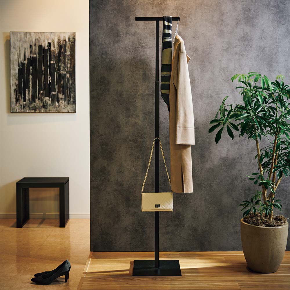 洋服だらけで部屋が散らかってしまう…今使っているハンガーラックに不満がある…そんなお悩みをお持ちの方におすすめの、頑丈さと仕上げの美しさが融合した国産プロ仕様頑丈ハンガーラック。玄関やベッドサイドなどのちょっとした空間も、収納をサポートしながらスタイリッシュに演出できるT型ハンガーラックです。おしゃれな生活に捧げる、ディノス「収納の極み」国産ストロングハンガーラック日本の匠の技術が詰まった製品で、快適で美しい生活をサポートします。価格はやや高めですが、使い捨てではなく安心して何年も長く使える商品を提供し、地球にも優しい生活をご提案します。細部まで丁寧な仕上げとおしゃれなデザインと頑丈な品質が調和し、洋服の収納に悩む方々におすすめのハンガーラックです。【ポイント1】 デザインに頑丈さと仕上げの美しさをプラス・国産ストロングハンガーラックは、マットなブラック塗装と滑らかな溶接で、洋服を引き立てながらインテリアを邪魔しません。・高級感あるモダンデザインと収納のしやすさや頑丈な品質により、おしゃれな生活と長期間の利用が可能です。・日本製でプロ仕様に仕上げた頑丈ハンガーラックです。・ものづくりのまち燕三条の金属加工職人ならではの滑らかな細部の仕上げ。・TIG溶接は高性能な溶接方法で、金属の素材同士を強固に結合させることができ、美しい仕上がりと耐久性を実現。・メラミン焼付塗装は洋服を引き立てるマットな質感で、傷に強く高級感とシンプルなデザインが融合し、上品な雰囲気をお部屋に与えます。【ポイント2】ミニマルで端正な佇まい。ブティックのように洗練された収納を日常に・お客さまをお迎えする場であり、家族が帰る場であり、幸運の入り口ともいわれる玄関。家の印象も左右する大切な場所だから、コート掛けにもこだわってみませんか。国産ストロングハンガーラックなら、置くだけで上質な空間にイメージアップできます。・リビングのちょっとした空間にも置ける省スペース設計。ソファや椅子の背についちょい掛けしてしまいがちな上着などは、このハンガーラックを指定席にすれば、お部屋はいつもすっきりした状態をキープできます。・寝室では、お気に入りの服やバッグを飾る気分で。翌日のコーディネートをまとめておけば、朝の身支度の時短にもなります。・1人で持ち運びできるので、その時置きたい場所への移動も簡単です。【ポイント3】無駄のないデザインの中に使いやすさの工夫も・高さ10cm間隔4段階に調節できるので、大人からお子さままで使いやすい高さに調節可能。・バーの先端には段差をつけ、ハンガーのズレ落ちを防止。・中段のフックにはバッグやリュック、マフラーなどの小物も掛けられます。・ベースは幅30cm×奥行30cmで安定した造り。バッグなどの置き場としても。・ベース裏面は床の傷つきを防ぐフェルト貼りを施しています。【ポイント4】安心の本体耐荷重15kg・第三者公的機関の厳しい試験をクリア(※表記耐荷重の2倍の負荷をかけて実施)。・一般的なハンガーラックよりも肉厚な1.6mmのスチール製角パイプとビスで高さ調整穴にしっかり固定するので、洋服をたくさん掛けてもたわんだり歪んだりしにくい仕様です。【ポイント5】Made in TSUBAME(メイド・イン・ツバメ)の証を持つ高品質な製品新潟県の燕商工会議所では「メイド・イン・ツバメ」認定委員会が商品の原産地と品質安全性を確認し、認定しています。製造は燕市創業の金属加工メーカーABEKIN。高い技術力とデザイン性でオフィス家具や店舗什器などを手がけています。使う人のことを想い、丹精込めて製造された商品であることを示す安心と高品質を保証するマークです。ものづくりのまち燕三条エリアは、地元の優れた金属加工技術で、家庭用品から半導体、液晶、医療機器、自動車、航空宇宙などにかかせない部品を製造し、世界のものづくりを陰から支えています。