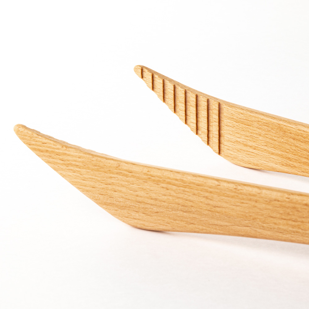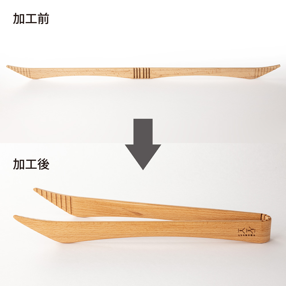 桐だんすに使われる「挽き曲げ」の技術により、一枚板をトングの形状に加工しています。
