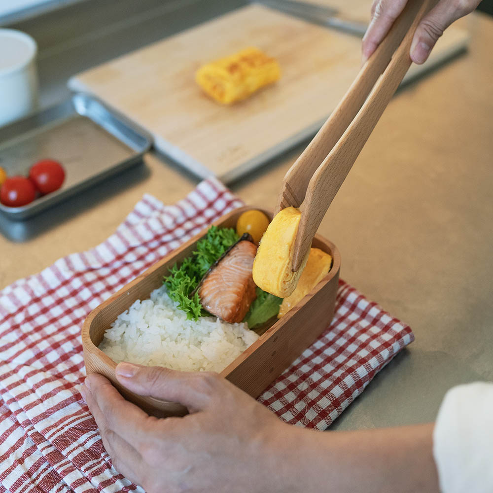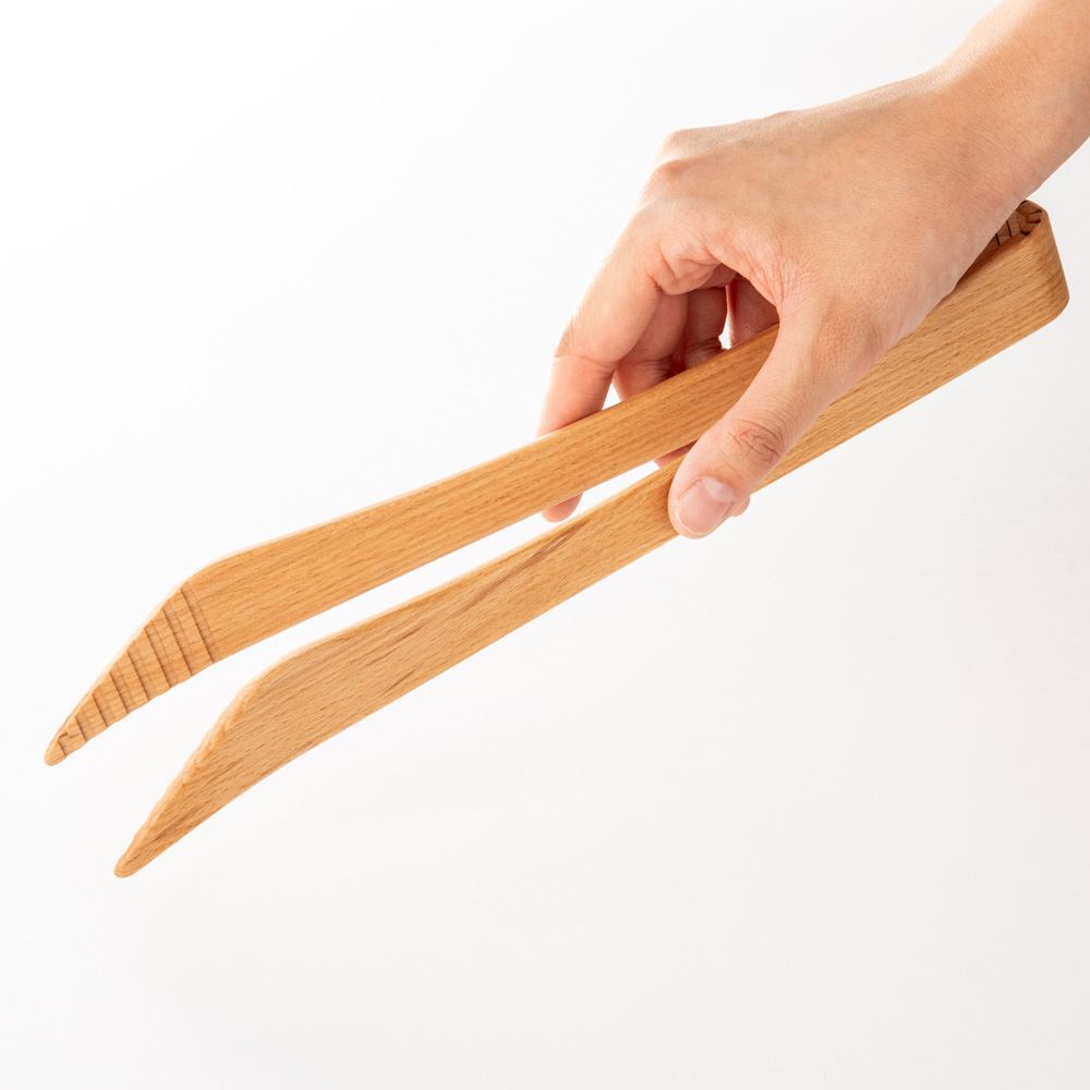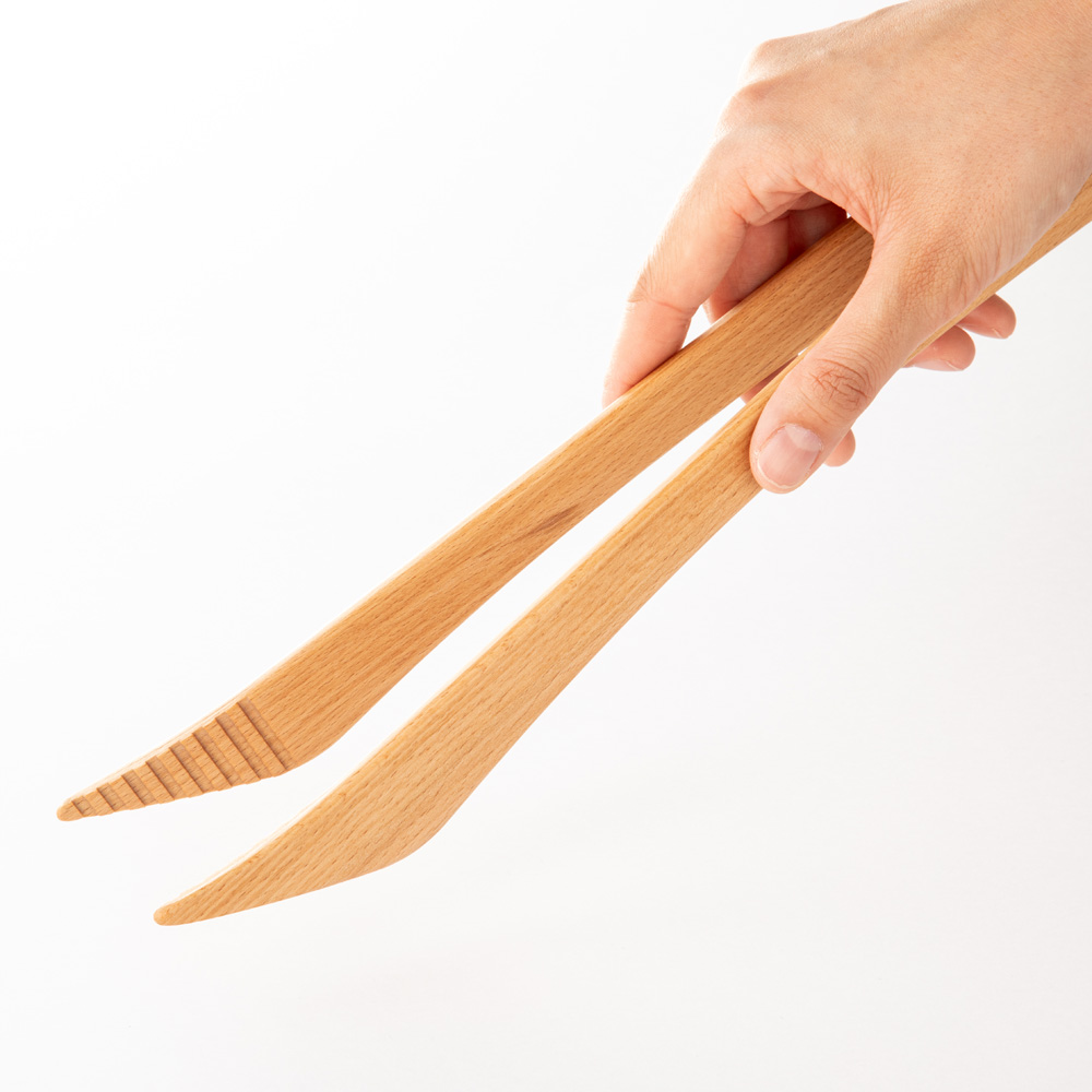 トングとしてはもちろん、くるっと向きを変えれば菜箸のように使える画期的なつくり。軽くてつかみやすく、木製だから調理器具を傷付ける心配もありません。不快な金属音がしないのもうれしいポイントです。他の調理道具を傷付けにくく、カチャカチャと不快な金属音がしない木製トング。傷付きやすい表面加工のフライパンや金属製のボウルにも安心して使えます。手に伝わる木のぬくもり。これ1本であらゆる調理がまかなえます。「炒める」「つかむ」「混ぜる」がこれ1本で可能に。あれこれ道具を出す手間や洗い物も減らせます。ウレタン塗装を施しているので色移りしにくく、トマトを使った煮込み料理やカレーも安心。手にしっくりなじみ、ちょうどいい「バネ感」でつかみやすく、疲れにくい!滑りやすいパスタもしっかりつかめ、ゆでるのもあえるのもラクラク。1本スッと持ち上げて、ゆで加減のチェックもスムーズにできます。先端が細くなっている側を下にすると菜箸のようにして使えます。先端が細くなっている側は調味料を混ぜたり、細かいものをつかんだりと菜箸のように使用可能。玉子焼きは、卵を「混ぜる」ところから「焼く」、「詰める」までの一連の作業がこのトング1本で済みます。桐だんすに使われる「挽き曲げ」の技術により、一枚板をトングの形状に加工しています。新潟県産ブナ「スノービーチ」を使用して1つ1つ丁寧に仕上げています。余分なパーツがないためスマートで美しく、お手入れもしやすい!