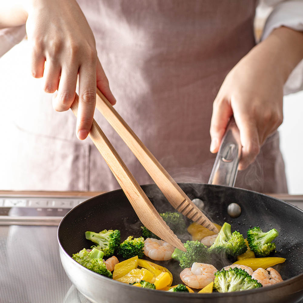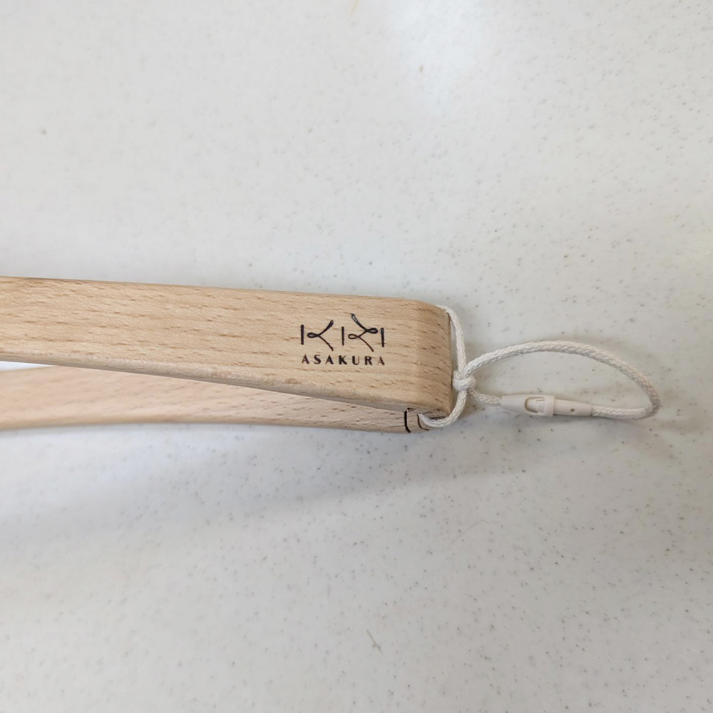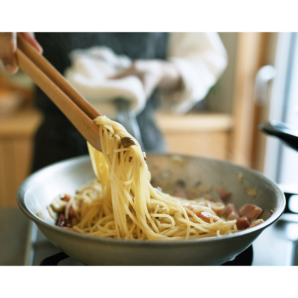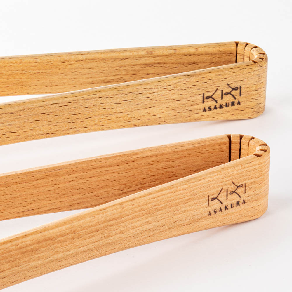 トングとしてはもちろん、くるっと向きを変えれば菜箸のように使える画期的なつくり。軽くてつかみやすく、木製だから調理器具を傷付ける心配もありません。不快な金属音がしないのもうれしいポイントです。他の調理道具を傷付けにくく、カチャカチャと不快な金属音がしない木製トング。傷付きやすい表面加工のフライパンや金属製のボウルにも安心して使えます。手に伝わる木のぬくもり。これ1本であらゆる調理がまかなえます。「炒める」「つかむ」「混ぜる」がこれ1本で可能に。あれこれ道具を出す手間や洗い物も減らせます。ウレタン塗装を施しているので色移りしにくく、トマトを使った煮込み料理やカレーも安心。手にしっくりなじみ、ちょうどいい「バネ感」でつかみやすく、疲れにくい!滑りやすいパスタもしっかりつかめ、ゆでるのもあえるのもラクラク。1本スッと持ち上げて、ゆで加減のチェックもスムーズにできます。先端が細くなっている側を下にすると菜箸のようにして使えます。先端が細くなっている側は調味料を混ぜたり、細かいものをつかんだりと菜箸のように使用可能。玉子焼きは、卵を「混ぜる」ところから「焼く」、「詰める」までの一連の作業がこのトング1本で済みます。桐だんすに使われる「挽き曲げ」の技術により、一枚板をトングの形状に加工しています。新潟県産ブナ「スノービーチ」を使用して1つ1つ丁寧に仕上げています。余分なパーツがないためスマートで美しく、お手入れもしやすい!