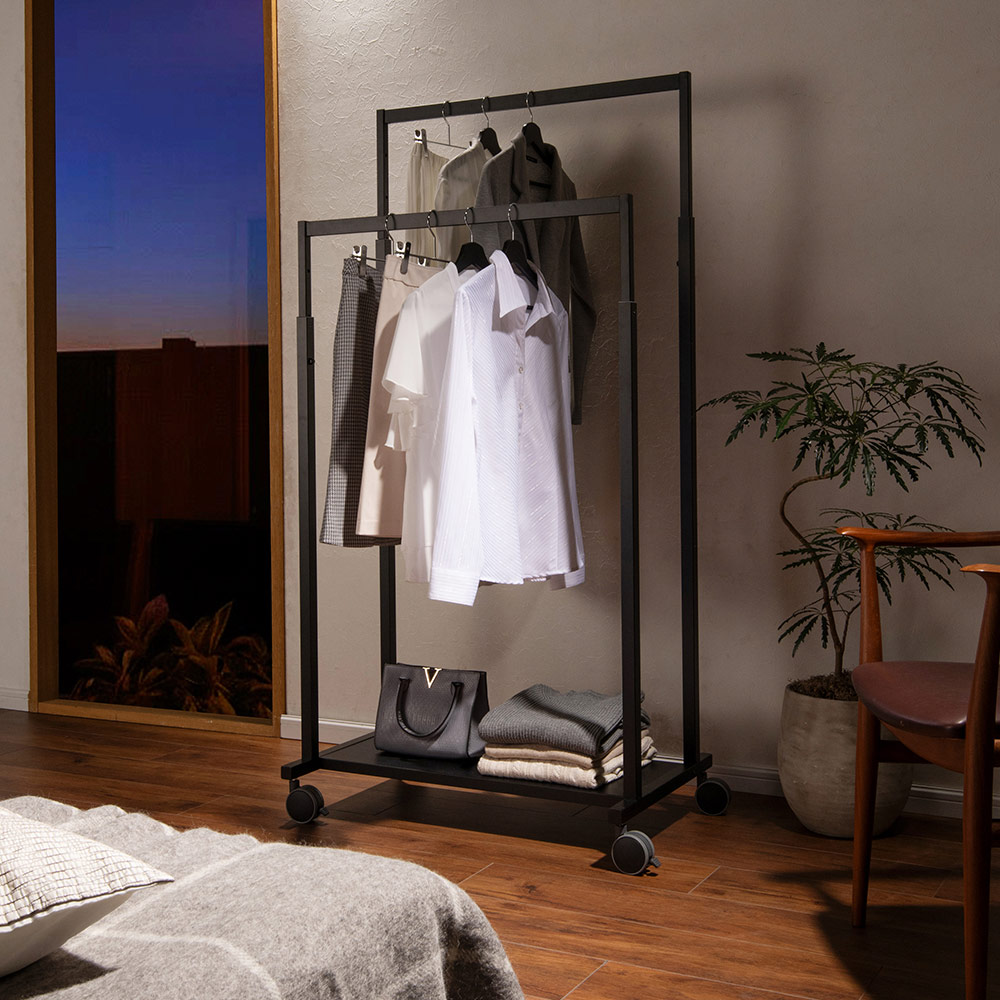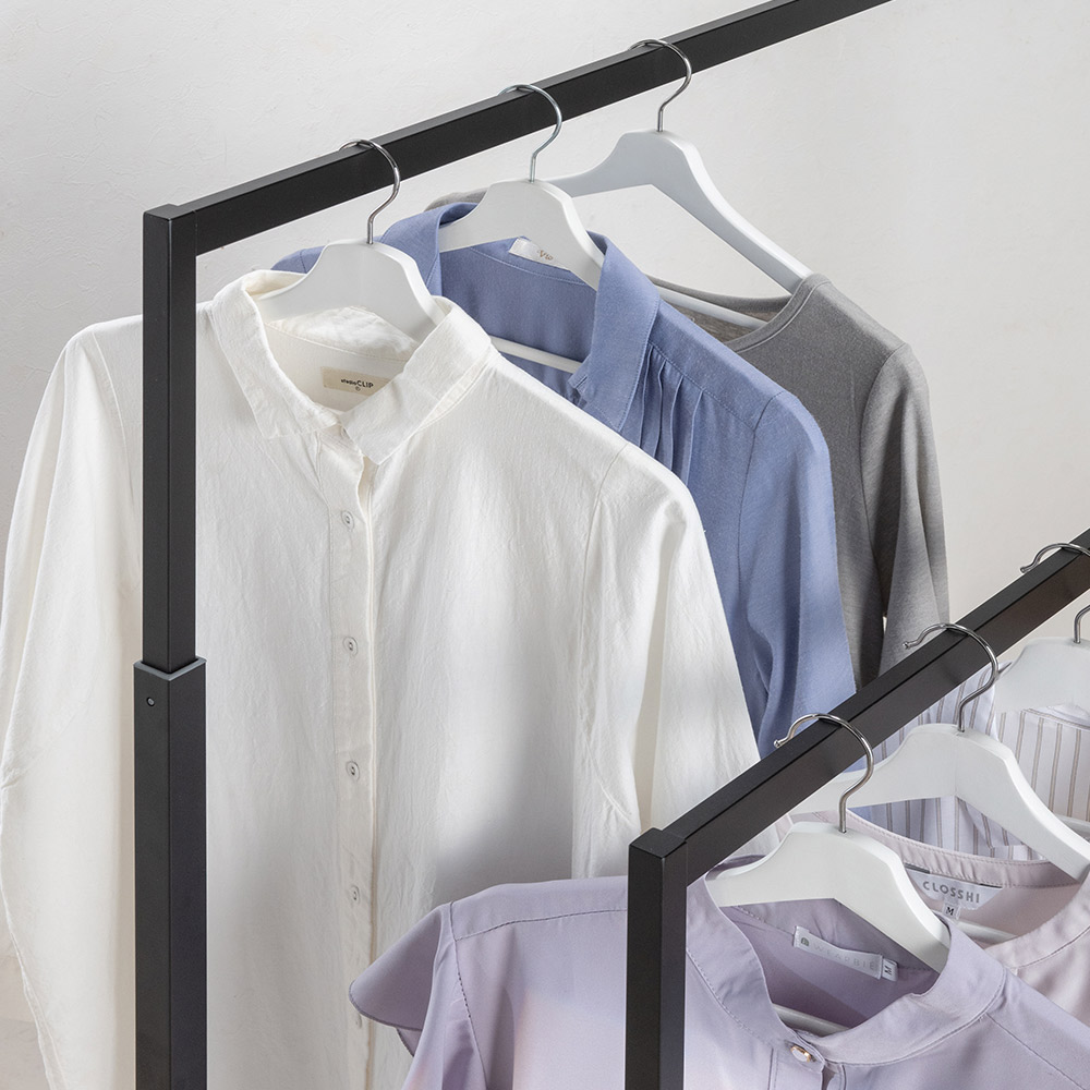ダブルハンガーなら、シングルハンガーと同じ奥行でも収納力は約2倍。たとえば手前にショート丈、奥にロング丈を掛ければ見た目も美しく収納できます。