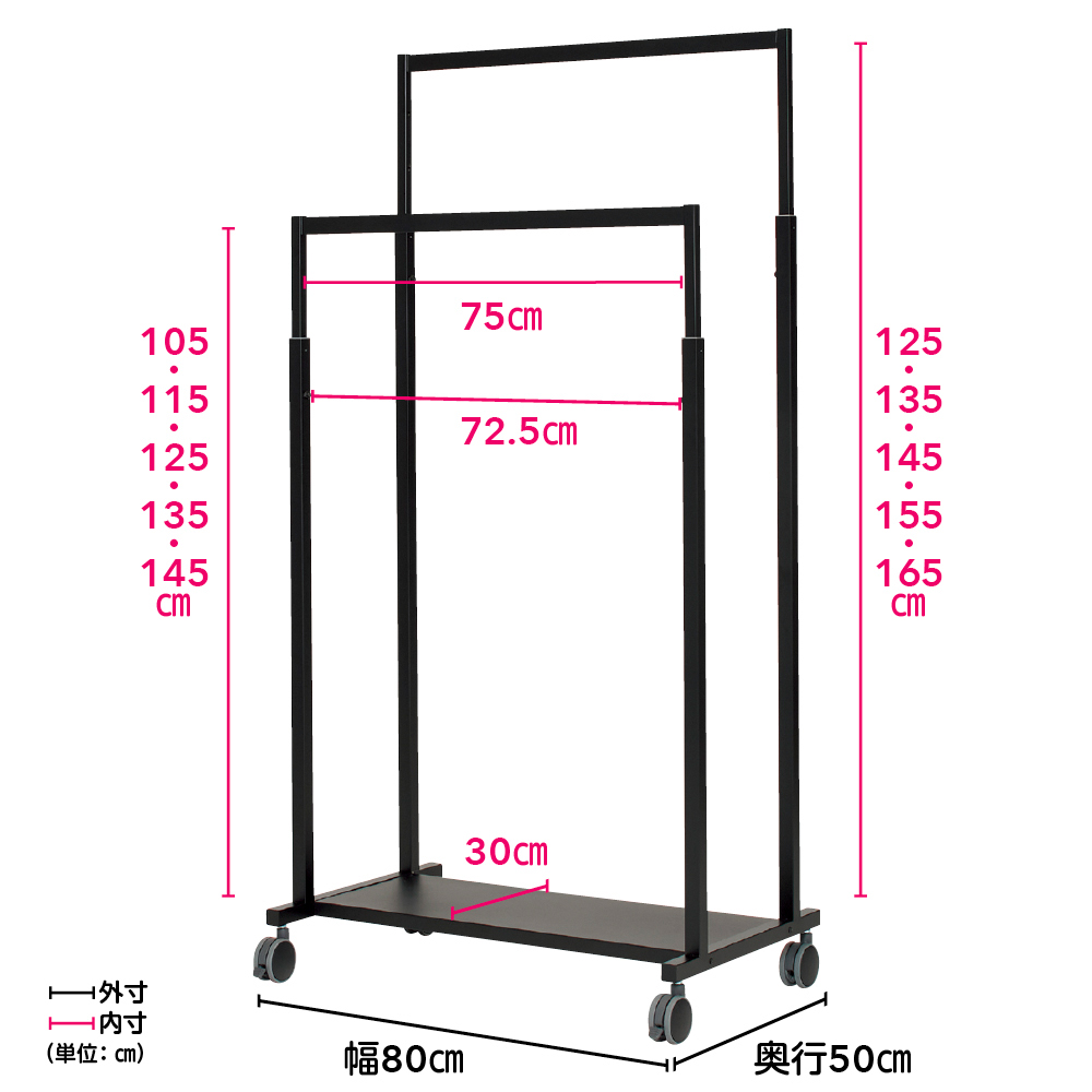 前後2本のハンガーバーはそれぞれ独立して高さが設定可能。高さが10cm刻みで5段階から選べます。