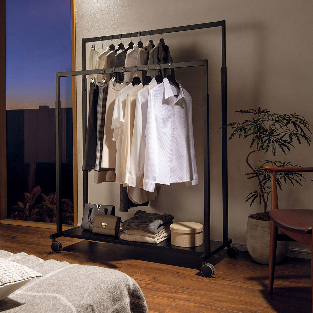 ダブルハンガーなら、シングルハンガーと同じ奥行でも収納力は約2倍。たとえば手前にショート丈、奥にロング丈を掛ければ見た目も美しく収納できます。