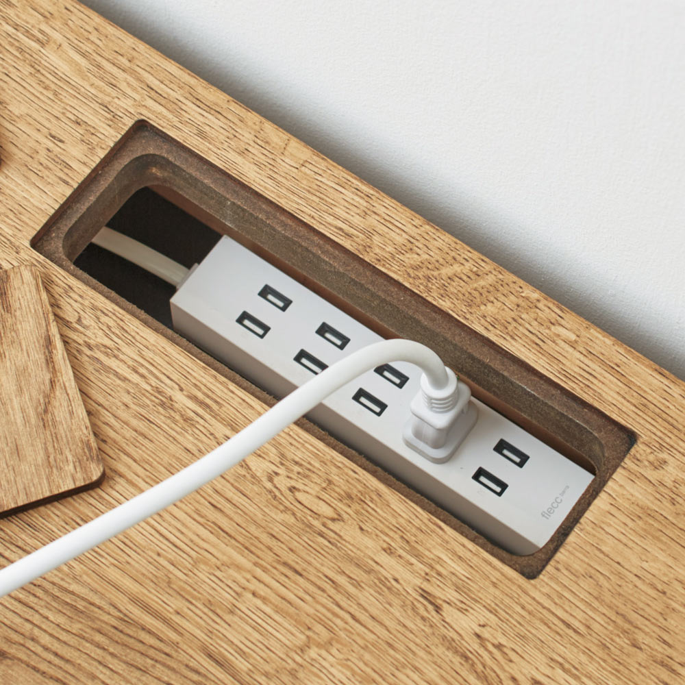 机の奥中央には配線穴があり、その下にはコンセントタップ収納スペースがあるのでコード類もスッキリ。