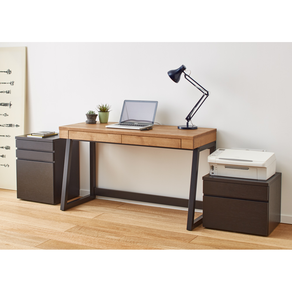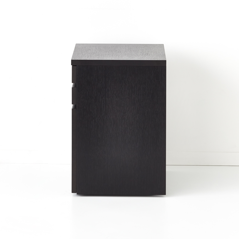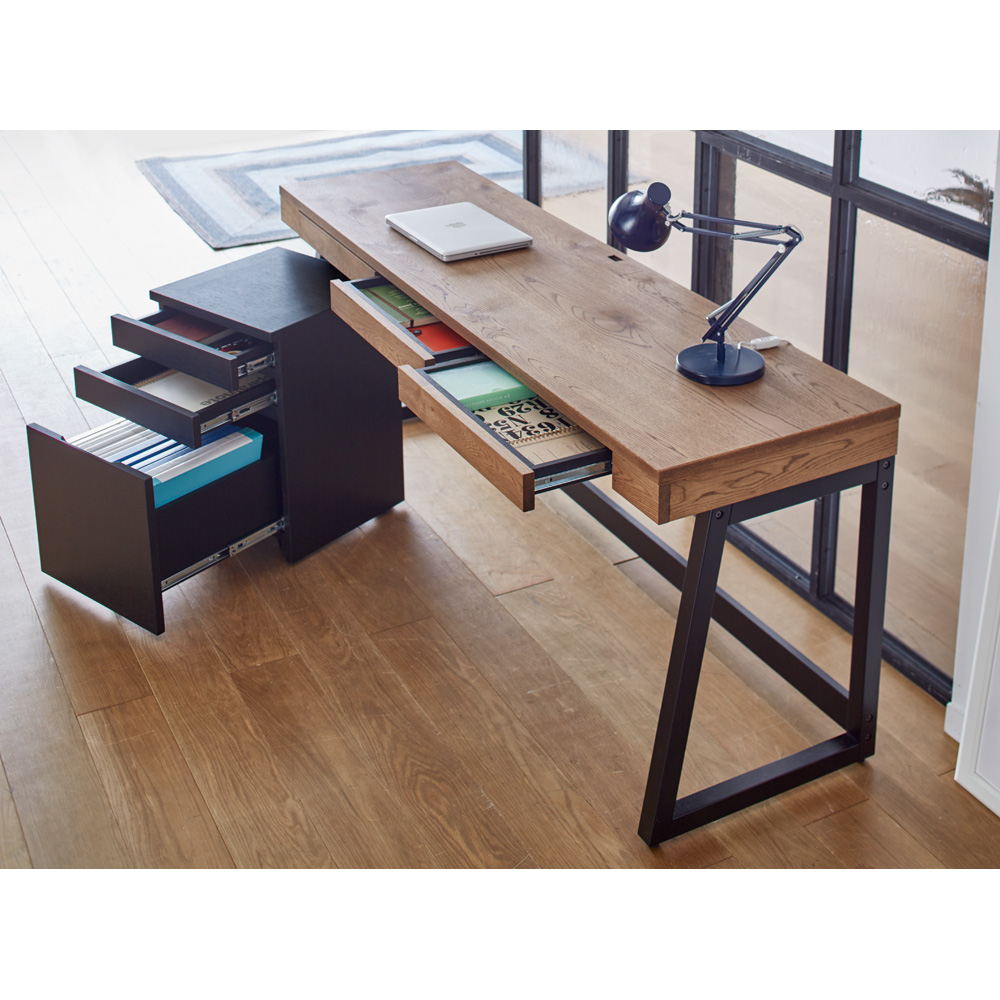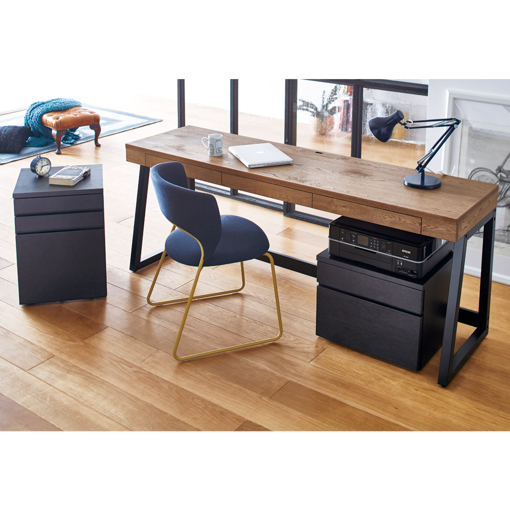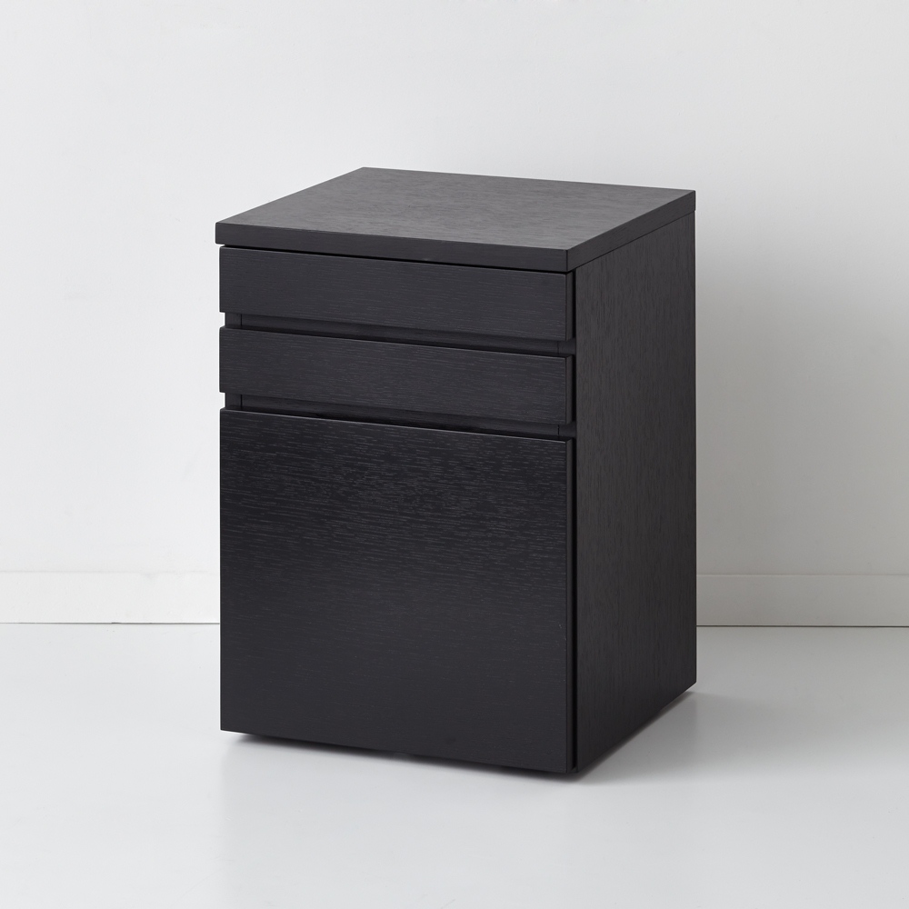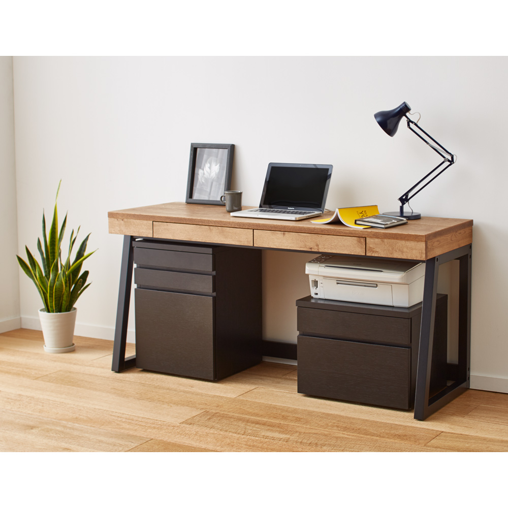 ナチュラルで風合い豊かな北海道産・ミズナラ材を使用したおしゃれなホームオフィスシリーズ。味わい深いミックススタイルが叶うサイドワゴンで自由でリラックス感のあるワークスペースを。素材感を活かしたラフ&リラックスホームオフィスのインテリアを、もっとおしゃれでファッショナブルなものに。そんな想いを込めた、本格派ワークデスクシリーズの登場です。デスク天板には、北海道産のミズナラ材を採用し、素材の自然のままの風合いを活かしました。ワゴン本体には、うっすらと木目を残したブラック塗装を施し、流行を取り入れたMIXスタイルに。個性的で存在感のある、オシャレなPCデスクシリーズが誕生しました。Brook(ブルック) ウッドデスクシリーズで、自由でリラックス感のあるワークスペースをお楽しみください。【ミズナラ天然木について】主に北海道で採れるミズナラは、厳しい環境に耐えて育つため、特にきめ細やかで木目の美しさで知られています。硬度が高く重厚感に優れた素材であるため、高級家具材や建築材、さらにはウイスキー樽としても使用されます。上記の理由から国際的にも評価が高いものの、大木に成長するのに時間がかかること、もともとの生育量が少ないことから市場に出回る量が少なく希少材になっています。〜素材と機能〜◆本体にはオーク材を採用し、うっすらと木目が残るブラック塗装を施してあります。◆引き出しは、全段ストッパー付きのスライドレールで、開閉や出し入れもラクラク。最下段はA4ファイル対応です。◆デザインを重視した隠しキャスター付きで移動も可能。◆格調高いたたずまいは、書斎からリビングやダイニング、ベッドルームまで幅広いシーンで活躍します。◆優れた素材&国内の職人による丁寧な仕上げは、子どもの学習机ワゴンとしてもおすすめ。◆完成品でのお届で、すぐにお使いいただけるのもポイントの1つです。◆シリーズには、デスク・サイドチェスト・プリンターワゴンをラインナップしています。