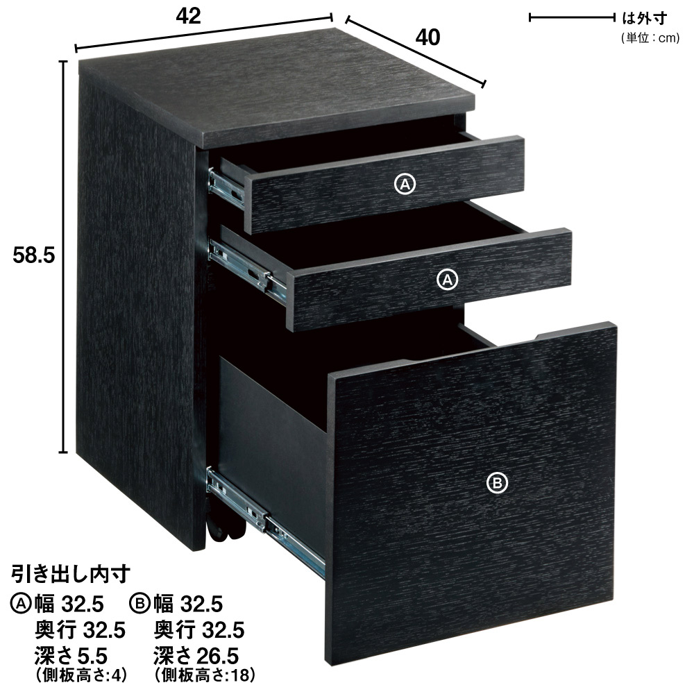 引き出しは、全段ストッパー付きのスライドレールで、開閉や出し入れもラクラク。