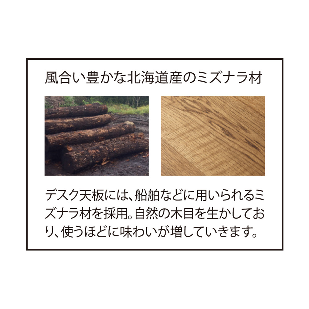 風合い豊かな北海道産のミズナラ材 デスク天板には、船舶などに用いられるミズナラ材を採用。自然の木目を生かしており、使うほどに味わいが増していきます。