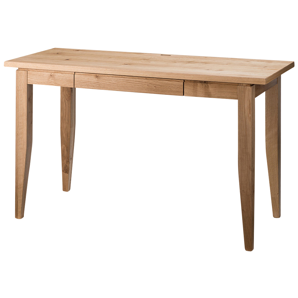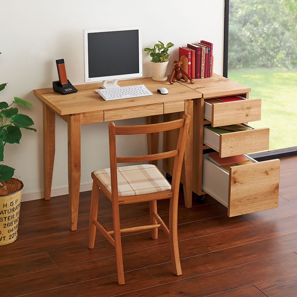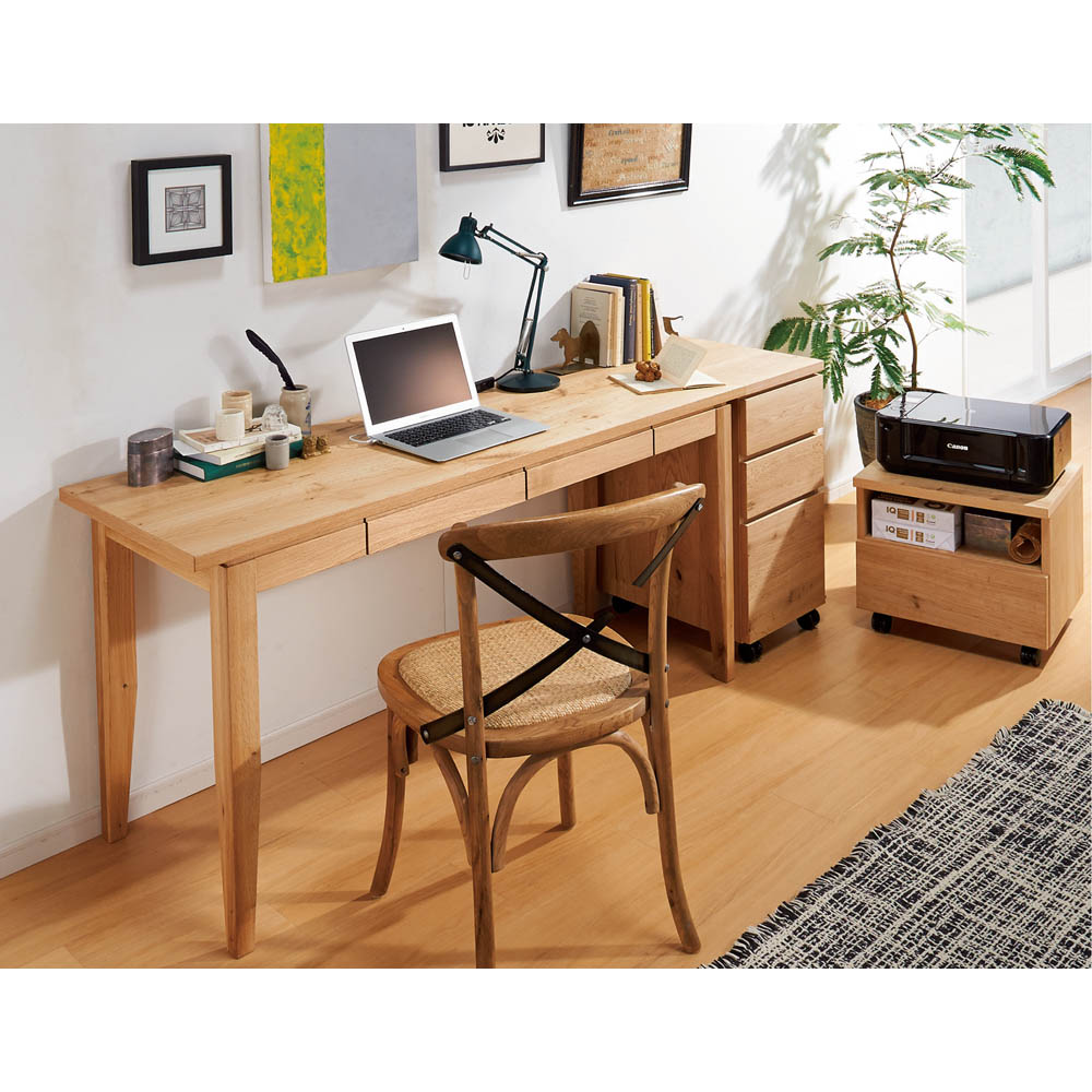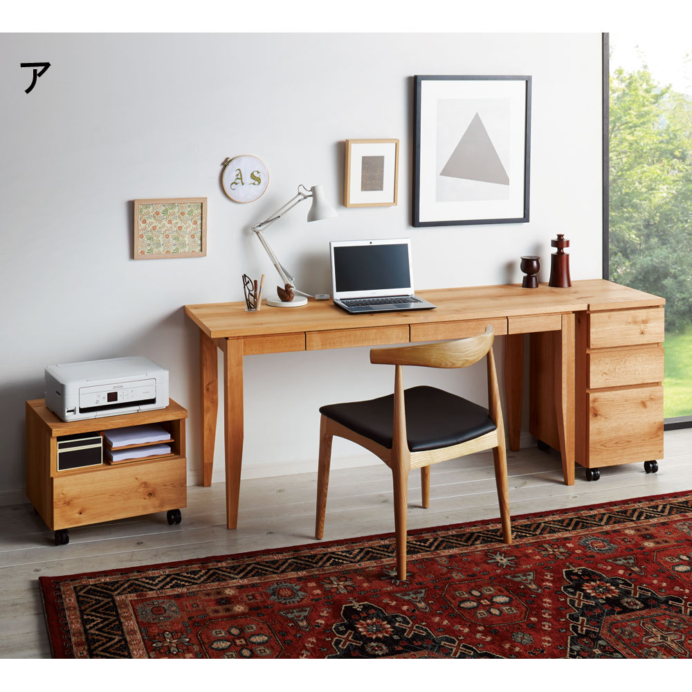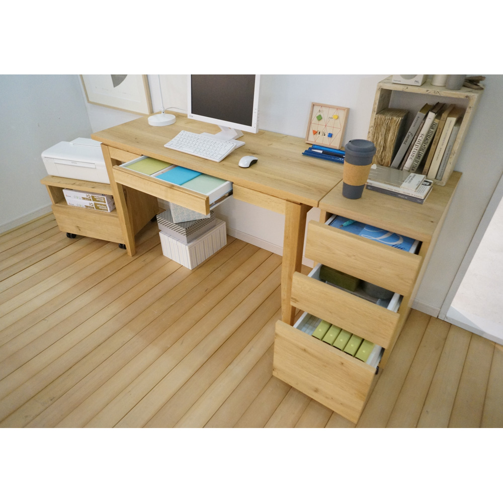北海道産のオークを使用した、味わい深いPCデスクシリーズ。オーク材特有の風合いが醸し出す自然の素材感。使い込むほどに味わいが増し、時と共に愛着も深まる独特の経年変化も魅力。テレワーク・リモートワーク・勉強机としてもおすすめです。希少性のある北海道産のオーク材を贅沢に使用◆古くから船や高級家具の素材として使われてきた、丈夫な北海道産のオーク材(無垢材・突板)を採用し、たたずまいが美しい、おしゃれな木製パソコンデスクが生まれました。◆自然のままの節やオーク材特有のふの部分も使うことで、より自然の風合いを醸し出しています。◆どこか懐かしいナチュラルな北欧風のデザインは、インテリアとしてもおしゃれな印象のワークデスク。◆天板には配線穴があり、天板下にはコンセントタップ収納スペースがあるので、ごちゃつきがちなコード類もスッキリさせることができます。◆引き出しは内部化粧されて清潔感があり、スライドレール付きなので開閉や出し入れもラクラクです。◆格調高いたたずまいは、書斎からリビングやダイニング、ベッドルームまで幅広いシーンで活躍します。◆優れた素材&国内の職人による丁寧な仕上げは、子どものリビング学習机としてもおすすめ。◆脚部の取り付けのみの組み立てで、すぐにお使いいただけるのもポイントの1つです。◆シリーズにはデスク奥行50cm・デスク奥行70cm・サイドチェスト・プリンターワゴンをラインナップしています。
