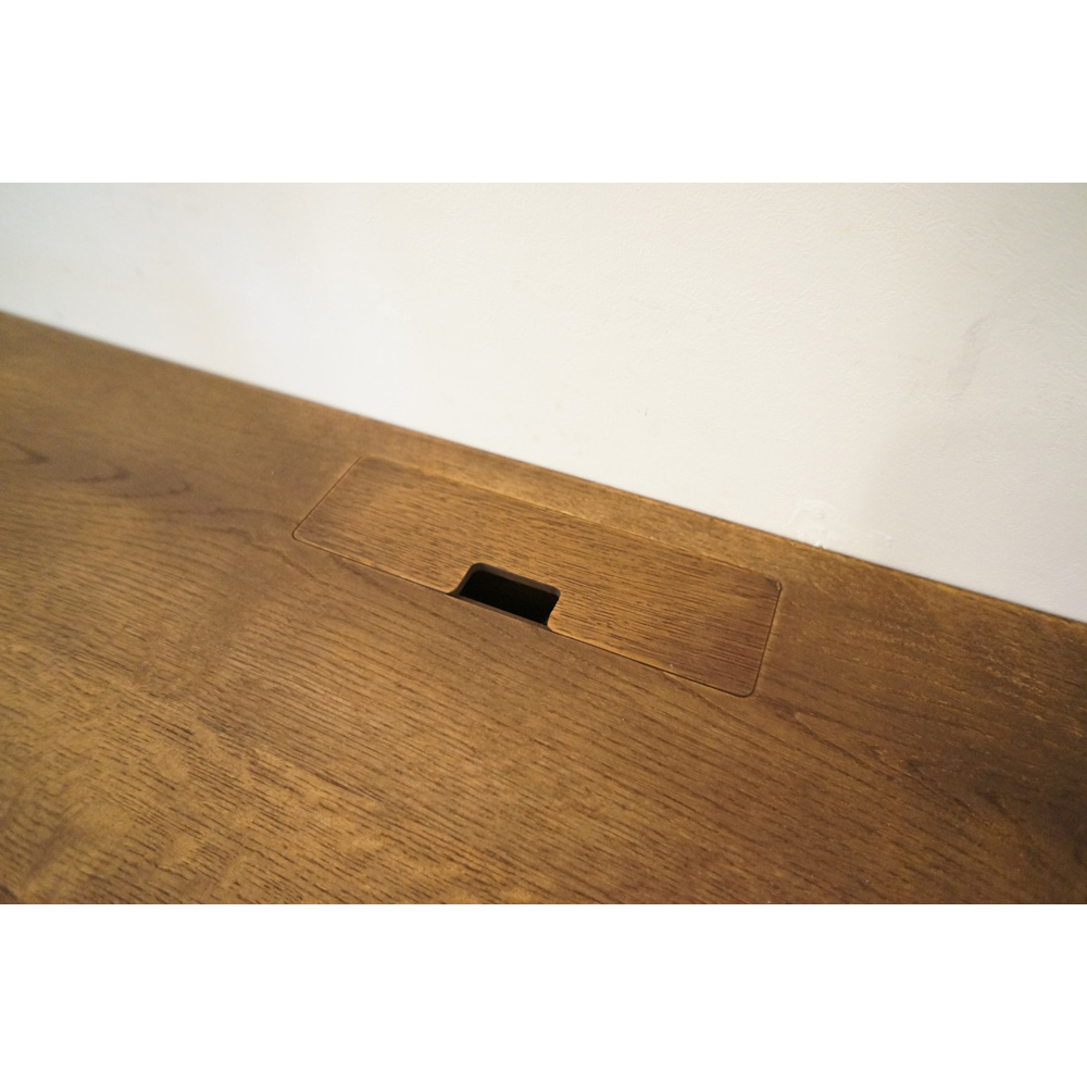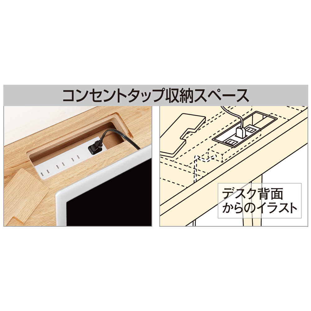 デスク天板奥の内側には電源タップも入るコード収納スペース付き。配線を隠すことができ、フタ付きで見た目もすっきり。