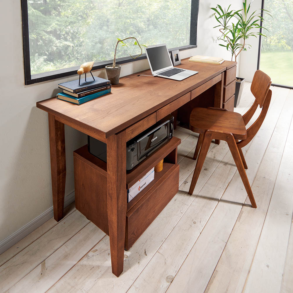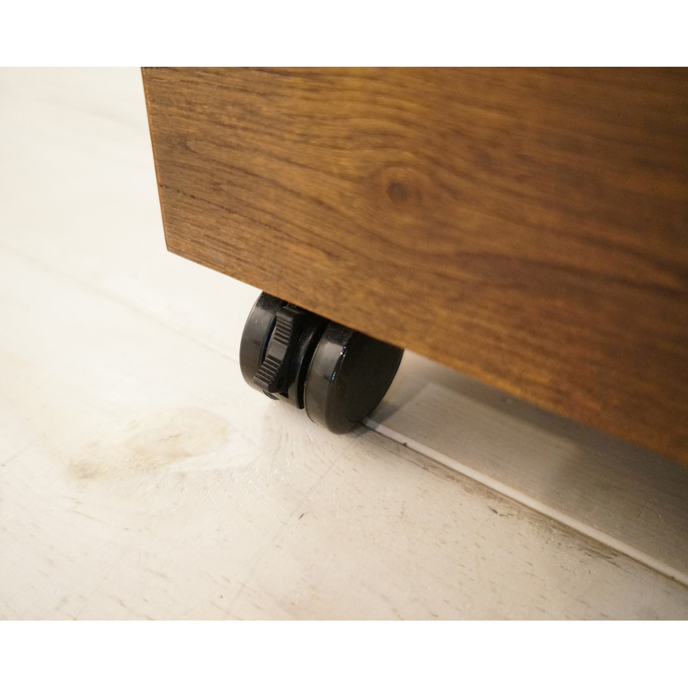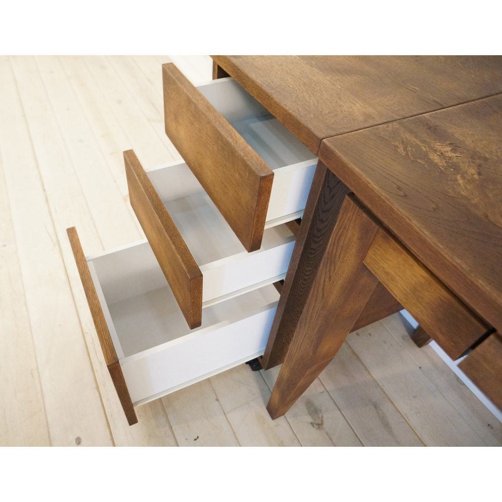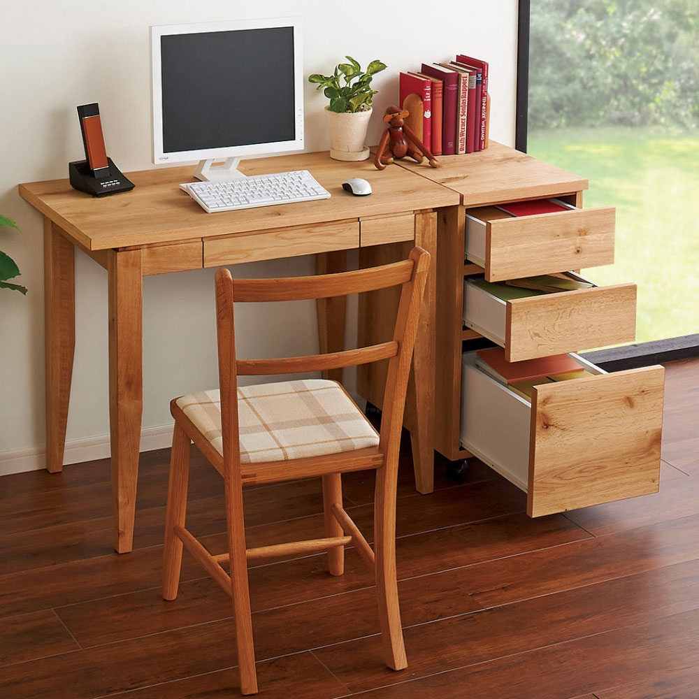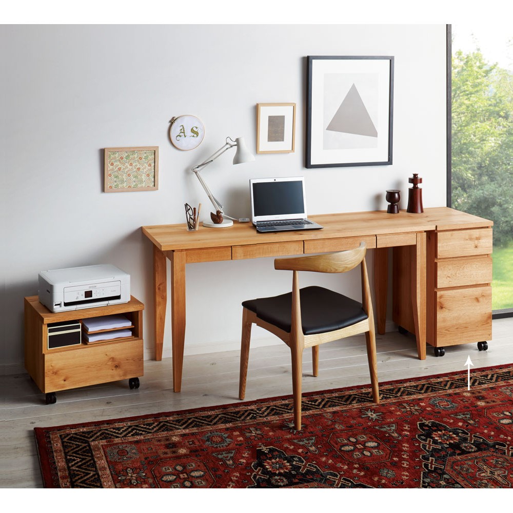 北海道産のオークを使用した、味わい深いPCデスクシリーズ。オーク材特有の風合いが醸し出す自然の素材感。使い込むほどに味わいが増し、時と共に愛着も深まる独特の経年変化も魅力のサイドチェストワゴン。希少性のある北海道産のオーク材を贅沢に使用◆古くから船や高級家具の素材として使われてきた、丈夫な北海道産のオーク材を袖机に採用。◆自然のままの節やオーク材特有のふの部分も使うことで、より自然の風合いを醸し出しています。◆どこか懐かしいナチュラルな北欧風のデザインは、インテリアとしてもおしゃれな印象に。◆引き出しは内部化粧されて清潔感があり、スライドレール付きなので開閉や出し入れもラクラクです。◆格調高いたたずまいは、書斎からリビングやダイニング、ベッドルームまで幅広いシーンで活躍します。◆優れた素材&国内の職人による丁寧な仕上げは、子どもの学習机としてもおすすめ。◆キャスターの取り付けのみの組み立てで、すぐにお使いいただけるのもポイントの1つです。◆シリーズにはデスク・サイドチェスト・プリンターワゴンをラインナップしています。