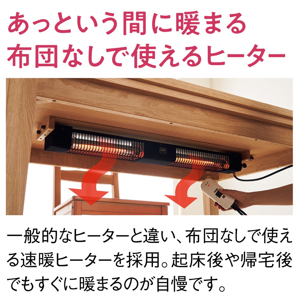 「布団あり・なし」の2WAYで使える“優秀”ダイニングこたつ。北海道産ミズナラ材の上質な素材感を生かし、通年活躍するダイニングテーブルとしても、完成度高く仕上げました。つけてすぐ温かい速暖ハロゲンヒーターを採用!省エネになると話題のこたつで電気代を賢く節電しましょう。大切に使い込みたい天然木の美しい木目と重厚感美しい木目とずっしりとした重厚感が特徴で、高級家具につかわれる北海道産ミズナラを使用したこたつテーブル。天板は天然木の質感を生かしたオイル仕上げで、使うほどに味わいがでます。重厚な素材をすっきりとしたデザインに仕上げることで、北欧モダンやヴィンテージインテリアに合わせるダイニングテーブルとしても活躍。サステナブルな北海道産ミズナラ天然木主に北海道で採れるミズナラは、厳しい環境に耐えて育つため、特にきめ細やかで木目の美しさで知られています。硬度が高く重厚感に優れた素材であるため、高級家具材や建築材、さらにはウイスキー樽としても使用されます。上記の理由から国際的にも評価が高いものの、大木に成長するのに時間がかかること、もともとの生育量が少ないことから市場に出回る量が少なく希少材になっています。当シリーズはそんなミズナラの間伐材を利用することで森林の保護にも貢献しています。布団レスに使える&つけてすぐ温かい速暖ハロゲンヒーター速暖性に優れており、電源を入れた後も一定の暖かさを保つので、快適にくつろぐことができます。また布団を掛けずに使えるので足元がすっきり広々。起床時や帰宅時などすぐ温まりたい派の人にもおすすめです。安心と信頼の国内生産品北海道産ミズナラ材の上質な素材感を生かし、国内の老舗メーカーが丁寧に手作業でオイル仕上げを施しました。日本の熟練の家具職人がひとつずつ丁寧に仕上げたワンランク上の商品です。