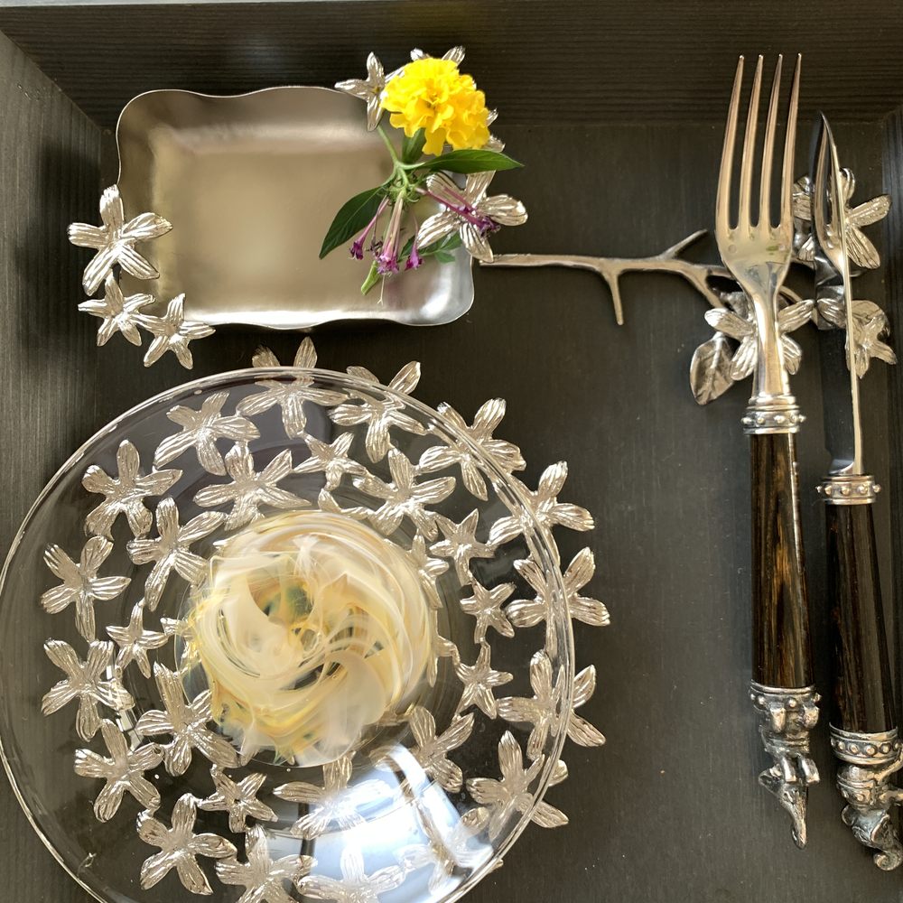 カトラリーを置いた様子。花と花の間にナイフを立てご使用することもできます。