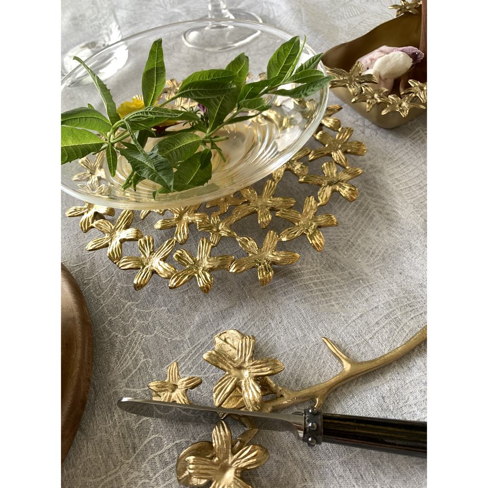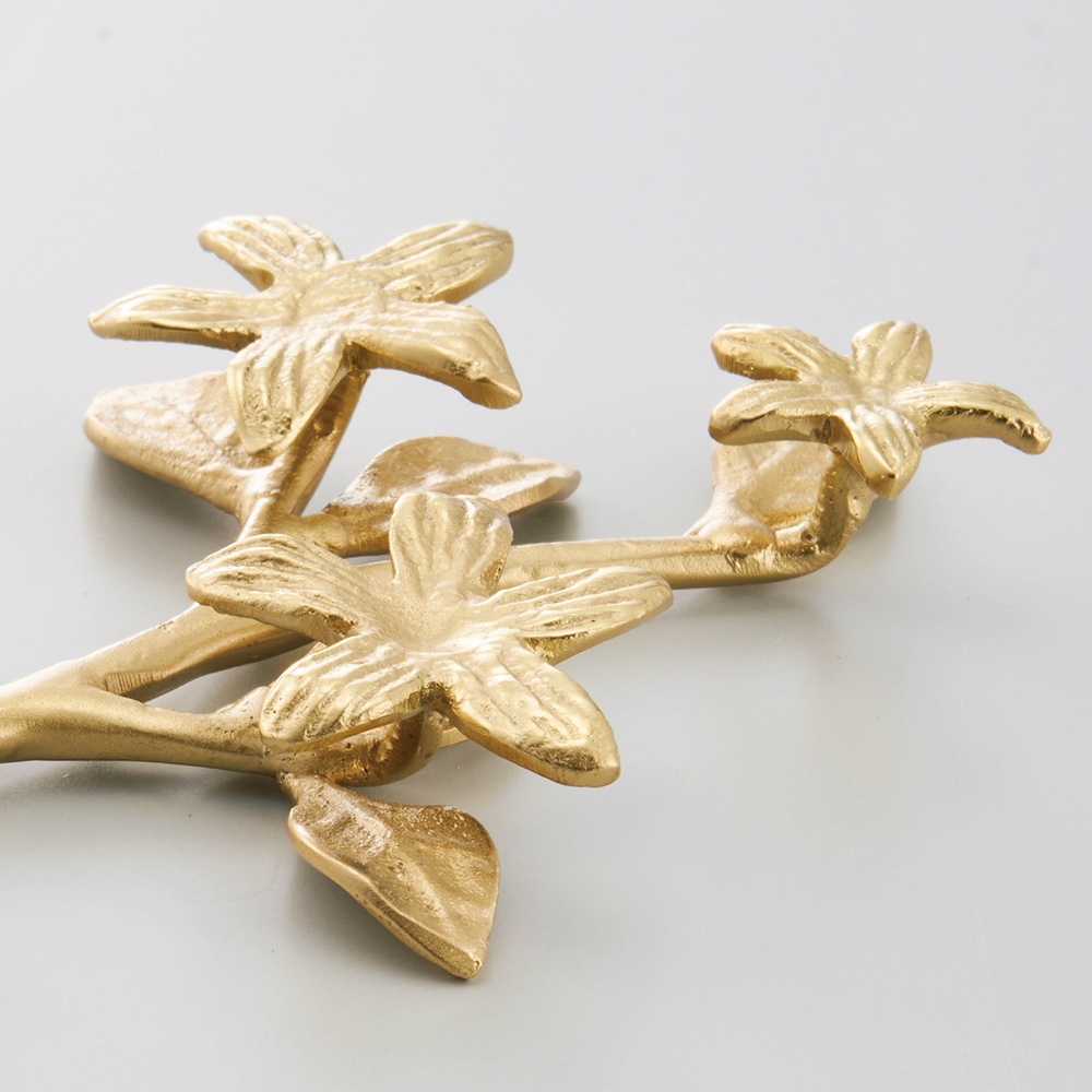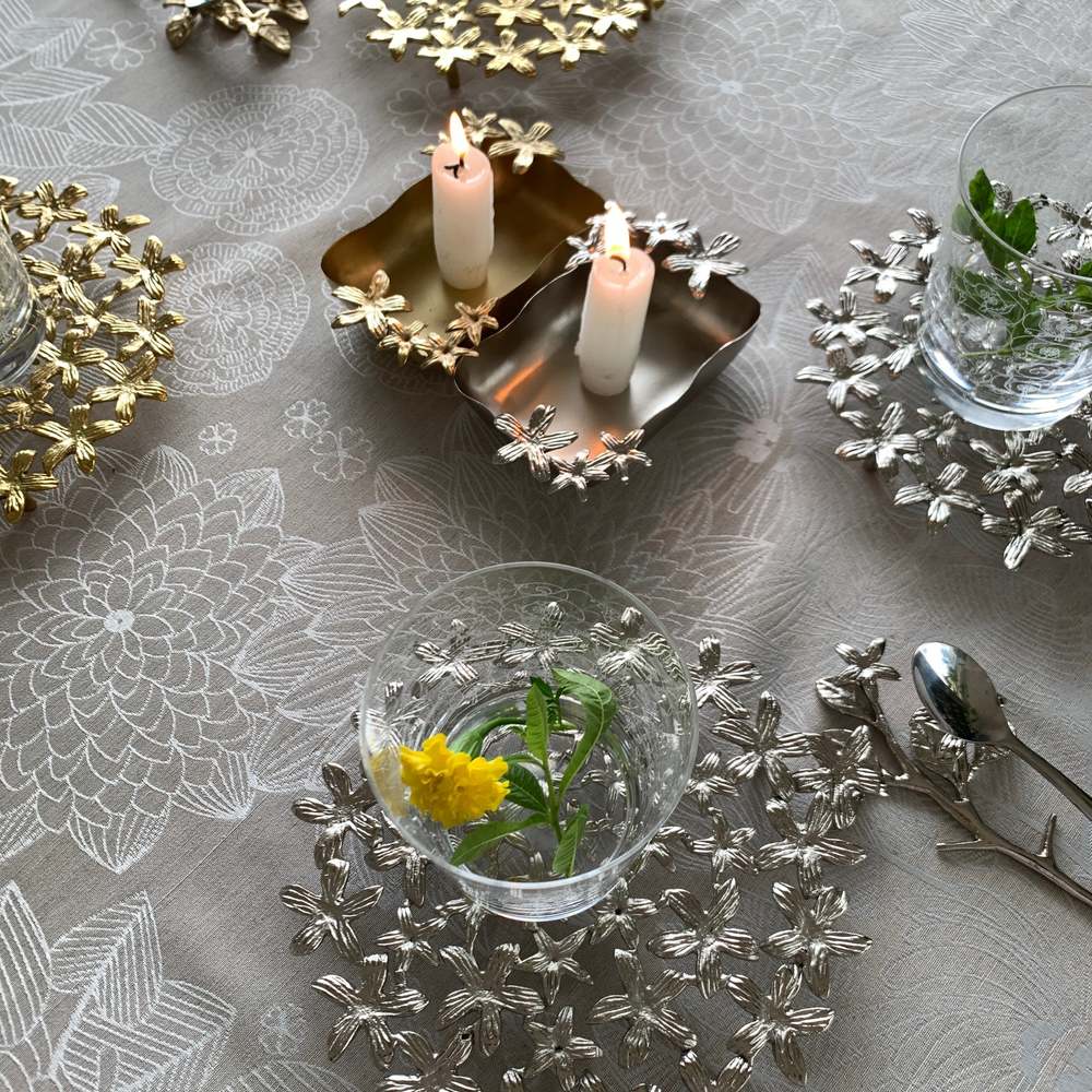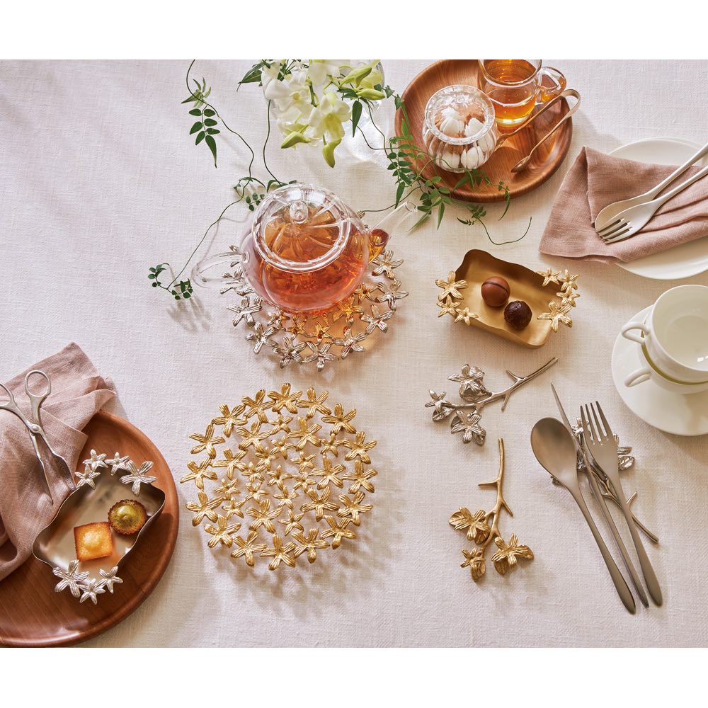 エレガントな食卓に、こだわりのカトラリーレストを。真鍮の上質な輝きが、テーブルを彩ります。上品で立体感のあるゴールドとシルバーのカトラリーレストで、食卓をよりエレガントに演出しましょう。箸置きにも。食卓を彩るエレガントなカトラリーレスト。真鍮の輝きが、大人の上質な時間を演出します。大人の女性に贈る、高級感あふれるカトラリーレストが登場!おもてなしや普段の卓上を華やかに、エレガントに演出するジュエリーのように美しい真鍮製(しんちゅう)のゴールドとシルバーのカトラリーレストです。真鍮素材を使用し、熟練の職人が手作業で仕上げたものです。立体感のあるエレガントなデザインで上質な輝きを放ちます。洗練された大人のテーブルにふさわしいゴールドとシルバーの2色展開で、お好みの組み合わせでテーブルを演出することができます。置くだけでテーブルをパっと華やかに彩るカトラリーレスト立体的な花と花の間にナイフを立ててセットできる仕様になっています。カトラリーレストを縦にしても横にしてもナイフは立てられるのでご自由にお試しください。スプーンやフォークだけでも綺麗にご使用いただけます。茎の部分を使えば箸も置けます。Adhya Designアドヤデザインは、インド発の金属工芸品メーカー。熟練の職人による手作業で作られた商品はとてもモダンで繊細で、欧米で大変人気のブランドです。