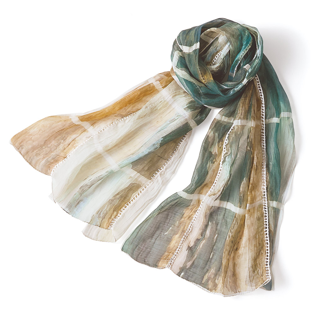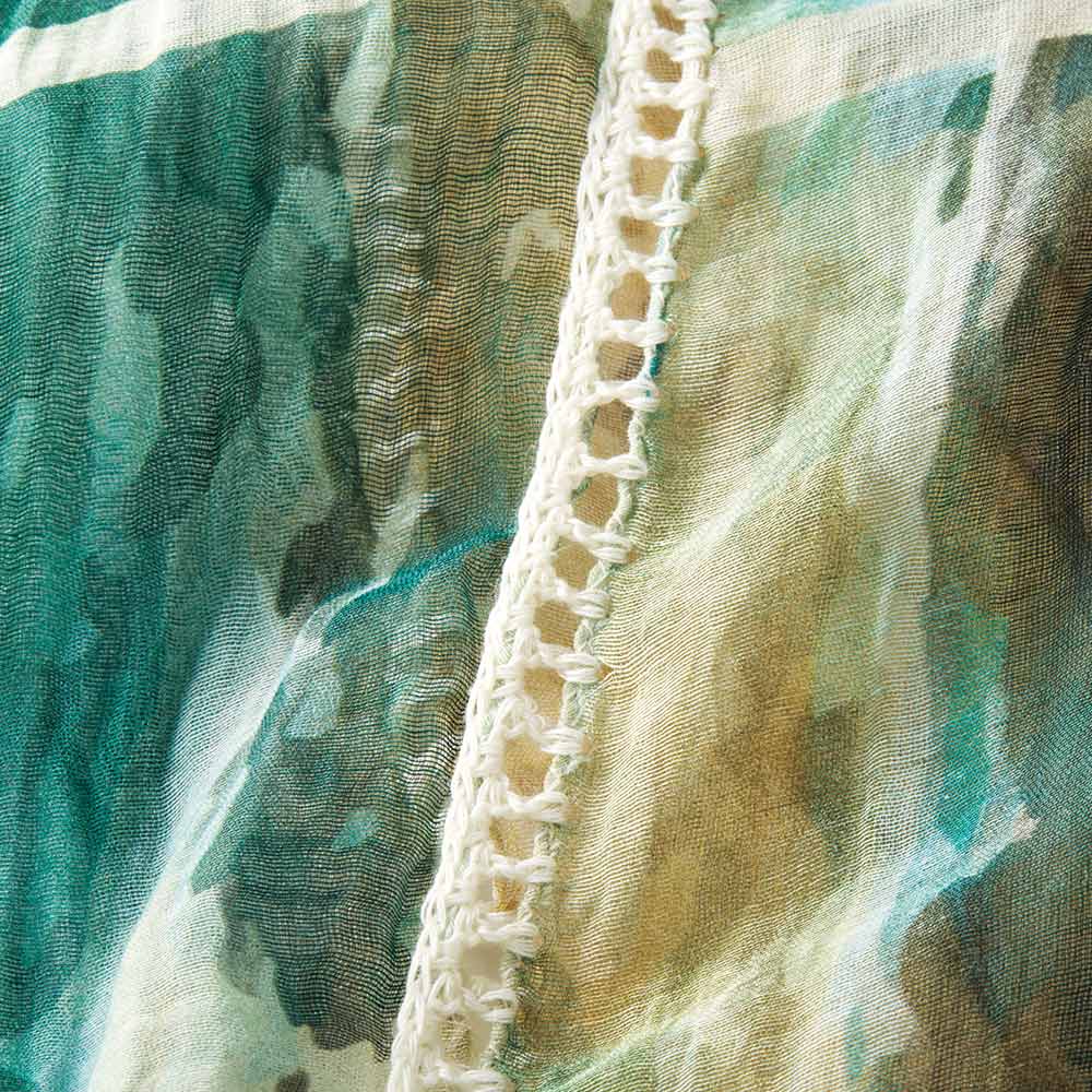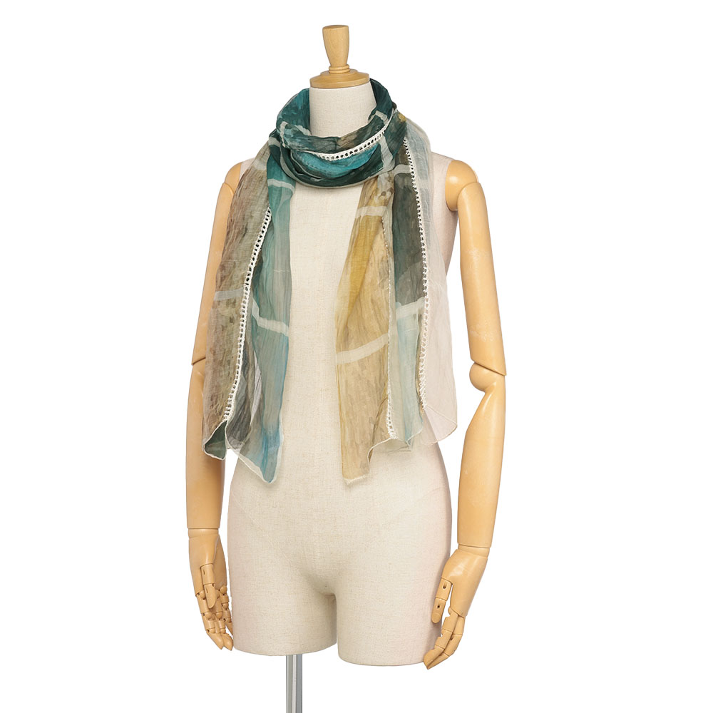 Botanical Chicトレンド継続のグリーンと、延長線上のアーシーな色合い。みずみずしさが香る“ボタニカル”なスパイスがフレッシュなときめきを運んできます。個性あるグリーンを優しいニュアンスで攻略春夏といえば淡いトーンが主流ですが、今季はコクのあるカラーが新鮮。トレンド感と品格を兼ね備えたグリーンは、大人の夏の彩りにうってつけです。ご用意したのは、梯子レースが軽やかなコットンシルクのストール。空気のように軽やかな生地に大地と海の色を乗せたプリントは、思わず溜息が漏れる美しさ。ひと巻きするだけで、シンプルな装いが表情豊かに見違えます。≫ POINTアースカラーに白抜きでリズムを付け、着こなしになじみやすい一枚に。絹織物の名産地インド・バラナシ製です。