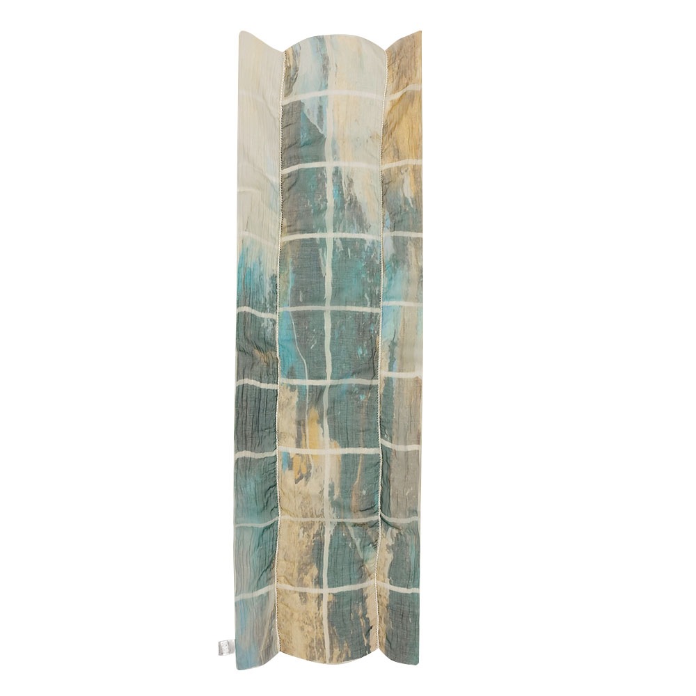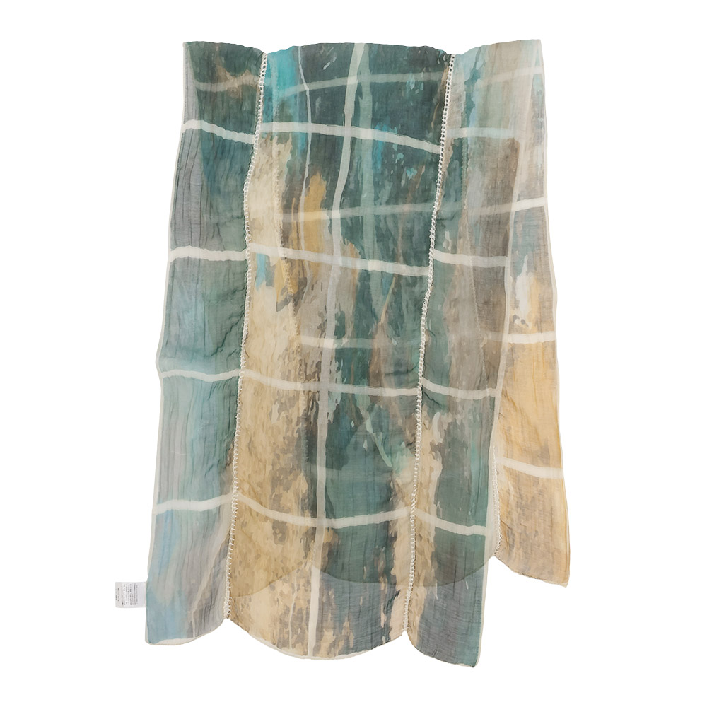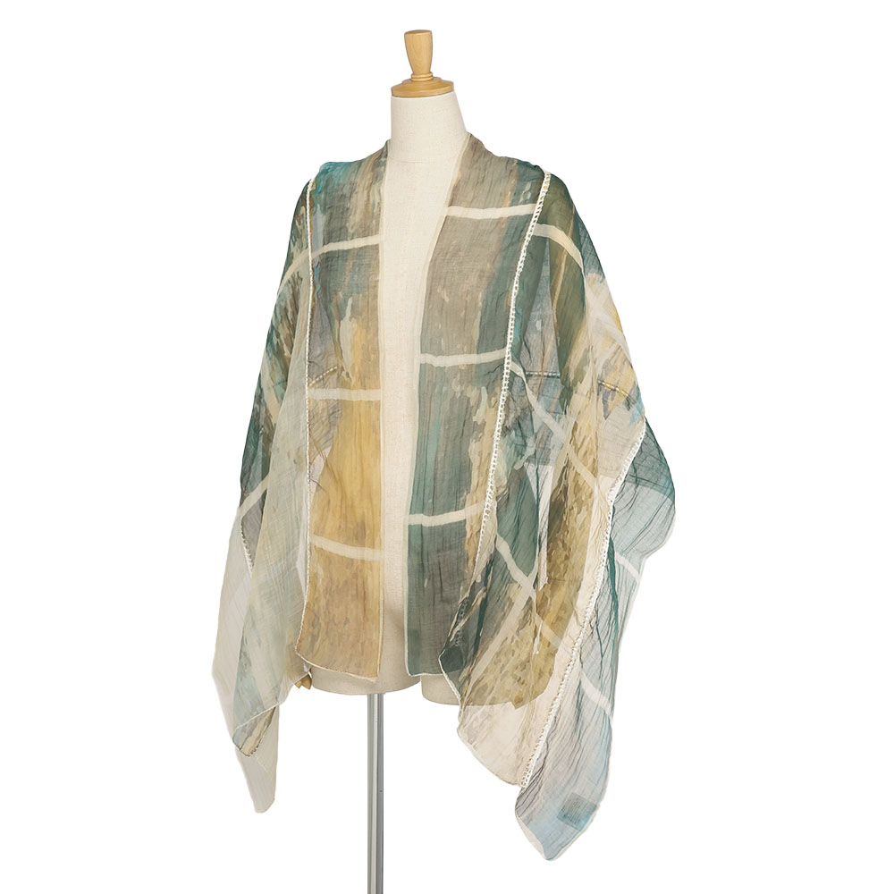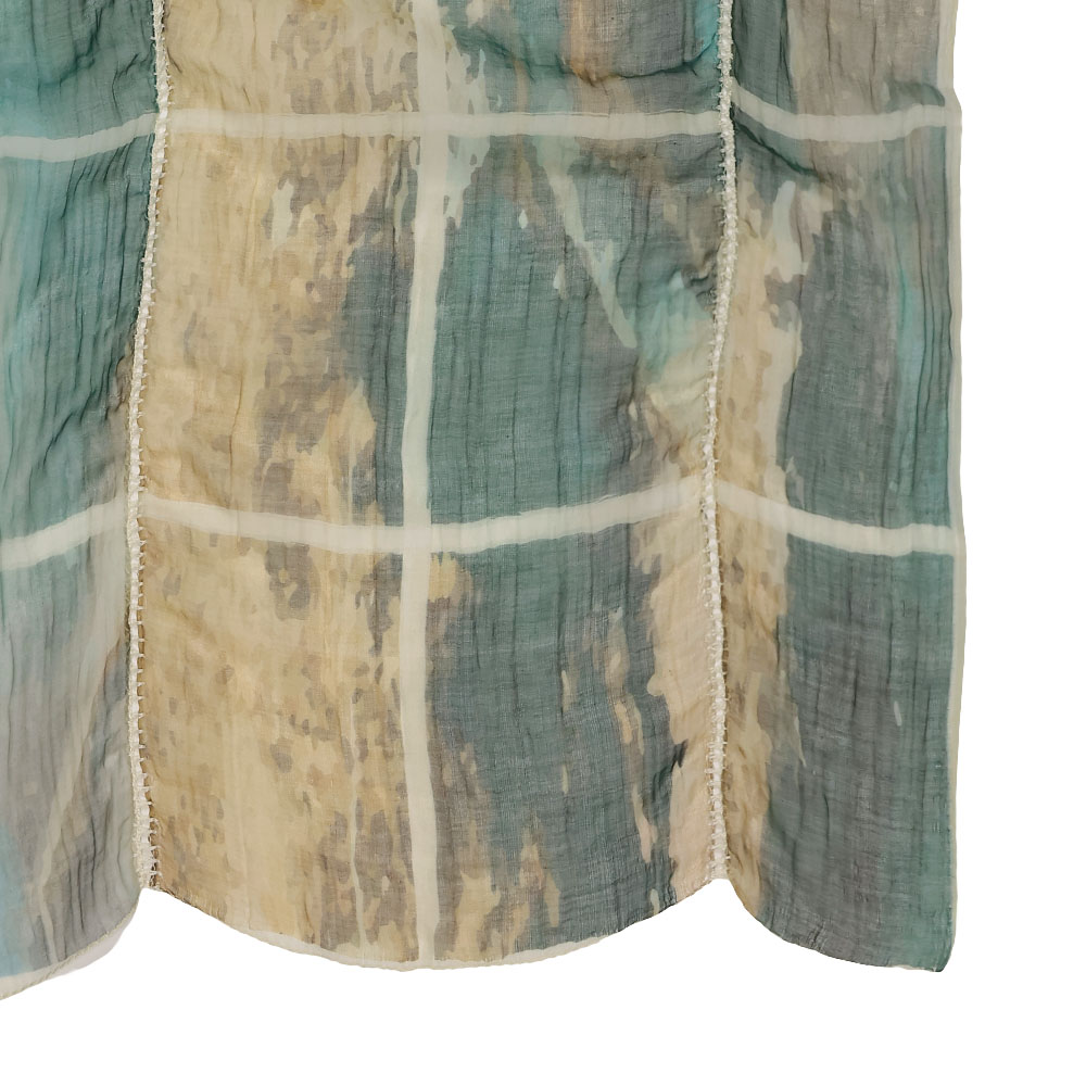 Botanical Chicトレンド継続のグリーンと、延長線上のアーシーな色合い。みずみずしさが香る“ボタニカル”なスパイスがフレッシュなときめきを運んできます。個性あるグリーンを優しいニュアンスで攻略春夏といえば淡いトーンが主流ですが、今季はコクのあるカラーが新鮮。トレンド感と品格を兼ね備えたグリーンは、大人の夏の彩りにうってつけです。ご用意したのは、梯子レースが軽やかなコットンシルクのストール。空気のように軽やかな生地に大地と海の色を乗せたプリントは、思わず溜息が漏れる美しさ。ひと巻きするだけで、シンプルな装いが表情豊かに見違えます。≫ POINTアースカラーに白抜きでリズムを付け、着こなしになじみやすい一枚に。絹織物の名産地インド・バラナシ製です。