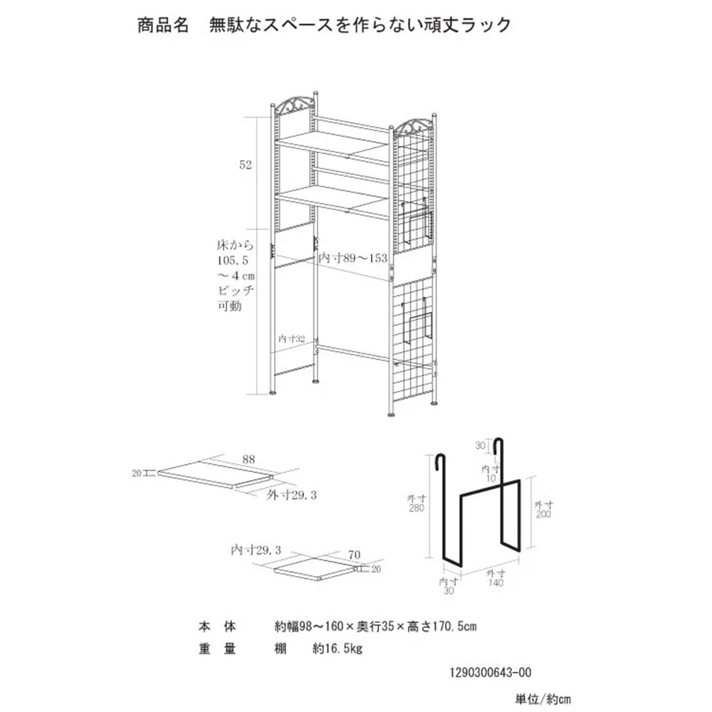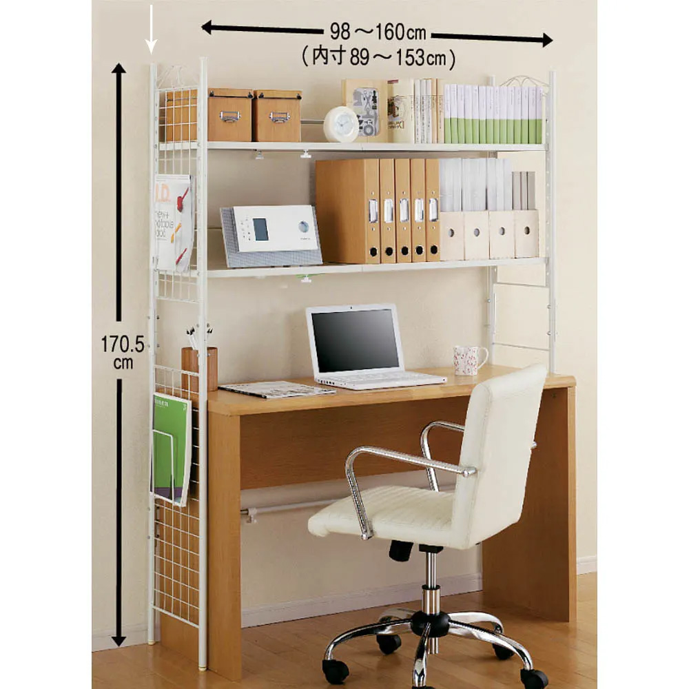 幅伸縮式で置きたい場所にぴったり。スペースや下に置く家具、収納したい物の量に合わせて、無段階で幅を調節できます。本体幅約98〜160cm。(※写真は6段タイプ)