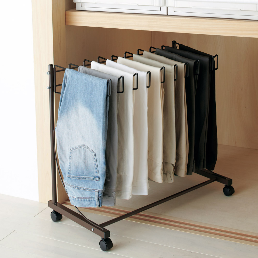 クローゼット下を有効活用して収納ができるパンツ専用ハンガーラックです。厚手のデニムでもしっかり掛けられる強度と滑り落ちにくい形状が特徴です。ハンガー部は左右に開くので取り出しやすいのも嬉しいポイント。キャスター付きで動かせるからクローゼットや押入れ収納としてもお使いいただけます。使用例:ホワイト 6本掛け 幅52cm(お届け商品)パンツを綺麗に収納できる専用ハンガーラック引き出しのパンツが見つからない、たたんでシワだらけ…。そんな悩みを解決する、パンツ専用ハンガーラックです。パンツを掛けて収納できるので、いつも綺麗な状態で保管できます。コンパクトなのに、厚手のデニムもしっかり掛けられる強度もある、ディノスのロングセラー商品です。左上段:ホワイト 6本掛け 幅52cm、右上段:ダークブラウン 10本掛け 幅75cm、下段:ダークブラウン 15本掛け 幅105cm設置場所に合わせて選べるサイズパンツ専用ハンガーは、1段、上下2段の2種類ご用意しました。1段ハンガーは6本掛け、10本掛け、15本掛けの3サイズからお選びいただけます。6本掛け:幅52 奥行41 高さ67.5cm10本掛け:幅75 奥行41 高さ67.5cm15本掛け:幅105 奥行41 高さ67.5cm上下2段ハンガーは12本掛け、20本掛けの2サイズからお選びいただけます。12本掛け:幅51 奥行41 高さ85.5〜124.5cm20本掛け:幅74 奥行41 高さ85.5〜124.5cm使用例:ホワイト 6本掛け 幅52cm洋服選びがもっと楽しくなるひと目でパンツを確認できるので、普段の洋服選びが効率良くなります。コーディネートしやすくなり、おしゃれをもっと楽しめます。使用例:ダークブラウン 10本掛け 幅75cm薄型タイプで、押入れやクローゼットのすき間にも最適奥行41cmの薄型タイプなので、ちょっとしたすき間でもコンパクトに収まります。縦向きでも使えます。クローゼットのデッドスペースや、押入れ下段のすき間にもおすすめです。使用例:ホワイト 6本掛け 幅52cm左右に広がるハンガーで、ゆったり収納できます左右に1本ずつ開くハンガーで、パンツ類が取り出しやすく掛けやすいのがポイント。ハンガーの間隔を広く取っており、厚手のデニムを掛けてもゆとりがあります。パンツがズレ落ちにくい設計ハンガーの端は、山型に上がった形状が特徴。パンツがズレ落ちにくい、こだわりの設計です。ハンガーは取り外し可能!洋服の整理も簡単ですハンガー背面キャスター付きで移動もスムーズキャスター付きなので、押入れやクローゼットの奥から引き出す時や、掃除の時も移動がスムーズです。左:ホワイト、右:ダークブラウン 6本掛け 幅52cm(お届け商品)選べる2つのカラー爽やかな印象でインテリアの邪魔をしないホワイト、落ち着いた印象のダークブラウンからお選びいただけます。安心の国内製造品です。