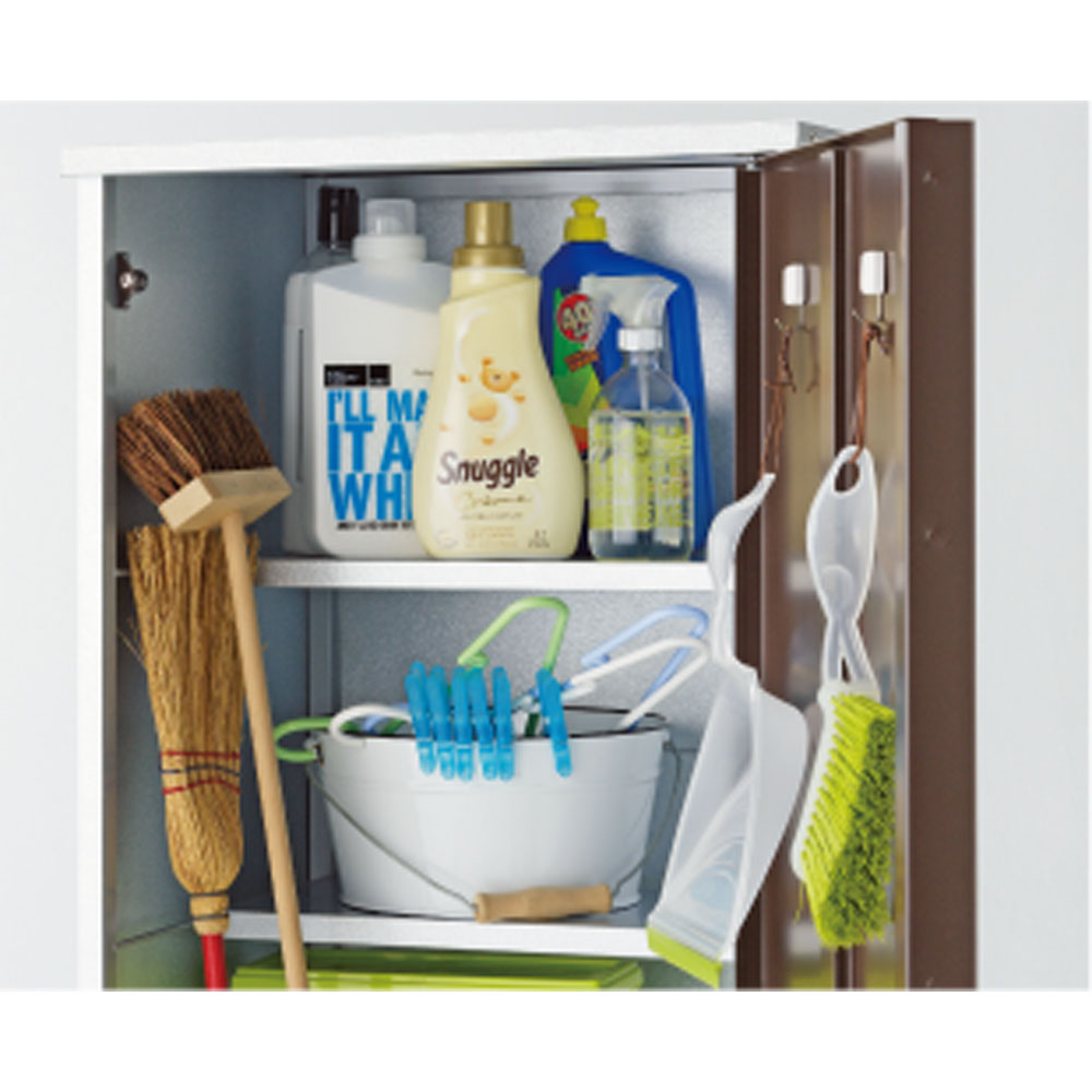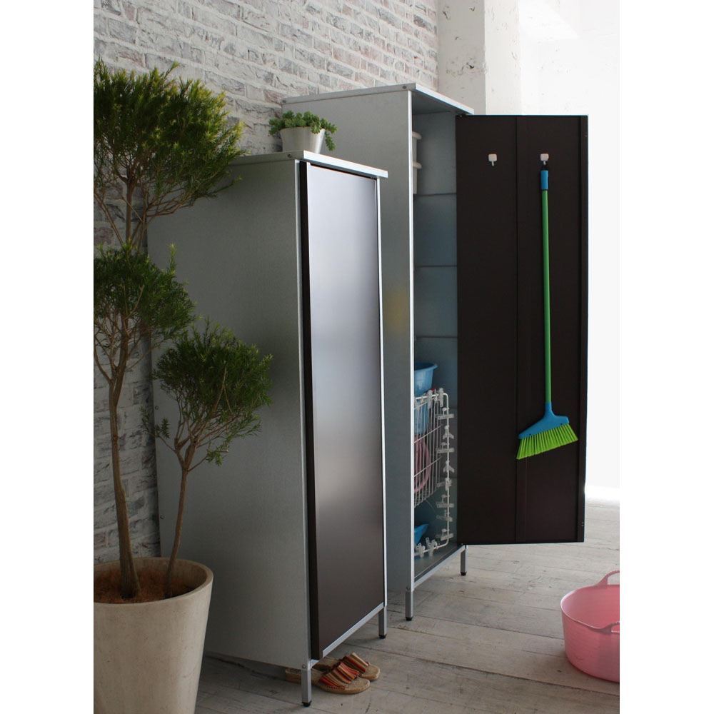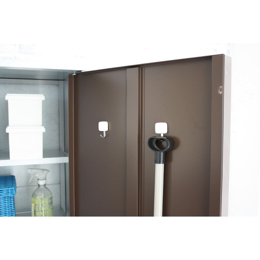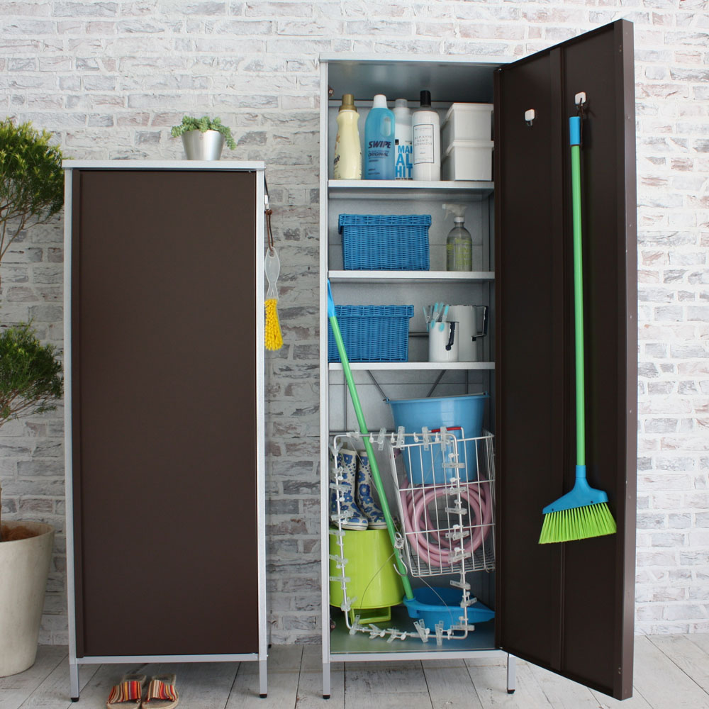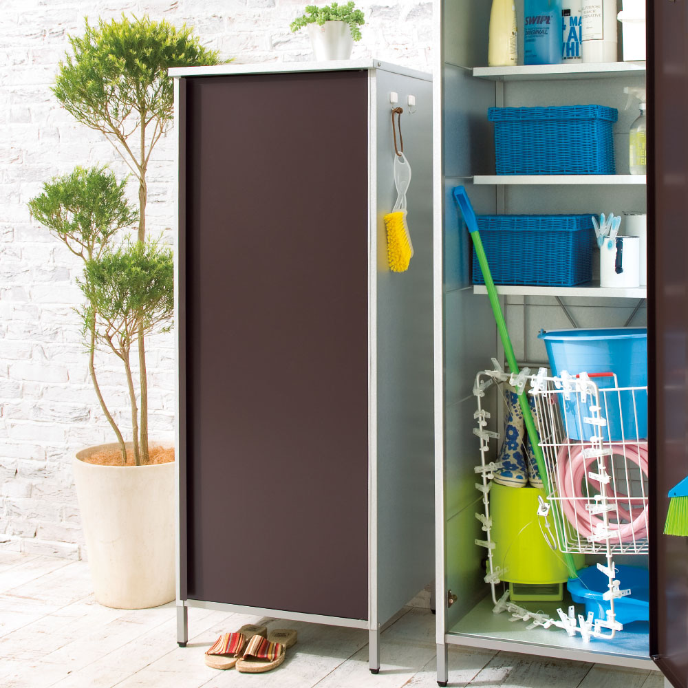 外壁にマッチするモダンなデザインの頑丈収納庫。丈夫なガルバリウム鋼板を使用しています。ベランダにもおすすめのスリムなデザインで掃除用品やガーデニング用品の収納に。◎外壁にマッチするモダンなデザインの収納庫◎・丈夫なガルバリウム鋼板を使用。・ベランダにもおすすめのスリムなデザイン。◎おうちの外観に素敵に溶け込むロッカー◎・家の外に置く物置は、意外とお隣から見えるものです。ここはひとつこだわりの品を。・お庭からベランダまで素敵に溶け込むロッカーです。モダンデザインの物置で、ゆとりの収納プランを。・物置の扉はダークブラウンとホワイトの2色をご用意。お庭のテイストに合わせてお選びください。◎収納力もしっかり◎・ポリタンクも収納できる、頼れる収納力も自慢です。・棚板は奥行きが浅めのつくり。棚板と扉の間にスペースがあるので、長い柄のものを収納することができます。・作業に必要なツールのほか、日用品のストックもすっきり収まる。定位置を決めれば探す手間が省け、作業効率がアップ!◎扉の開く向きを選べる◎・扉は左右開きどちらでも組み立て可。・限られたスペースでも使いやすい工夫のひとつです。◎タフな素材を使用◎・風雨にさらされる天板・側面には丈夫なガルバリウム鋼板を使用。◎機能面も充実◎・付属のマグネットフックで効率的に収納できます。・脚部には、設置時のガタツキを抑えるアジャスター付き。・足は高めの約10cm。収納庫下にサンダルなどの履物を収納できます。庫内の湿気対策にも。◎雨水が浸入しにくいつくり◎・上部は「ひさし」構造で、雨水の浸入を防ぎます。・天板は雨が入りにくい作りにしました。◎お庭づくりを支えるエクステリア収納◎・ガーデニング雑貨やベランダ用品もたっぷり収納できます。・設置場所や条件に合わせた物置き・収納庫をチョイスして、快適なエクステリアの収納プランを。【ガルバリウム鋼板】・アルミニウムを溶融した亜鉛合金メッキで表面処理し、耐久性・耐熱性と防食作用を兼ねそなえた鋼板です。【信頼と安心の国内工場での生産品】・管理の行き届いた日本国内の工場で、加工から製造、梱包に至るまで丁寧に仕上げました。・細部の丁寧な仕上がり、国産品ならではの品質は自信を持っておすすめします。※完全防水仕様ではございません。隙間から雨水が入る場合もあります。軒下や屋根のある場所でのご使用をお勧めしています。