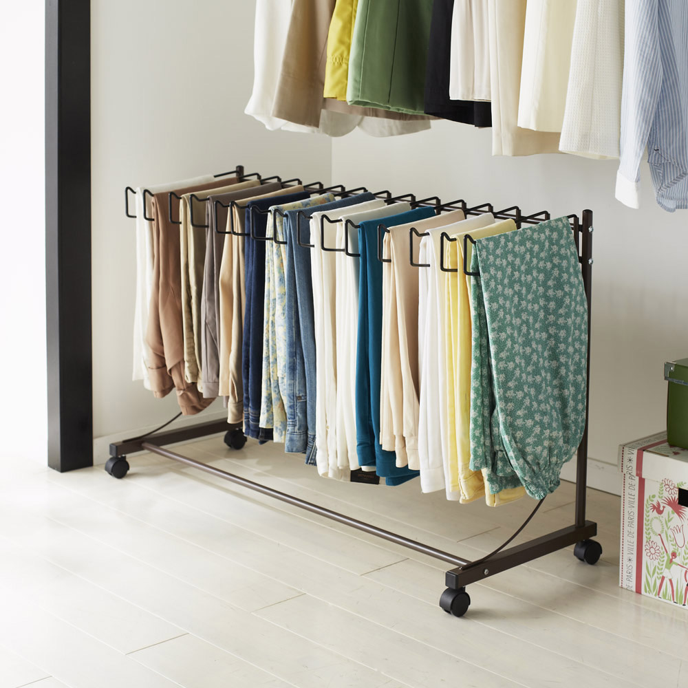 クローゼット下を有効活用して収納ができるパンツ専用ハンガーラックです。厚手のデニムでもしっかり掛けられる強度と滑り落ちにくい形状が特徴です。ハンガー部は左右に開くので取り出しやすいのも嬉しいポイント。キャスター付きで動かせるからクローゼットや押入れ収納としてもお使いいただけます。使用例:ホワイト 15本掛け 幅105cm(お届け商品)パンツを綺麗に収納できる専用ハンガーラック引き出しのパンツが見つからない、たたんでシワだらけ…。そんな悩みを解決する、パンツ専用ハンガーラックです。パンツを掛けて収納できるので、いつも綺麗な状態で保管できます。コンパクトなのに、厚手のデニムもしっかり掛けられる強度もある、ディノスのロングセラー商品です。左上段:ホワイト 6本掛け 幅52cm、右上段:ダークブラウン 10本掛け 幅75cm、下段:ダークブラウン 15本掛け 幅105cm設置場所に合わせて選べるサイズパンツ専用ハンガーは、1段、上下2段の2種類ご用意しました。1段ハンガーは6本掛け、10本掛け、15本掛けの3サイズからお選びいただけます。6本掛け:幅52 奥行41 高さ67.5cm10本掛け:幅75 奥行41 高さ67.5cm15本掛け:幅105 奥行41 高さ67.5cm上下2段ハンガーは12本掛け、20本掛けの2サイズからお選びいただけます。12本掛け:幅51 奥行41 高さ85.5〜124.5cm20本掛け:幅74 奥行41 高さ85.5〜124.5cm使用例:ダークブラウン 15本掛け 幅105cm(お届け商品)洋服選びがもっと楽しくなるひと目でパンツを確認できるので、普段の洋服選びが効率良くなります。コーディネートしやすくなり、おしゃれをもっと楽しめます。使用例:ホワイト 6本掛け 幅52cm薄型タイプで、押入れやクローゼットのすき間にも最適奥行41cmの薄型タイプなので、ちょっとしたすき間でもコンパクトに収まります。縦向きでも使えます。クローゼットのデッドスペースや、押入れ下段のすき間にもおすすめです。使用例:ホワイト 15本掛け 幅105cm左右に広がるハンガーで、ゆったり収納できます左右に1本ずつ開くハンガーで、パンツ類が取り出しやすく掛けやすいのがポイント。ハンガーの間隔を広く取っており、厚手のデニムを掛けてもゆとりがあります。パンツがズレ落ちにくい設計ハンガーの端は、山型に上がった形状が特徴。パンツがズレ落ちにくい、こだわりの設計です。パンツを1本ずつ取り出せますハンガーは1本ずつ取り外し可能!洋服の整理も簡単です。ハンガー背面キャスター付きで移動もスムーズキャスター付きなので、押入れやクローゼットの奥から引き出す時や、掃除の時も移動がスムーズです。左:ホワイト、右:ダークブラウン 15本掛け 幅105cm(お届け商品)選べる2つのカラー爽やかな印象でインテリアの邪魔をしないホワイト、落ち着いた印象のダークブラウンからお選びいただけます。安心の国内製造品です。