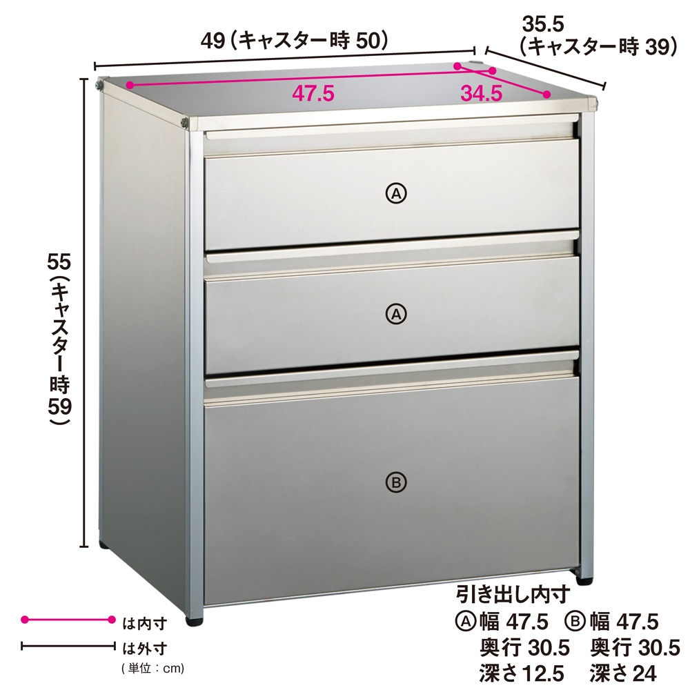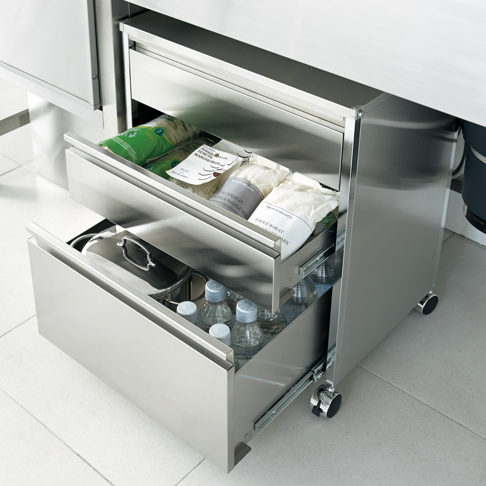 シンク下の空きスペースをゴミ箱やキッチン収納として有効活用できます。システムキッチンにも馴染む高級感あるデザインも魅力。キャスターとアジャスターの2WAY仕様です。水はねや汚れに強いステンレス製の引出収納のワイドタイプシンク下にぴったりと収まり、空きスペースを有効活用できます。ヘアライン風のマットな仕上がりのステンレスはクールな印象。シンク横に置けば、天板を作業台としても使えます。脚部はアジャスターとキャスターの2WAY仕様。アジャスターは床のガタツキにあわせて無段階で調節でき、移動がラクなキャスターはストッパー付きで固定もできます。ステンレスの特徴について■耐久性・・・ステンレス鋼は非常に耐久性が高く、錆びにくい材料です。これにより、長期間にわたって使用できるため、特に湿気の多い環境や頻繁に使用する場所に適しています。■お手入れが簡単・・・ステンレスは表面が滑らかで、汚れが付着しにくく、また簡単に拭き取ることができます。これにより、清掃が非常に楽になります。■洗練されたデザイン性・・・ステンレスのシルバーの光沢は、現代的でクリーンな印象を与えます。どんなインテリアにも合わせやすく、スタイリッシュなデザインが特徴です。