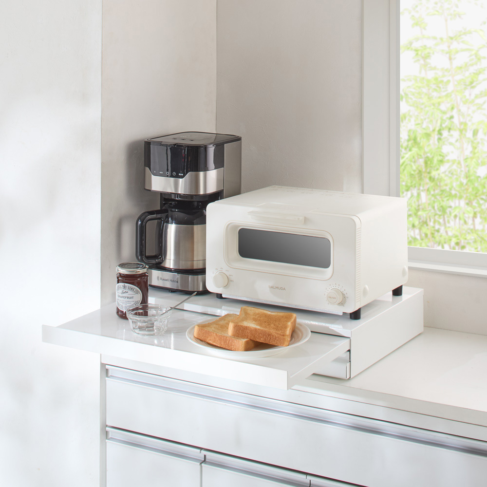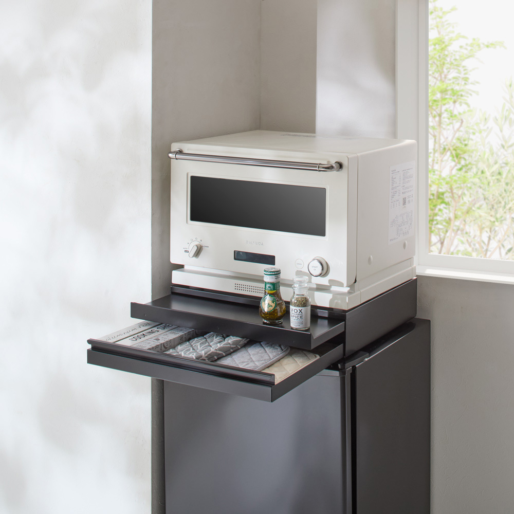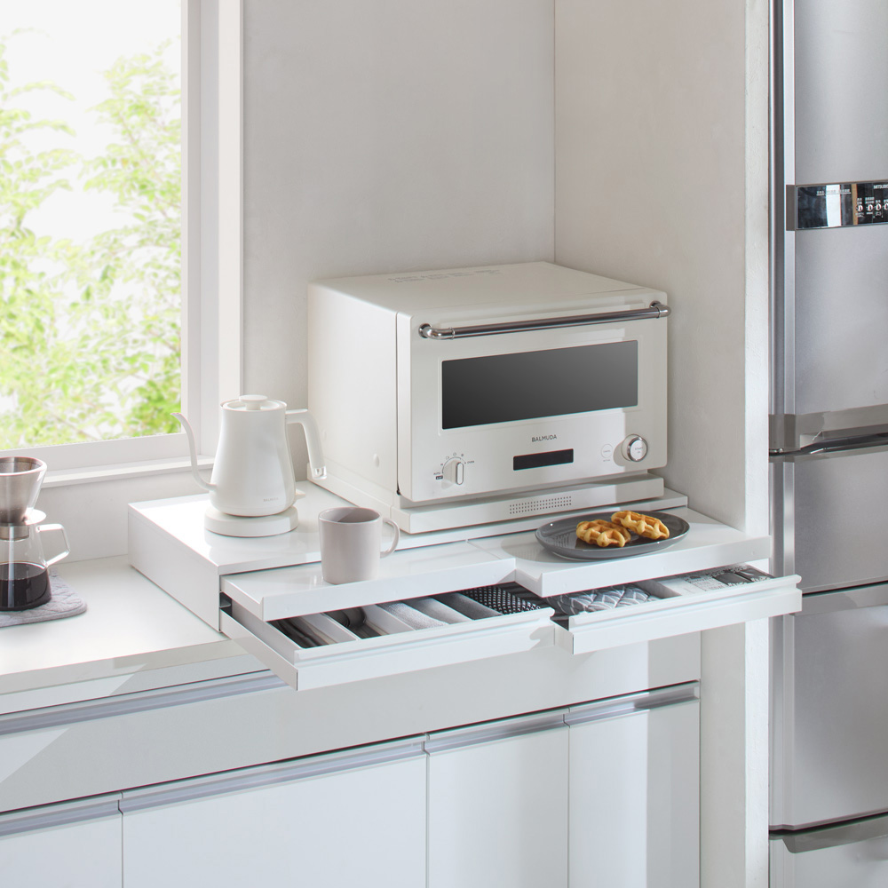 本商品は「家電周りでの調理をサポートするレンジ下スライドテーブル 引き出し付き 幅80高さ10cm」です。シリーズ累計 47000台(※2015年7月〜2025年6月ディノスでのシリーズ累計出荷数)突破の大ヒット!レンジや家電周りに「ひろびろ作業スペース」を作って家事効率アップ!レンジや家電の下に置くだけで、必要な時だけ引き出せる便利な調理スペースに。レンジ周りでの調理がスムーズに進んで家事効率がアップするレンジ置き台。ラップやミトンなど小物を収納できる引き出し付き。レンジや家電周りに「ひろびろ作業スペース」を作って家事効率アップ!◆電子レンジや炊飯器の下に設置すれば必要な時に便利なちょっと置きスペースがつくれます。◆普段は中に収めておいて、必要な時だけ引き出せるのでとっても省スペース。◆レンジ調理の時やご飯をよそう時にあると便利な作業台です。◆さらにスライドテーブルの下には小物を収納できる便利な引き出し2杯付き。◆引き出しの内寸高さ約5cmでラップやミトン、カトラリー類を収納可能です。◆天板耐荷重は約30kgで、オーブンレンジの下にも設置可能。※ご購入の前にお手持ちのレンジなどの重量をご確認ください。※天板に物を乗せる際は荷重がなるべく均等になるよう乗せてください。※左右それぞれ耐荷重は15kgまでです。◆スライドテーブルは約26.5cm前方へ出て、一時置きスペースが現れます。耐荷重は約3kgです。◆素材はメラミン塗装を施したスチール製で耐汚性・耐熱性を高めています。◆レンジなど調理家電周りは調味料や食品類の汚れがつきやすい場所です。◆さっとふき取るだけの楽々お手入れできるレンジ置きラックです。「買ってよかった!」ご購入のお客様の喜びの声が届いています◆キッチンのスペース確保のために購入しましたが、収納スペースがとても使いやすくラップやホイルなどを収納していますが、動線が良く調理しやすくなりました本当に買って良かったです。神奈川県◆スチールラックの引き出し代わりに置いてオーブンレンジと炊飯器をのせています。かなり重みがあって安定感は抜群!引き出しはラップがギリギリでそれより高さがあるものは入りませんが、片方だけで8本も入るので買い置きも安心。スライド台も広くて使いやすいです。神奈川県◆まとめ買いキャンペーンの設定金額に届かせるために、ついでに買った商品ですが、大正解でした!シンクとガス台の間はまな板を置いたら、いっぱいいっぱいのコンパクトなキッチンなので、こちらがあることで、ちょい置きができて調理が物凄く捗ってます!ただ引っ張り出すときに勢い?角度?によっては、金属同士が擦れる音がするので、少し気になりますが、個人的に利便性がはるかに上回ったので星5にしました。神奈川県※シリーズ商品に寄せられたコメントです。〜信頼と安心の国内工場での生産品です〜◆国内の職人がひとつずつ丁寧に仕上げた逸品です。◆細部の丁寧な仕上がりなど、国産品ならではの高品質をお楽しみください。◆キッチンの限られたスペースを無駄なく使いたいあなたにお勧めのキッチン収納です。◆お引越しやリフォーム、模様替えのタイミングでスペースを便利に有効活用してみませんか?◆高価な備え付け家具やリフォームよりも、リーズナブルに新生活を始められます。◆是非普段使うものこそ、大好きなものをじっくりとご検討下さい。〜わずかなすき間にもこだわって、さらにグレードアップ〜◆お客様のご要望にお応えして、細部の仕様を見直しました。◆滑らかな動きや閉じた時の納まりの良さで精巧な造りがわかります。◆燕三条と同じく、金属加工製品で知られる新潟県央エリアにある「足立製作所」との共同開発製品です。◆「ものづくり」にこだわる新潟の熟練職人が、ひとつひとつ丁寧に仕上げた逸品です。