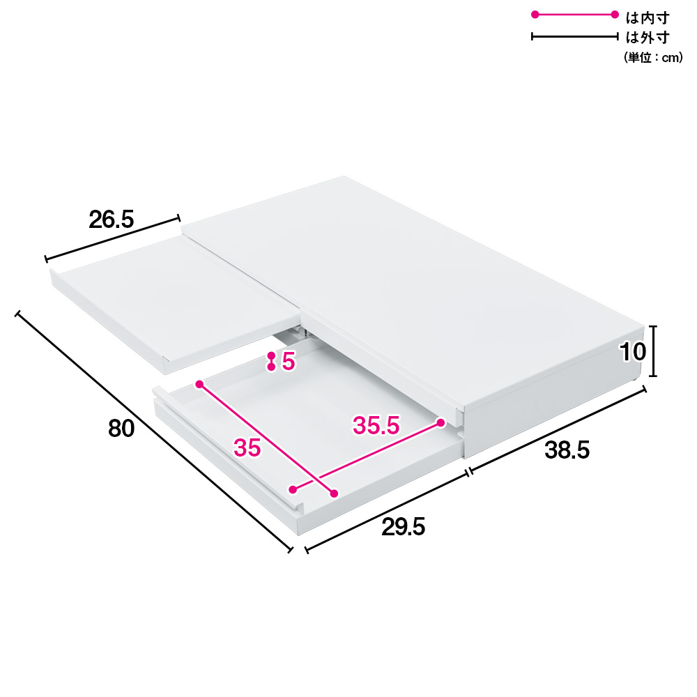 (ア)ホワイト(単位:cm) スライドテーブル部の耐荷重は約3kg。約26.5cm前方に出ます。ラップやミトンなどレンジ周りの小物を収納できる内寸高さ約5cmの引き出し付き。
