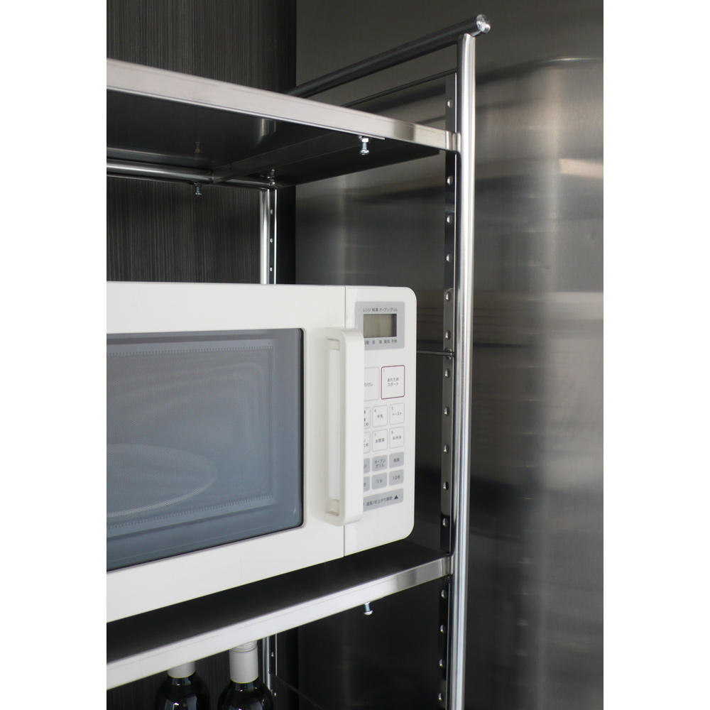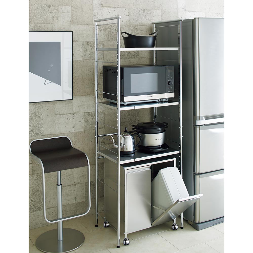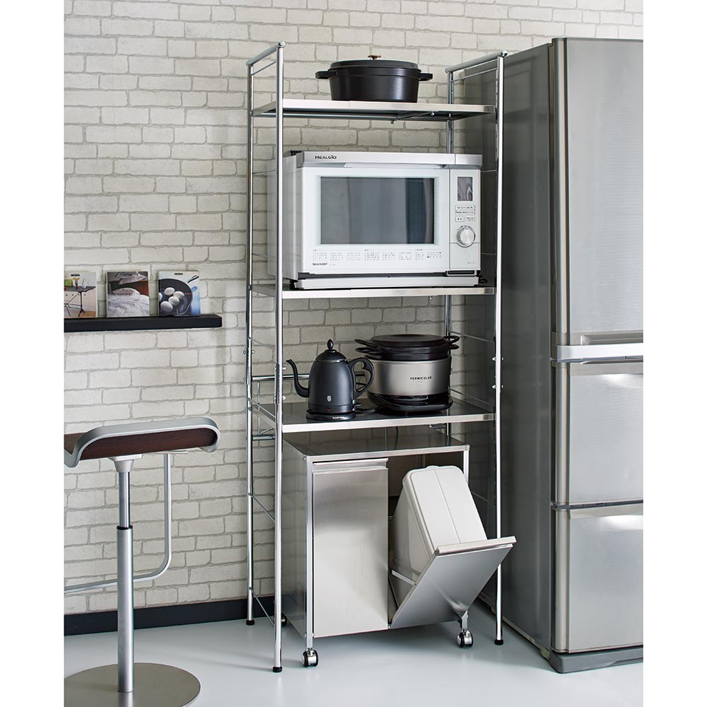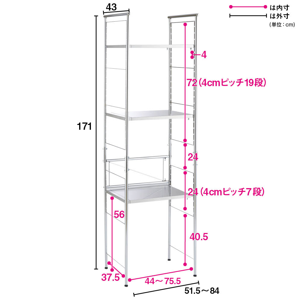 ごみ箱や小型冷蔵庫上のスペースを無駄なく活用できるキッチンラック。幅51.5cm〜84cmの間で伸縮し、棚も可動できるからレイアウトは自在。棚はお手入れしやすいステンレス仕様で家電レンジラックとして清潔にお使いいただけます。ダストボックス上のスペースを無駄なく活用できるラック。幅51.5cm〜84cmの間で伸縮し、棚も移動するからレイアウトは自在。お手入れしやすいステンレス棚仕様も魅力です。棚は4cm間隔で収納物に合わせて高さ調節可能です。棚板を最下部にセットした時の床から棚下までの高さは40.5cm。ごみ箱やキッチンカウンター上にキッチンラックとして設置できます。物を置いても横揺れしないよう背面には補強バーが入った仕様です。1枚あたり棚板耐荷重約13kgでキッチン家電を置ける強度仕様です。
