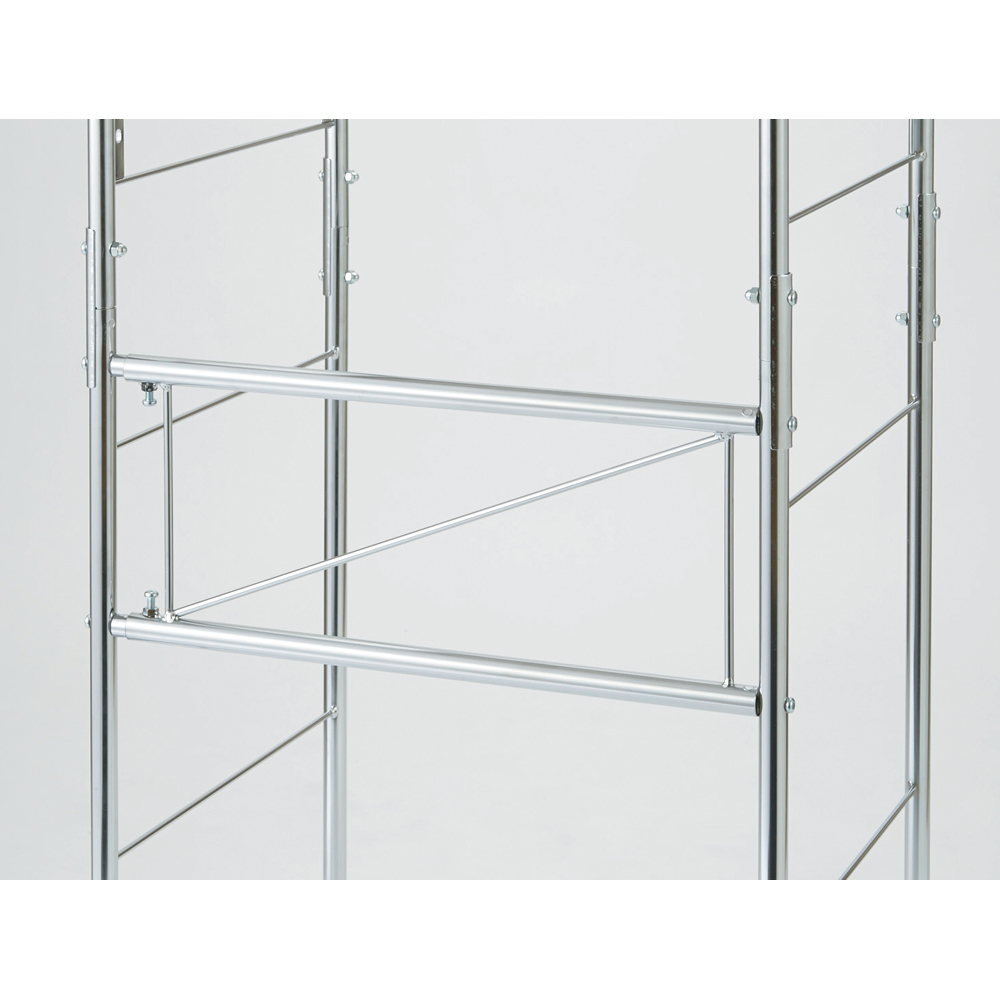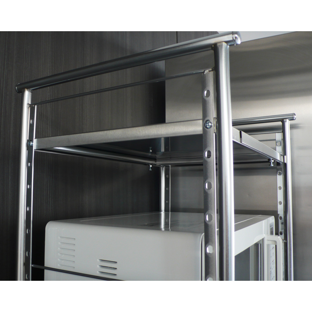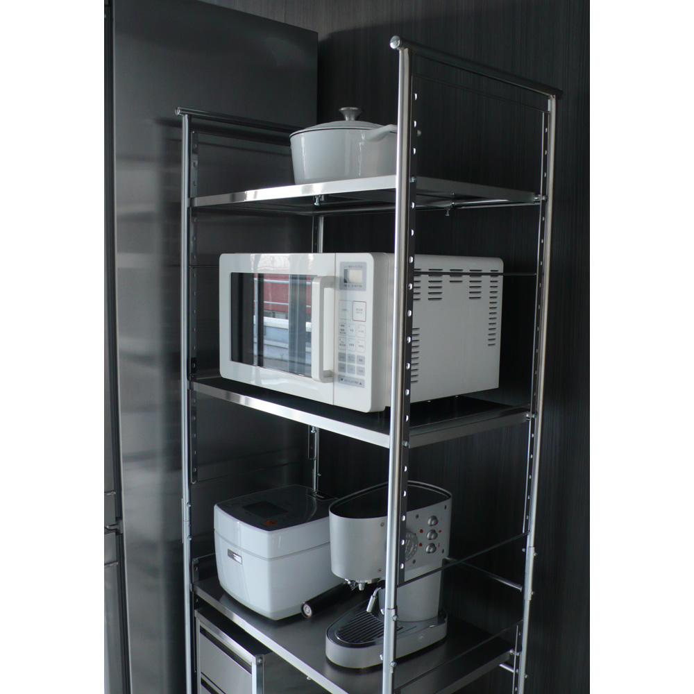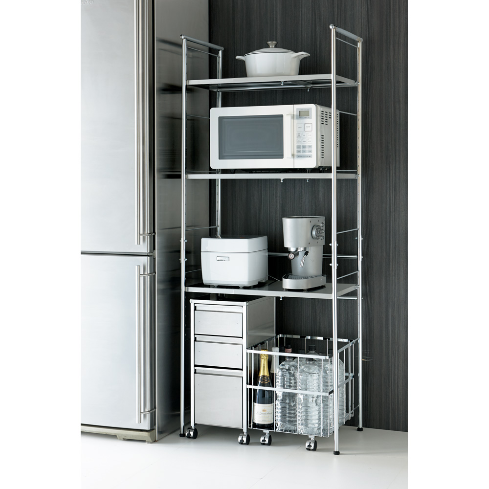 ごみ箱や小型冷蔵庫上のスペースを無駄なく活用できるキッチンラック。幅51.5cm〜84cmの間で伸縮し、棚も可動できるからレイアウトは自在。棚はお手入れしやすいステンレス仕様で家電レンジラックとして清潔にお使いいただけます。ダストボックス上のスペースを無駄なく活用できるラック。幅51.5cm〜84cmの間で伸縮し、棚も移動するからレイアウトは自在。お手入れしやすいステンレス棚仕様も魅力です。棚は4cm間隔で収納物に合わせて高さ調節可能です。棚板を最下部にセットした時の床から棚下までの高さは40.5cm。ごみ箱やキッチンカウンター上にキッチンラックとして設置できます。物を置いても横揺れしないよう背面には補強バーが入った仕様です。1枚あたり棚板耐荷重約13kgでキッチン家電を置ける強度仕様です。