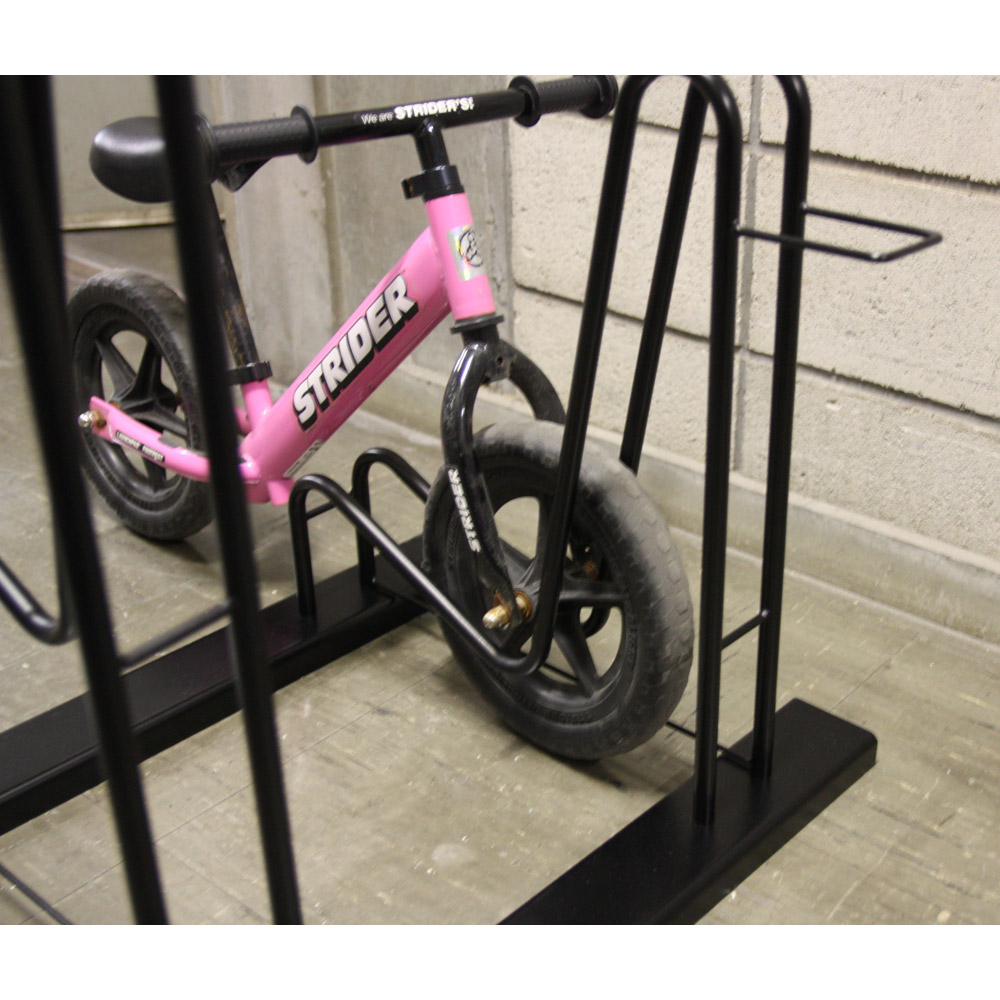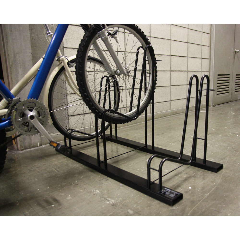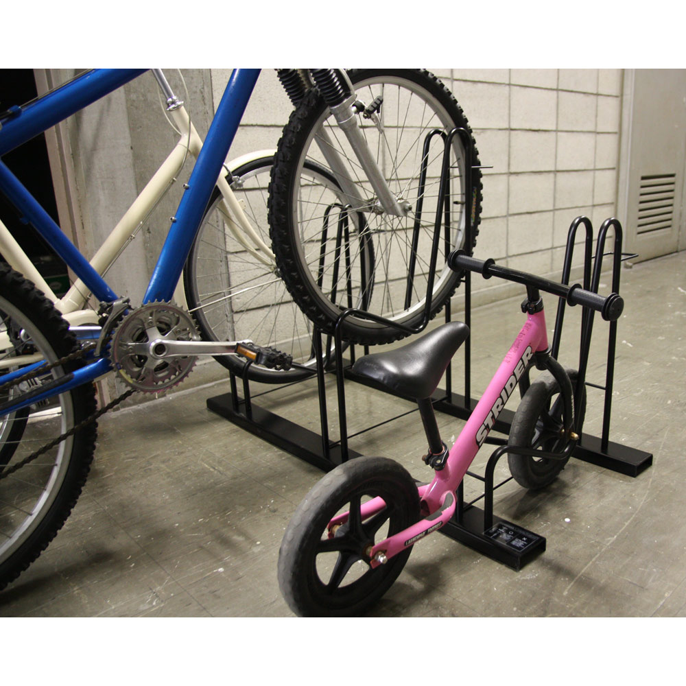 シンプルでスタイリッシュ、省スペース。3点ホールドでしっかり安定。公共の駐輪スペースにあるような本格仕様で、しかも3点で支えるので自転車が左右にフラつきません。2台用タイプ・3台用タイプは高低差のあるつくりで、2台・3台の自転車を省スペースで保管できます。