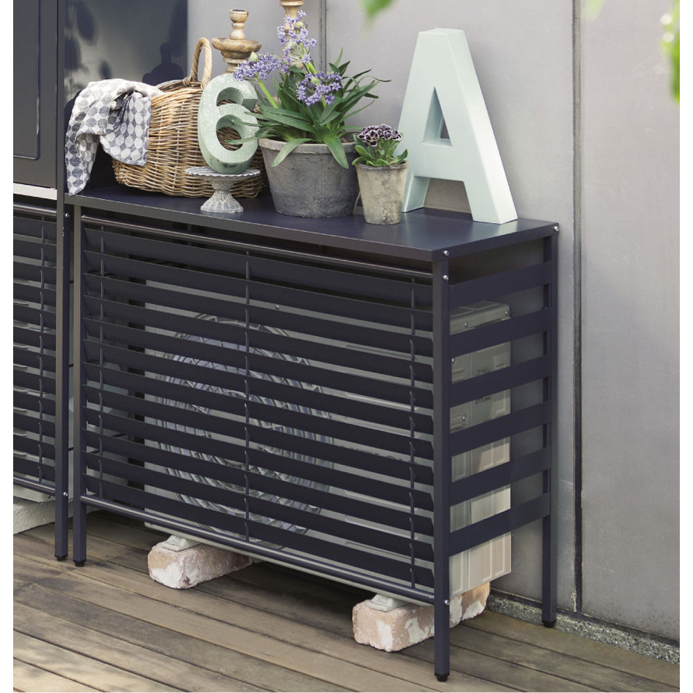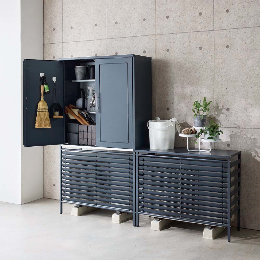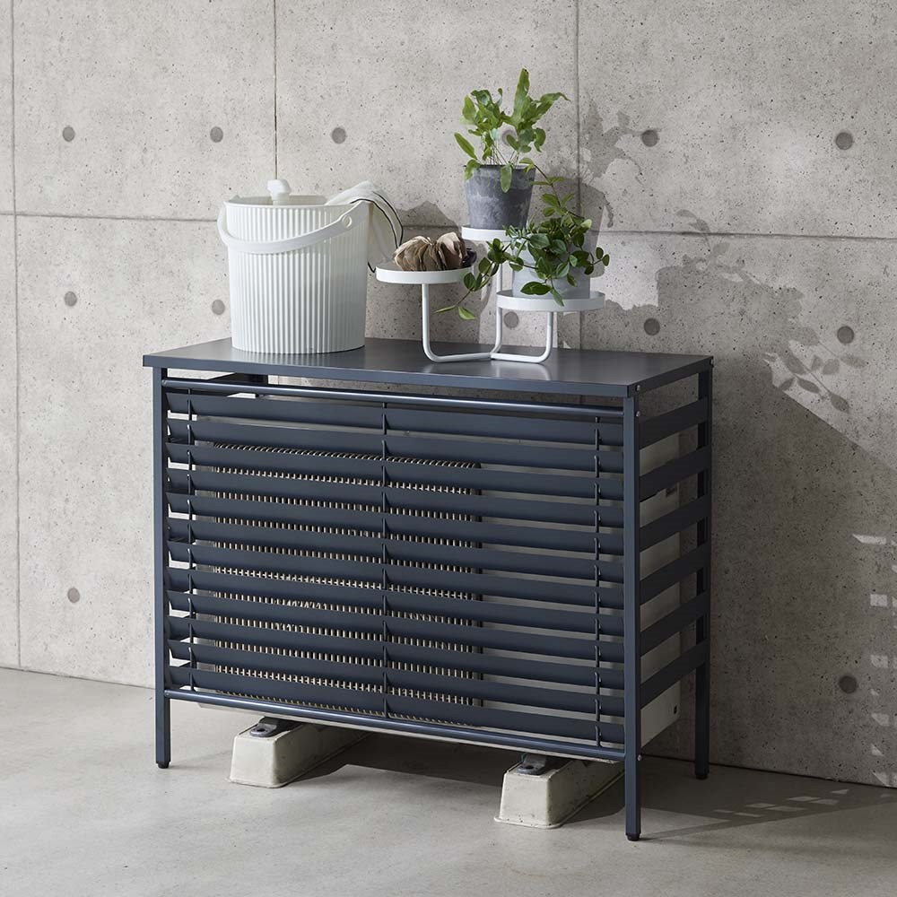 ※スチール製品は素材の特性上、経年変化でサビが発生致します。長くお使い頂くために、お届け直後の錆止め材の塗布をお薦めしております。 また、ご使用開始後も定期的なお手入れをお薦めします。(お手入れ方法&取り付け方法)庭の雰囲気を高めるために見せたくない室外機を目隠し。逆ルーバーが風を上に逃がすので植物にも◎。◎引き締め役にぴったりのダークグレー◎・英国園芸研究家の吉谷桂子さんおすすめのカラー。・ヨーロッパの街並みで古くから用いられている伝統的な色。◎お庭に興ざめなエアコンの室外機、モダンに隠します◎・おうちの裏手でもご近所からは見られてしまう、やっかいなエアコン室外機。・室外機まわりにもこだわりたい方に、おすすめのアイテムです。◎エクステリアに溶け込むデザイン◎・せっかく作り込んだお庭の中で、エアコン室外機の存在が浮いていませんか?・モダンデザインのアイアン製エアコン室外機カバーなら、建物の外壁やガーデンにもしっくりなじみます。・別売のサイドパネルの使用で、よりスッキリした外観になります。◎機能的な逆ルーバー構造◎・正面の逆ルーバーは、エアコン室外機からの熱風を上方に逃がします。・ベランダへ熱がこもるのを防ぐだけでなく、植物を守る効果も。・逆ルーバーは、通常ルーバー(下向き)にも組立が可能です。◎室外機カバー上部の空間を有効活用◎・カバー上部には天板付き。室外機を隠しながら、室外機カバー上部のデッドスペースを有効活用できます。・ちょっとした飾り棚として、また簡単な作業台としても重宝します。・【天板耐荷重約10kg】◎耐候性や耐腐食性に優れた素材を使用◎・サビに強いガルバリウム鋼板とボンデ鋼板を使用しました。◎脚部にはアジャスター付き◎・設置時のガタツキを抑えるアジャスターが付いています。・設置場所に傾斜がある場合も、室外機カバーを水平に設置できます。【信頼と安心の国内工場での生産品】・管理の行き届いた日本国内の工場で、加工から製造、梱包に至るまで丁寧に仕上げました。・細部の丁寧な仕上がり、国産品ならではの品質は自信を持っておすすめします。【ガルバリウム鋼板】・アルミニウムを溶融した亜鉛合金メッキで表面処理し、耐久性・耐熱性と防食作用を兼ねそなえた鋼板です。