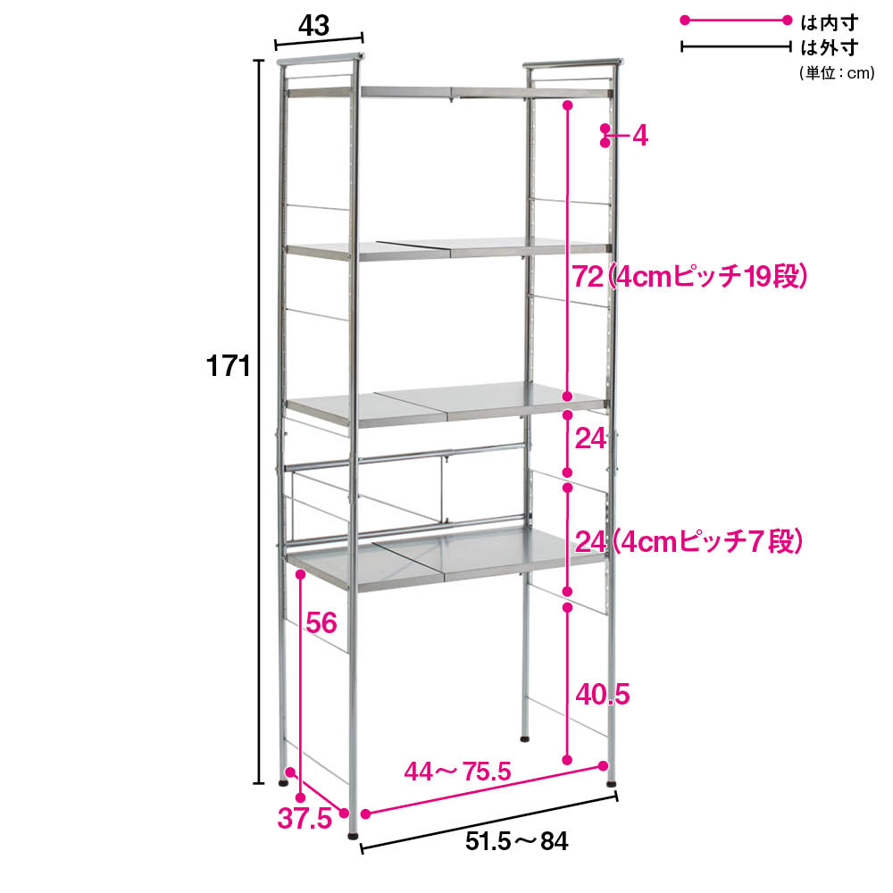 ごみ箱や小型冷蔵庫上のスペースを無駄なく活用できるキッチンラック。幅51.5cm〜84cmの間で伸縮し、棚も可動できるからレイアウトは自在。棚はお手入れしやすいステンレス仕様で家電レンジラックとして清潔にお使いいただけます。ダストボックス上のスペースを無駄なく活用できるラック。幅51.5cm〜84cmの間で伸縮し、棚も移動するからレイアウトは自在。お手入れしやすいステンレス棚仕様も魅力です。棚は4cm間隔で収納物に合わせて高さ調節可能です。棚板を最下部にセットした時の床から棚下までの高さは40.5cm。ごみ箱やキッチンカウンター上にキッチンラックとして設置できます。物を置いても横揺れしないよう背面には補強バーが入った仕様です。1枚あたり棚板耐荷重約13kgでキッチン家電を置ける強度仕様です。